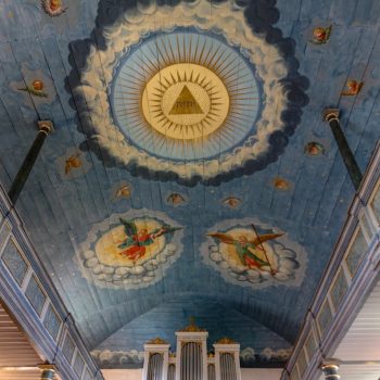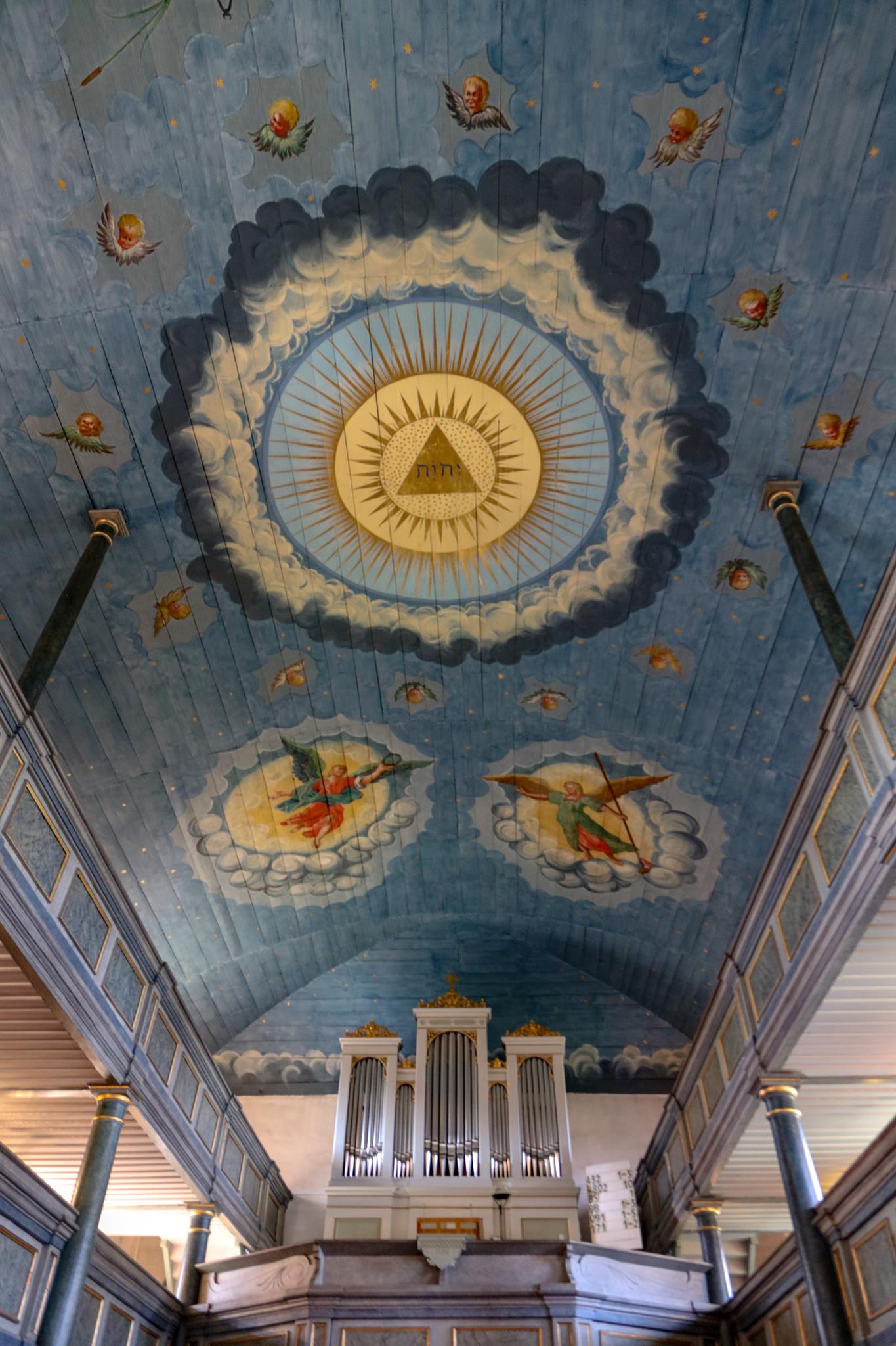 Uvnitř impozantního kostela návštěvníka ohromí modrá klenutá obloha pokrytá třpytivými hvězdami, které na valenou klenbu namaloval dvorní malíř Friedrich Müller v roce 1780. Uprostřed svítí svatozář se zlatým trojúhelníkem a Božím jménem „Jahwe“ v kruhu mraků, obklopena třinácti (!) anděly. Dva velcí a menší cherubíni v oblacích ukazují nástroje Kristova utrpení a radují se ze znamení spásy. Na stěně presbytáře se zjevuje anděl v jasném světle a předává Ježíšovi kalich v Getsemanské zahradě, zatímco učedníci spí.
