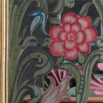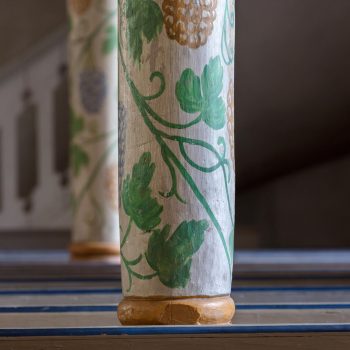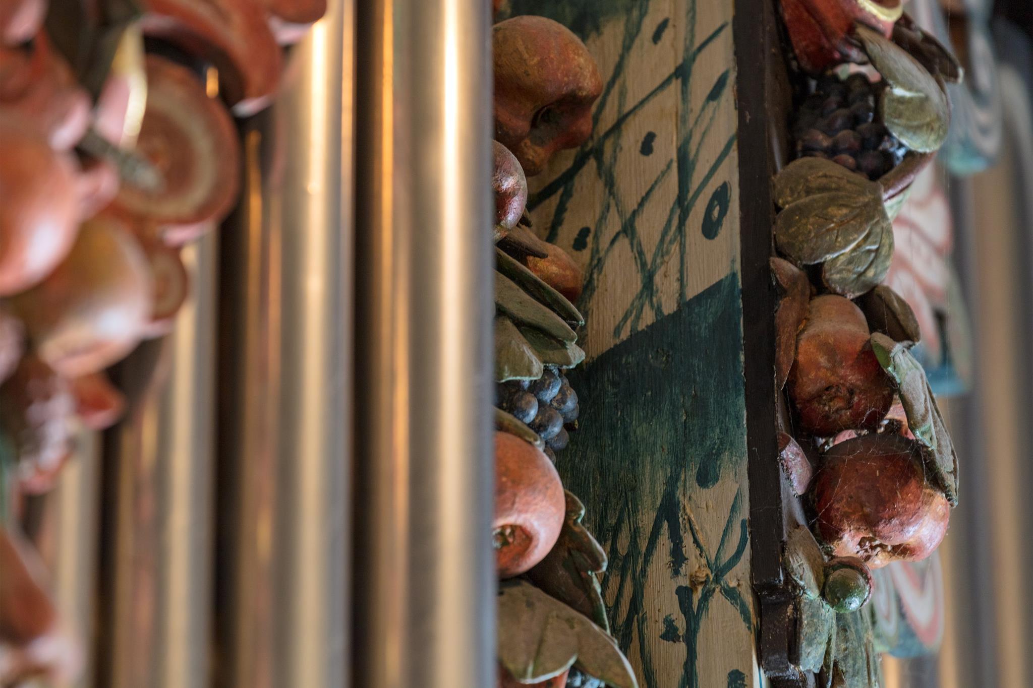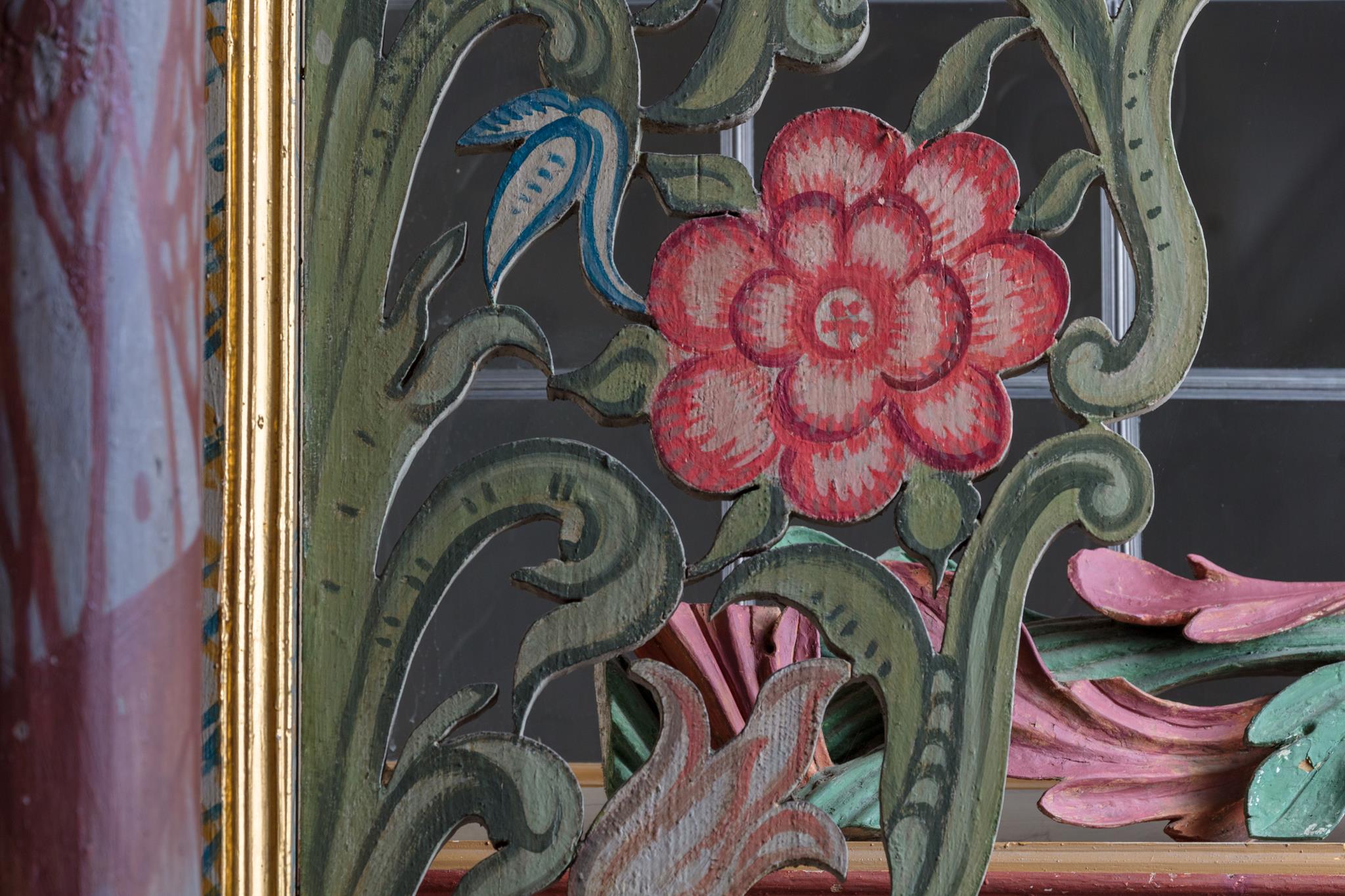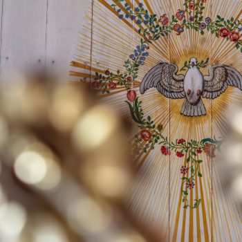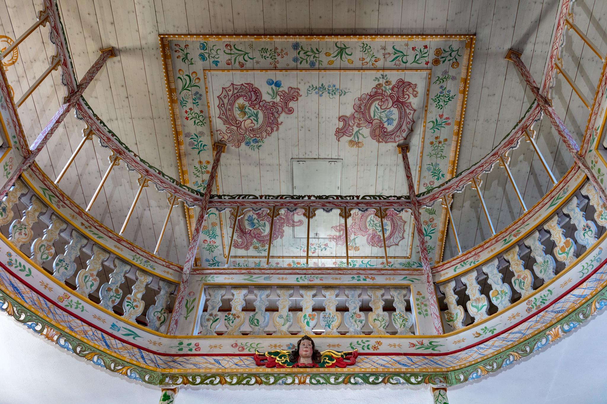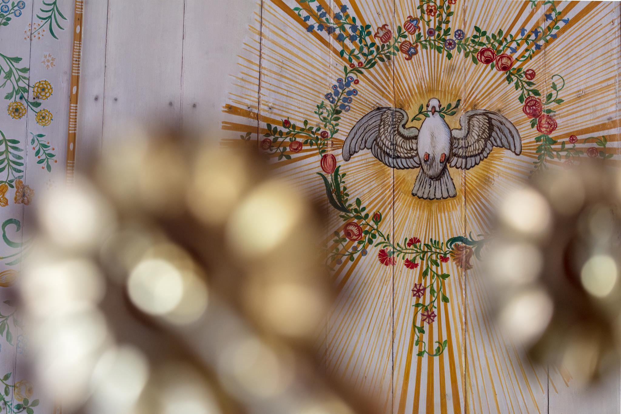 Celý kostel je uvnitř vyzdoben barevnými květinami: na sloupech, na zábradlí galerií, na nosných trámech i na stropě. Uprostřed mezi barokními ornamenty se v oválné svatozáři vznáší holubice. Není obklopena oblaky, ale květinami. V zobáku nese olivovou ratolest. Ze symbolu Ducha svatého se stává holubice míru.