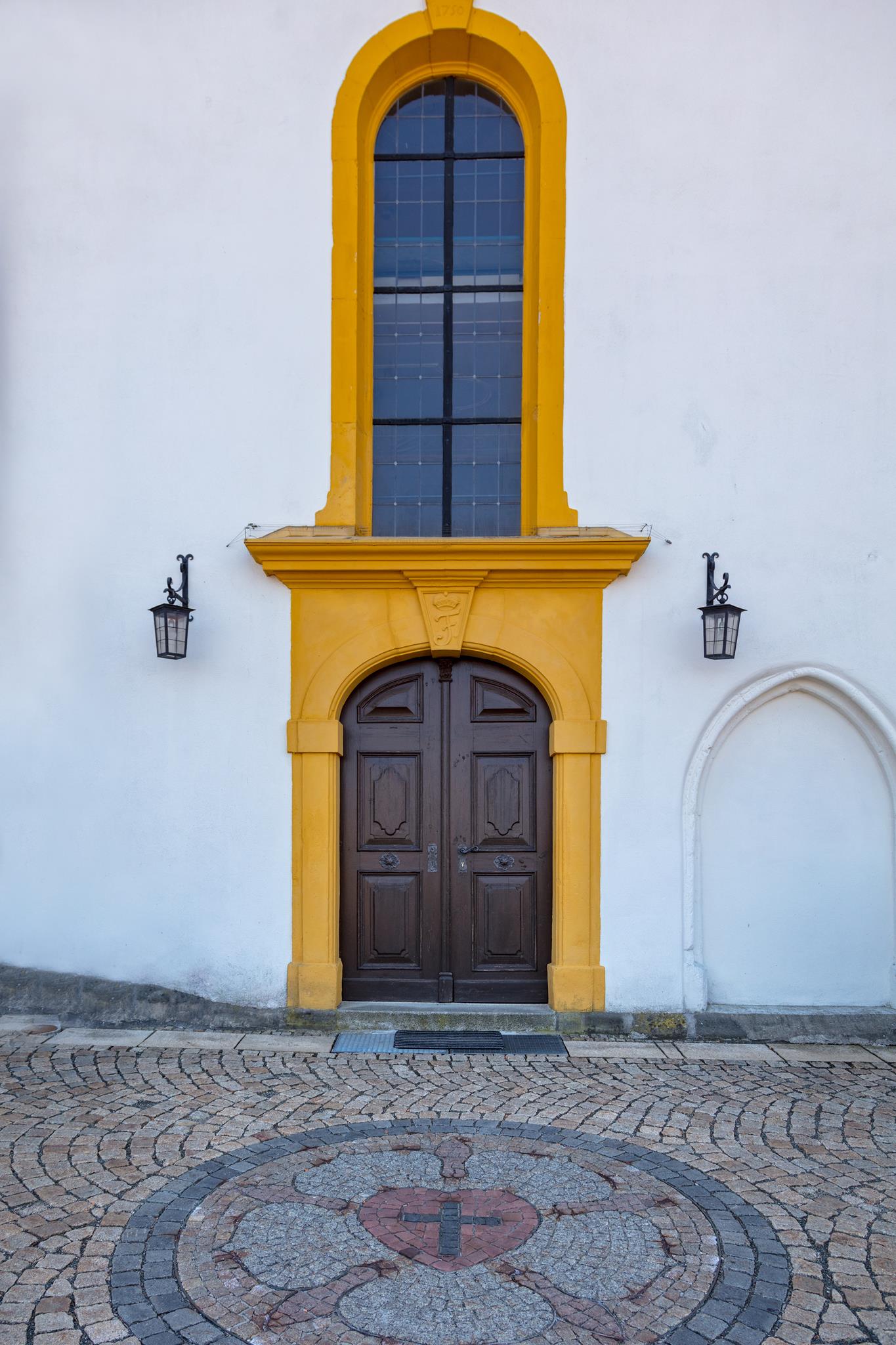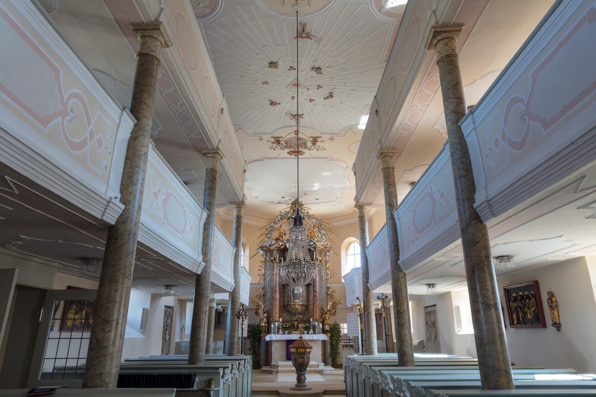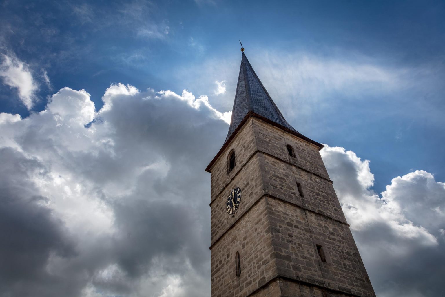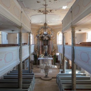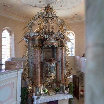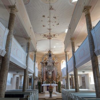 Kostel září z dálky nad údolím Bílého Mohanu. Dlouhé schodiště vede do bývalého hradního komplexu, ke kterému se lze dostat také po silnici. Poté, co panství přešlo r. 1687 od Wirsbergů na markraběte Christiana Ernsta, byl malý gotický sálový kostel přestavěn na velkolepý markrabský kostel. Jen tabule se dvanácti apoštoly na bočních stěnách, vytvořené kolem r. 1510, a několik postav svatých svědčí o vysokém stáří kostela, jehož počátky sahají daleko za první zmínku v r. 1303, možná až k prvnímu tisíciletí.