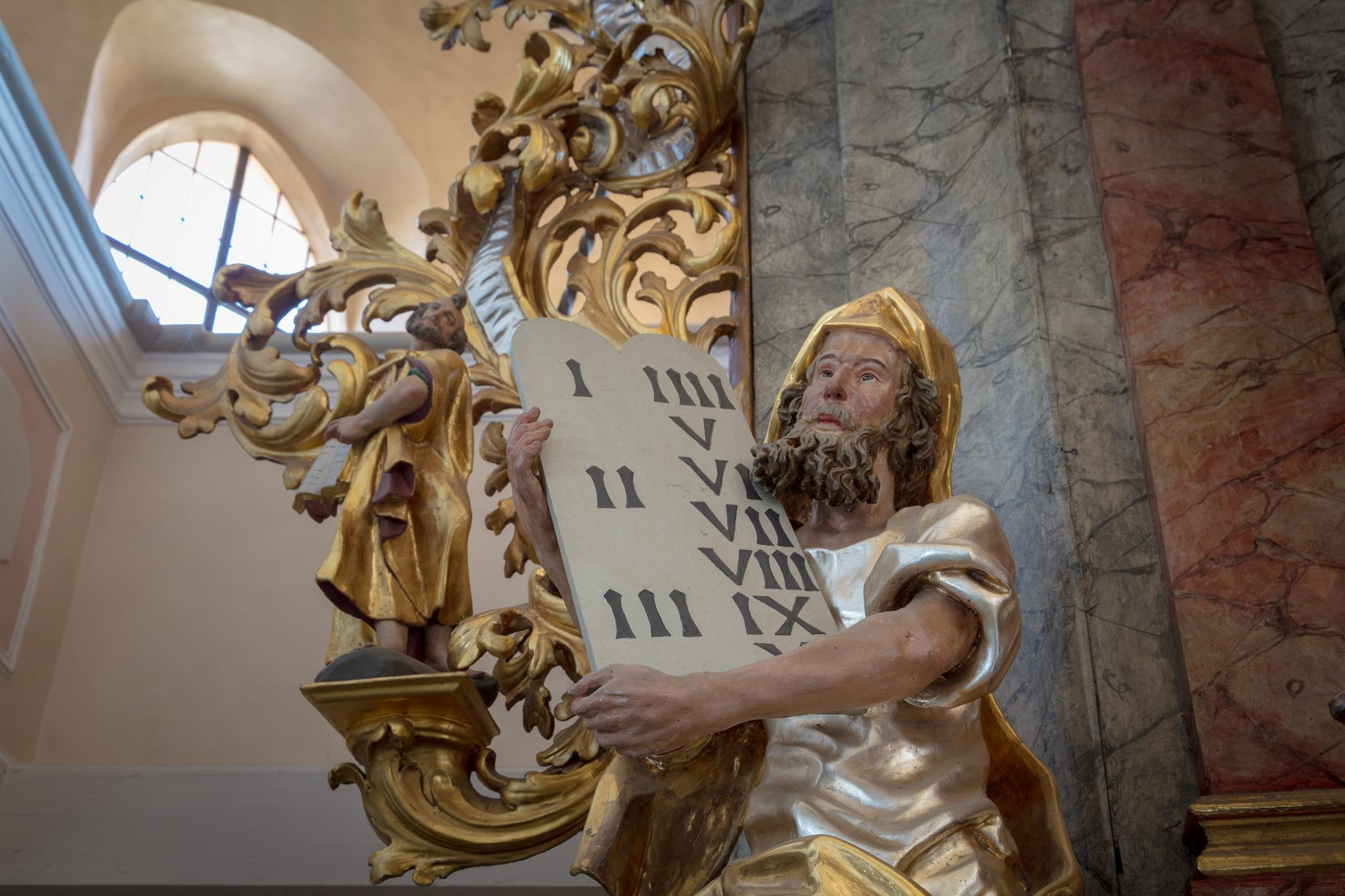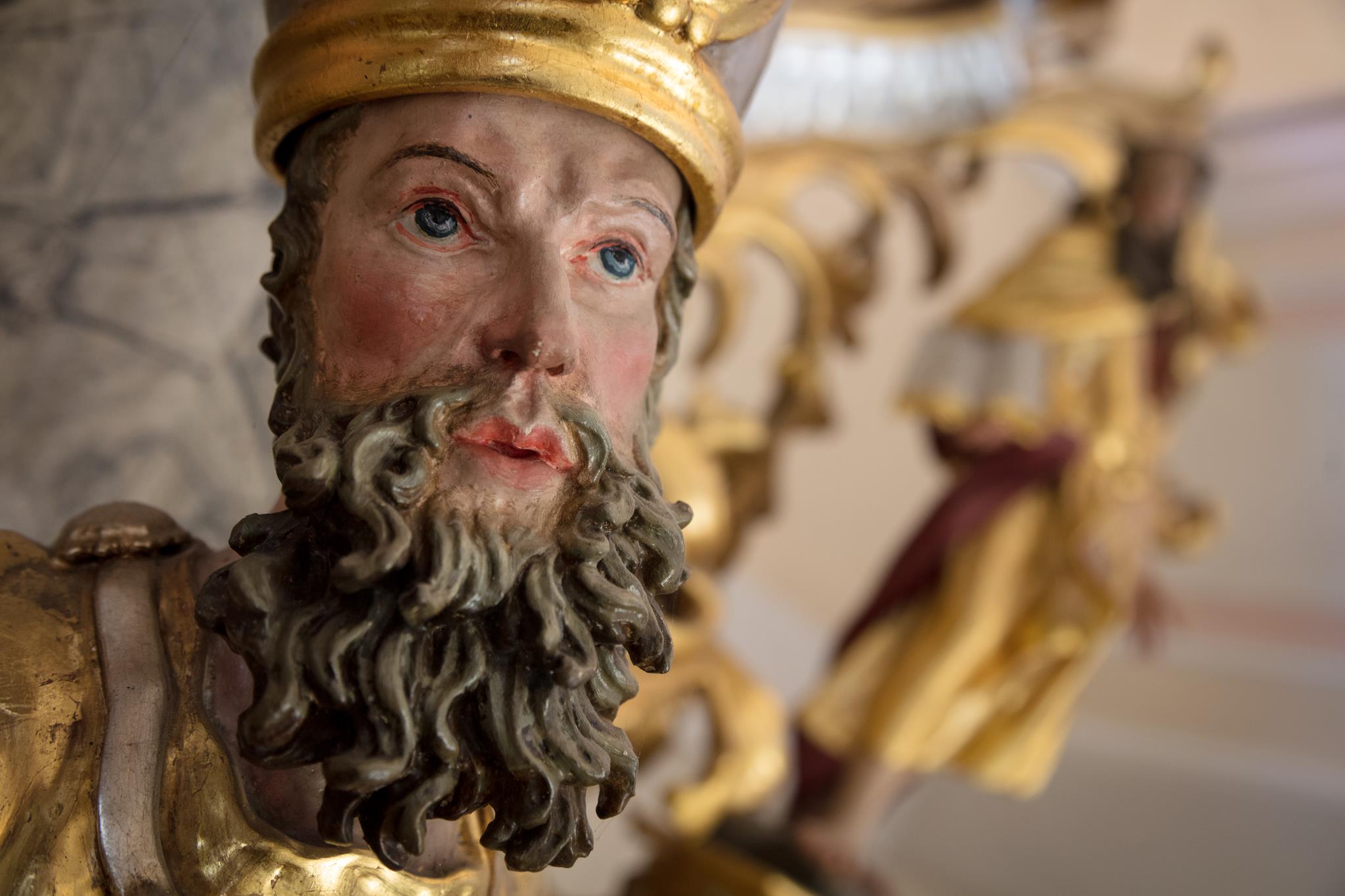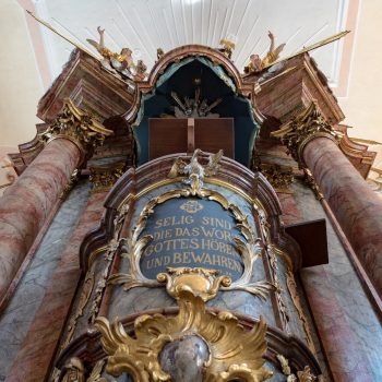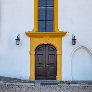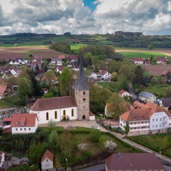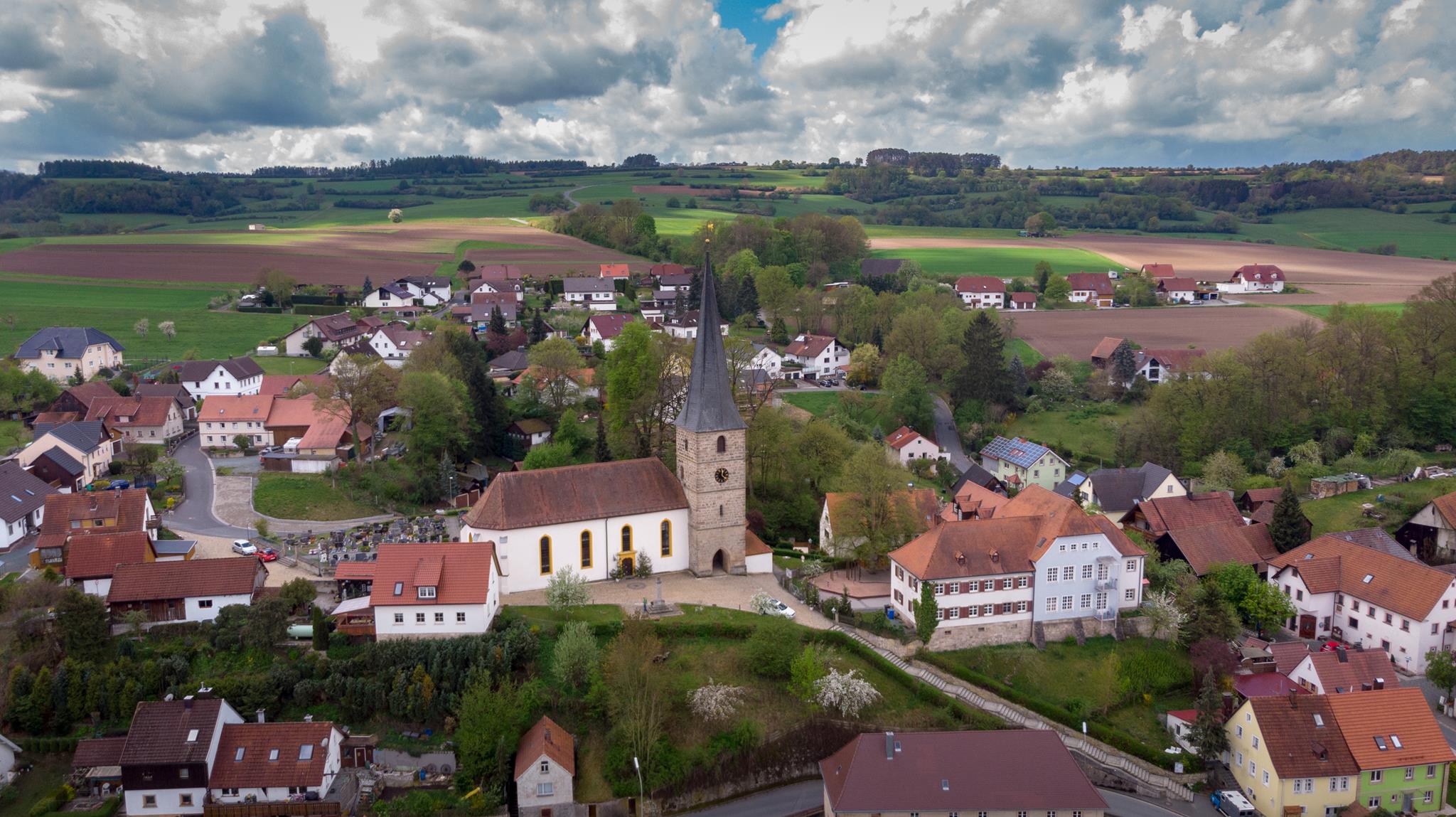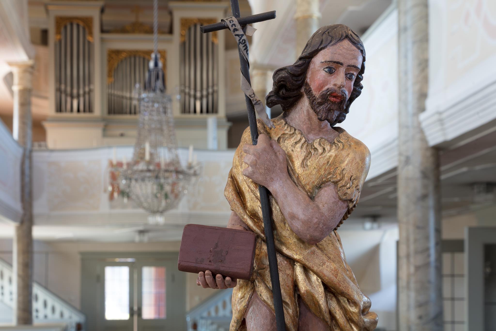 Kostel září z dálky nad údolím Bílého Mohanu. Dlouhé schodiště vede do bývalého hradního komplexu, ke kterému se lze dostat také po silnici. Poté, co panství přešlo r. 1687 od Wirsbergů na markraběte Christiana Ernsta, byl malý gotický sálový kostel přestavěn na velkolepý markrabský kostel. Jen tabule se dvanácti apoštoly na bočních stěnách, vytvořené kolem r. 1510, a několik postav svatých svědčí o vysokém stáří kostela, jehož počátky sahají daleko za první zmínku v r. 1303, možná až k prvnímu tisíciletí.