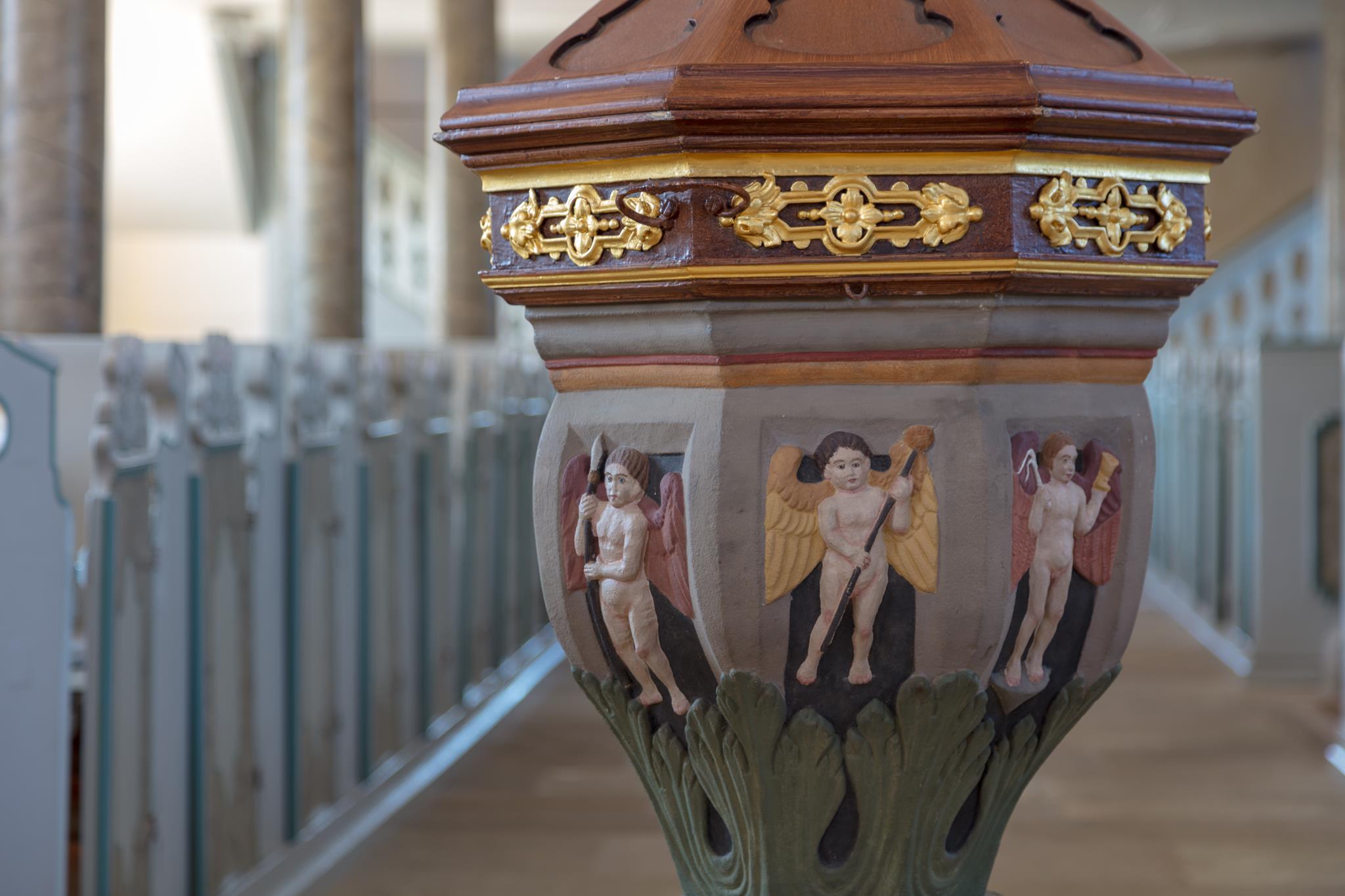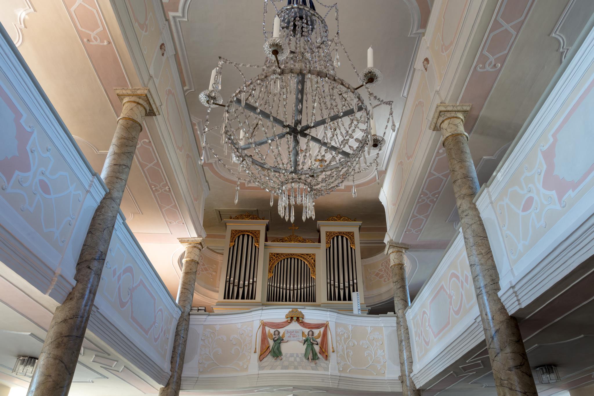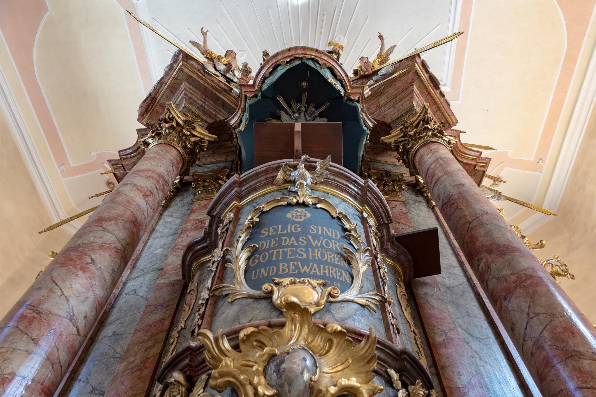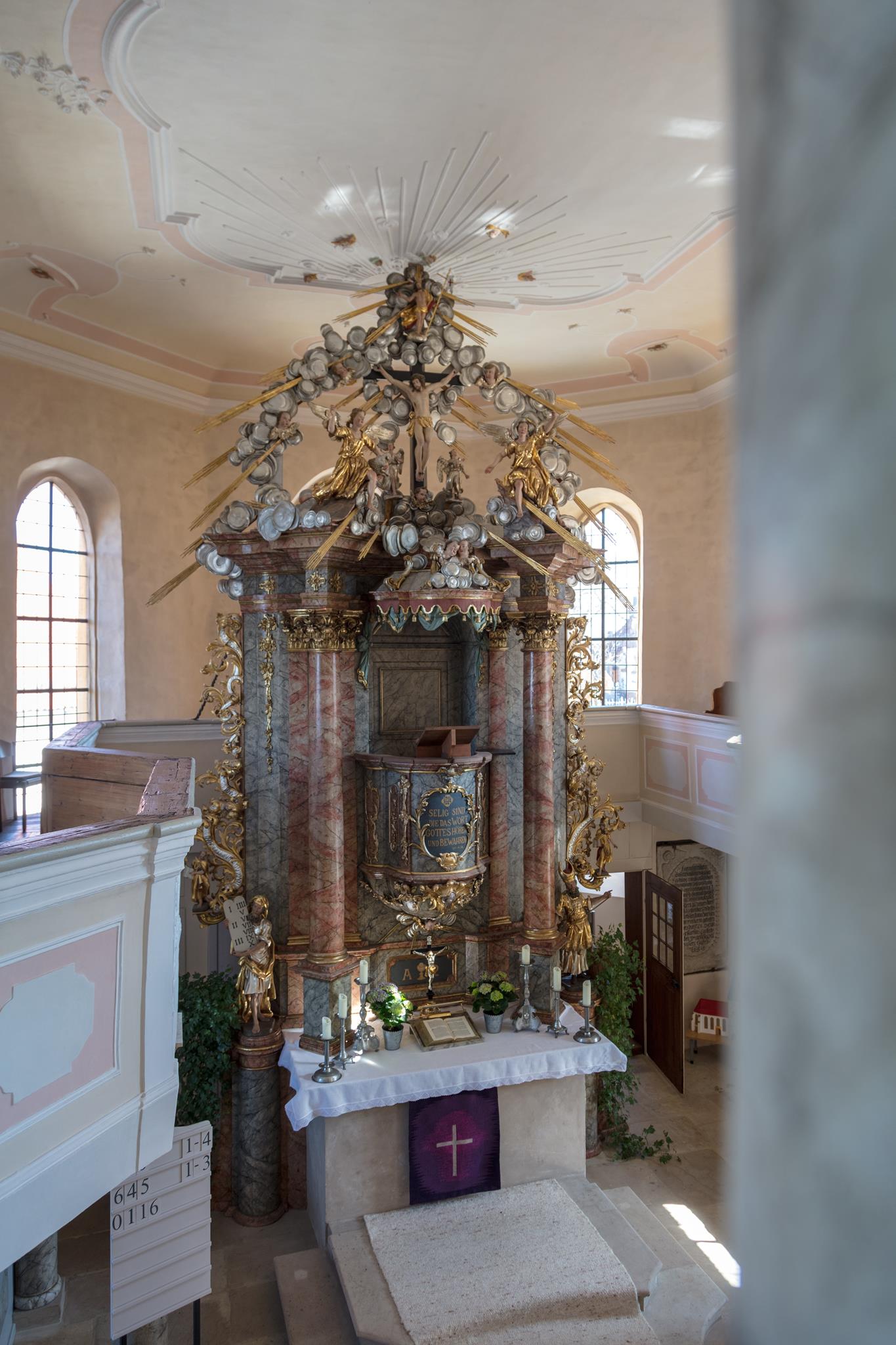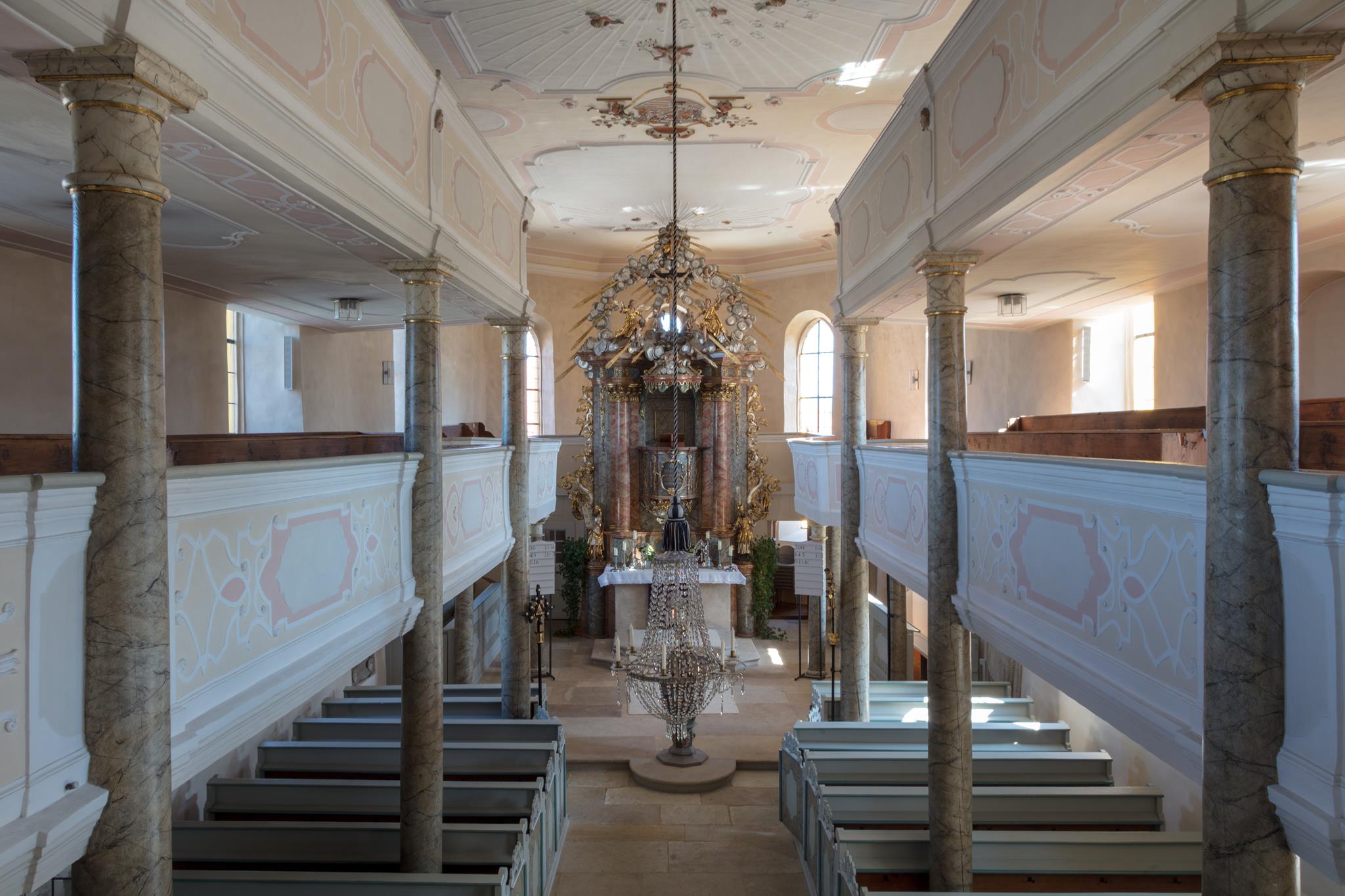 Díky velkým oknům a spoustě bílých a pastelových barev působí kostel světle a jasně. Na štukovém stropě, který je dílem Johanna Nikolause Feega, svítí svatozář s Božím okem v trojúhelníku hned třikrát, obklopená anděly s pestrými křídly a kvetoucími větvičkami, jeden má červené srdce. Andělé na varhanním kůru vyzývají: „Jásejte v Bohu!“ Mezi symboly slávy Boží nechal markrabě Friedrich umístit svá znamení: iniciálu „F“ a markrabský erb. Oltář s vestavěnou kazatelnou, na kterém je Mojžíš s Áronem a ukřižovaný a vzkříšený Kristus, vyřezal Johann Gabriel Räntz kolem r. 1750. Na křtitelnici jsou „naivním uměním“ zobrazeni kromě křtu Ježíšova také andělé s nástroji Kristova umučení.