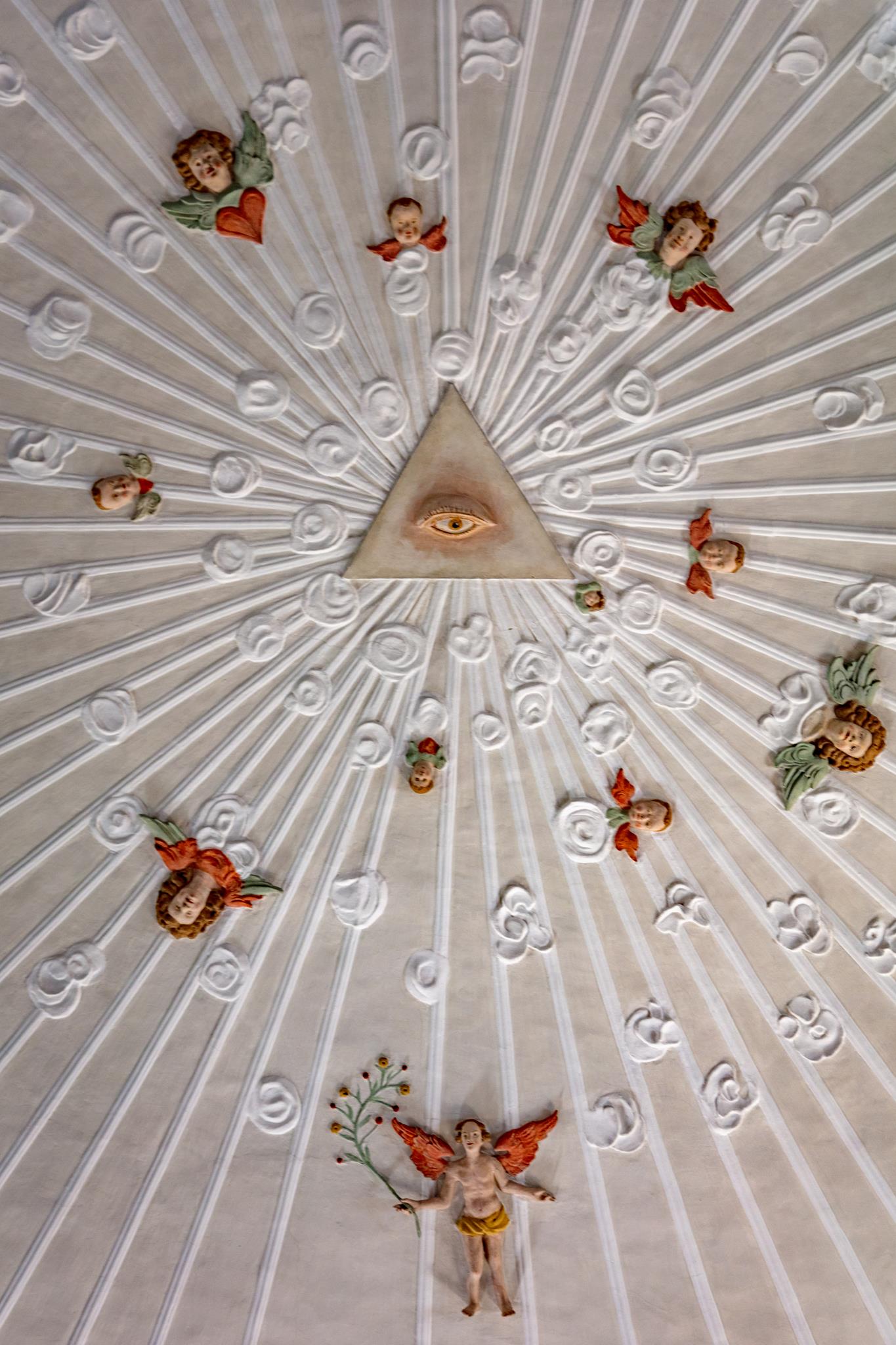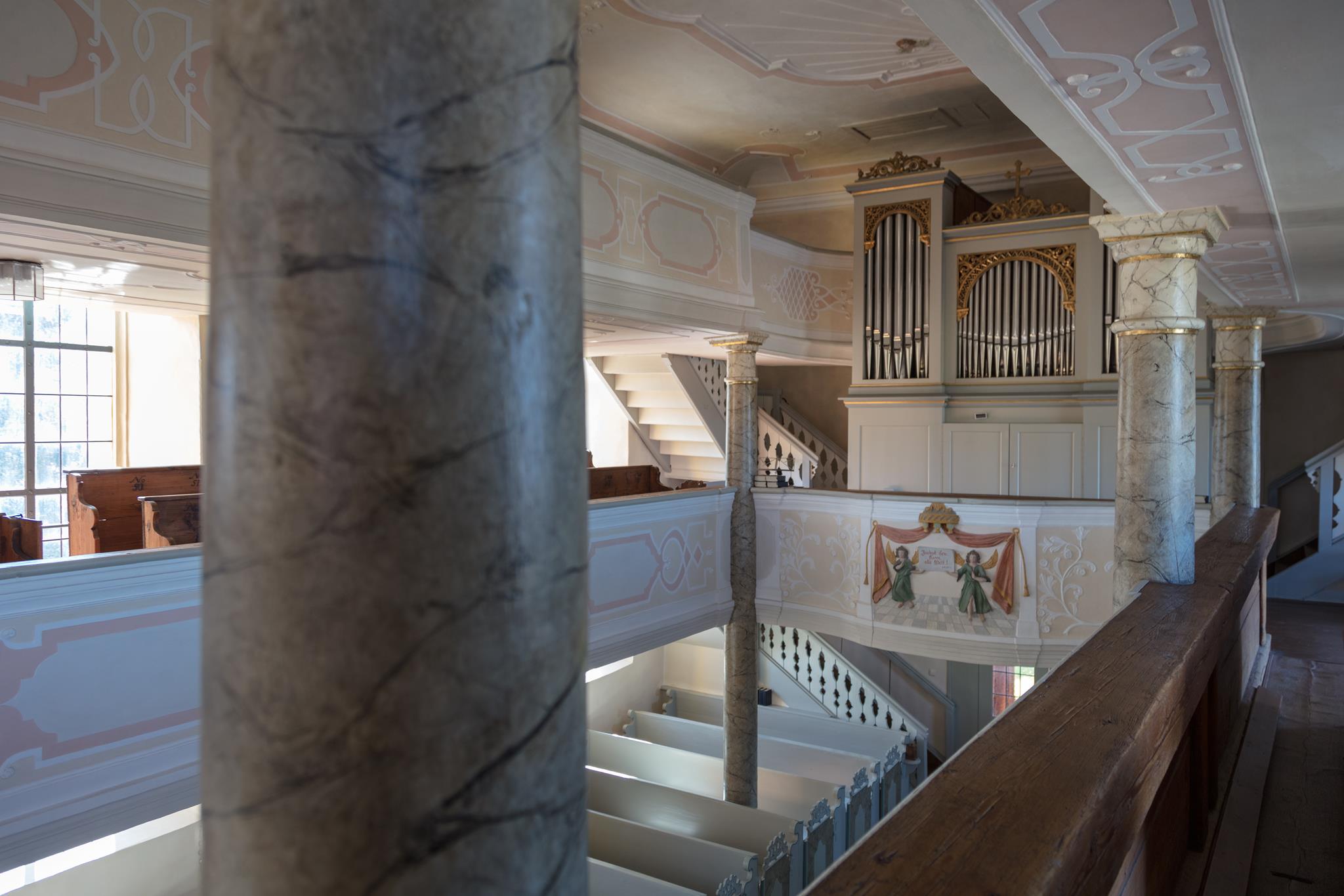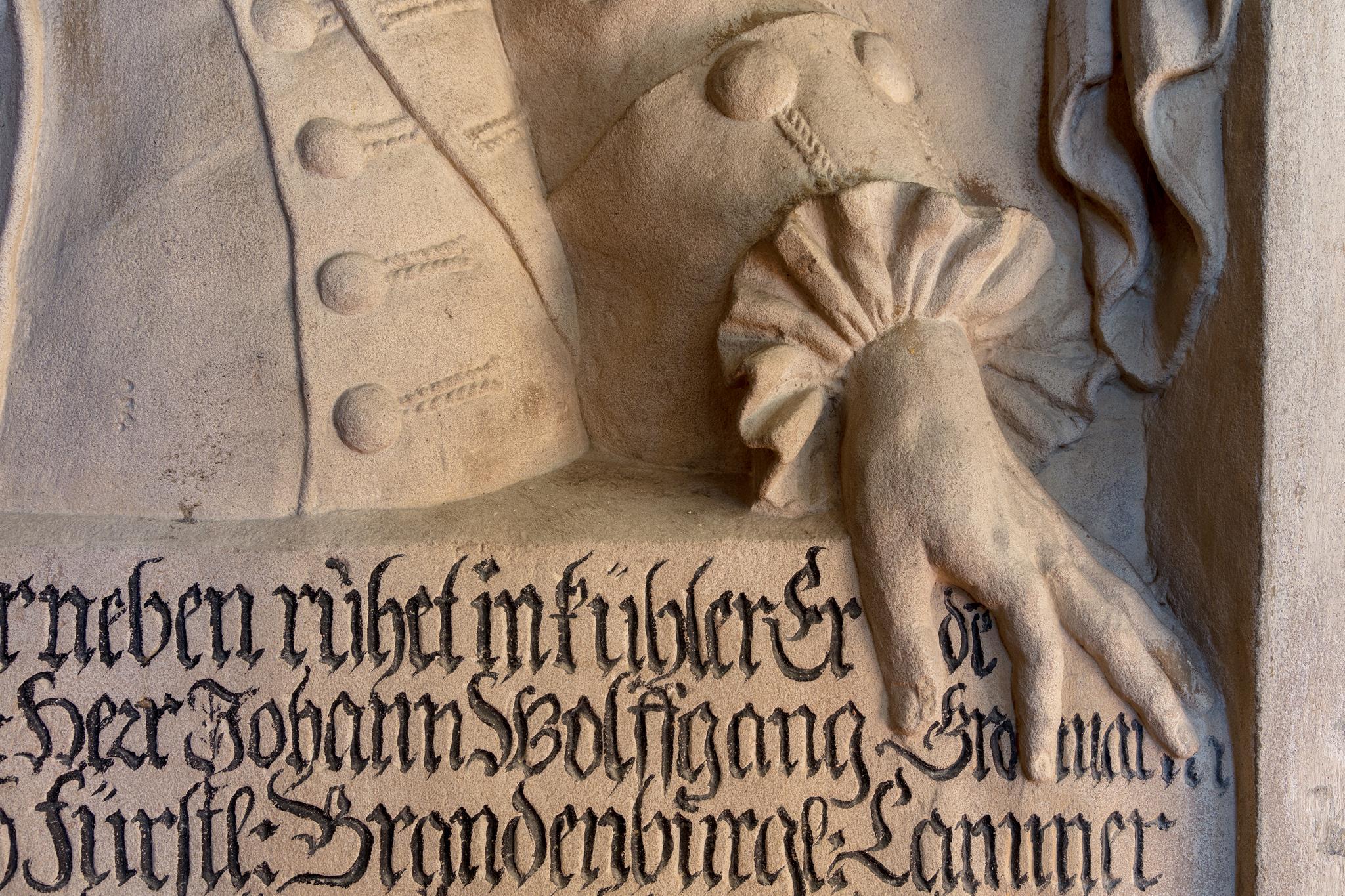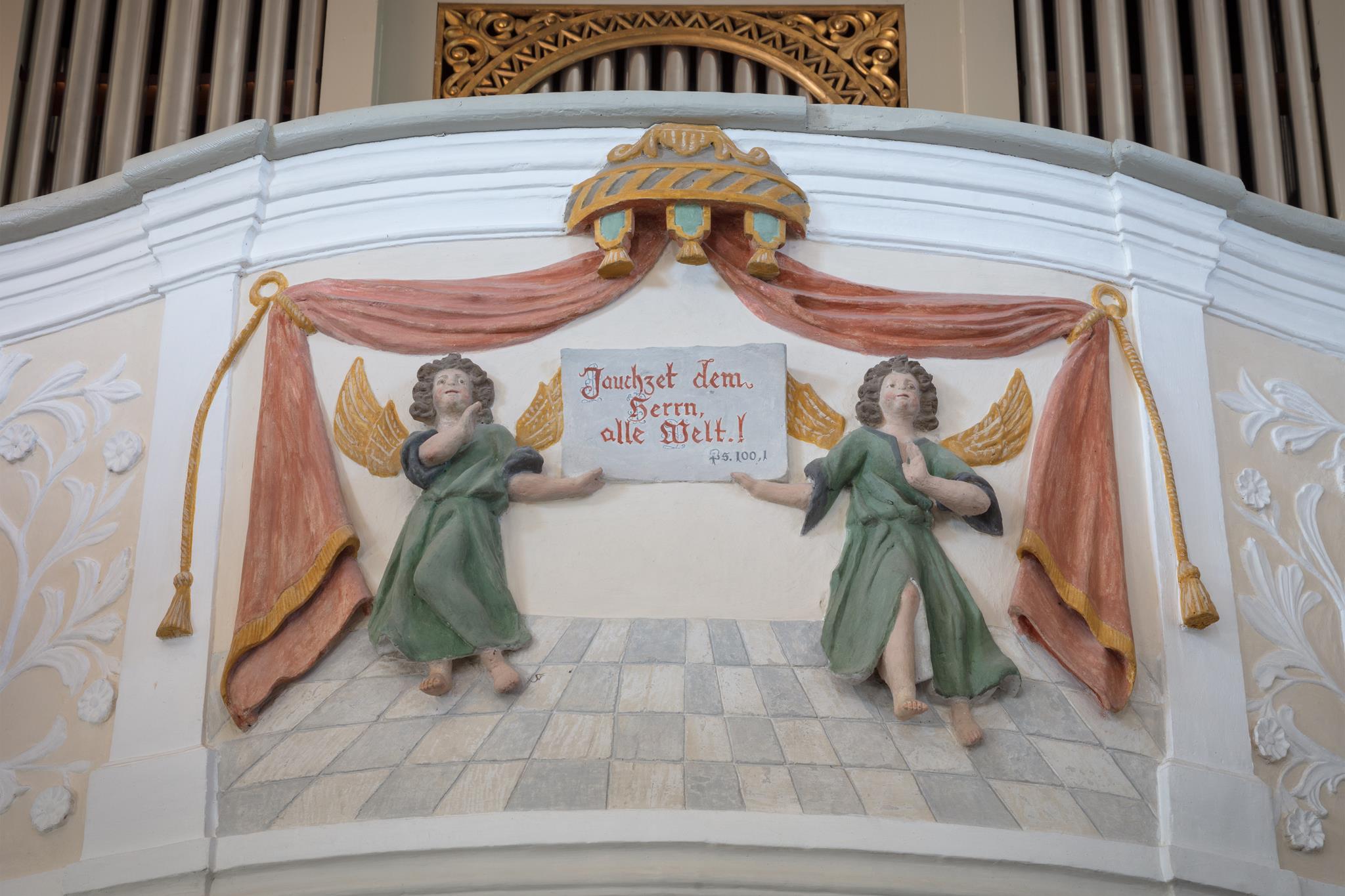 Díky velkým oknům a spoustě bílých a pastelových barev působí kostel světle a jasně. Na štukovém stropě, který je dílem Johanna Nikolause Feega, svítí svatozář s Božím okem v trojúhelníku hned třikrát, obklopená anděly s pestrými křídly a kvetoucími větvičkami, jeden má červené srdce. Andělé na varhanním kůru vyzývají: „Jásejte v Bohu!“ Mezi symboly slávy Boží nechal markrabě Friedrich umístit svá znamení: iniciálu „F“ a markrabský erb. Oltář s vestavěnou kazatelnou, na kterém je Mojžíš s Áronem a ukřižovaný a vzkříšený Kristus, vyřezal Johann Gabriel Räntz kolem r. 1750. Na křtitelnici jsou „naivním uměním“ zobrazeni kromě křtu Ježíšova také andělé s nástroji Kristova umučení.