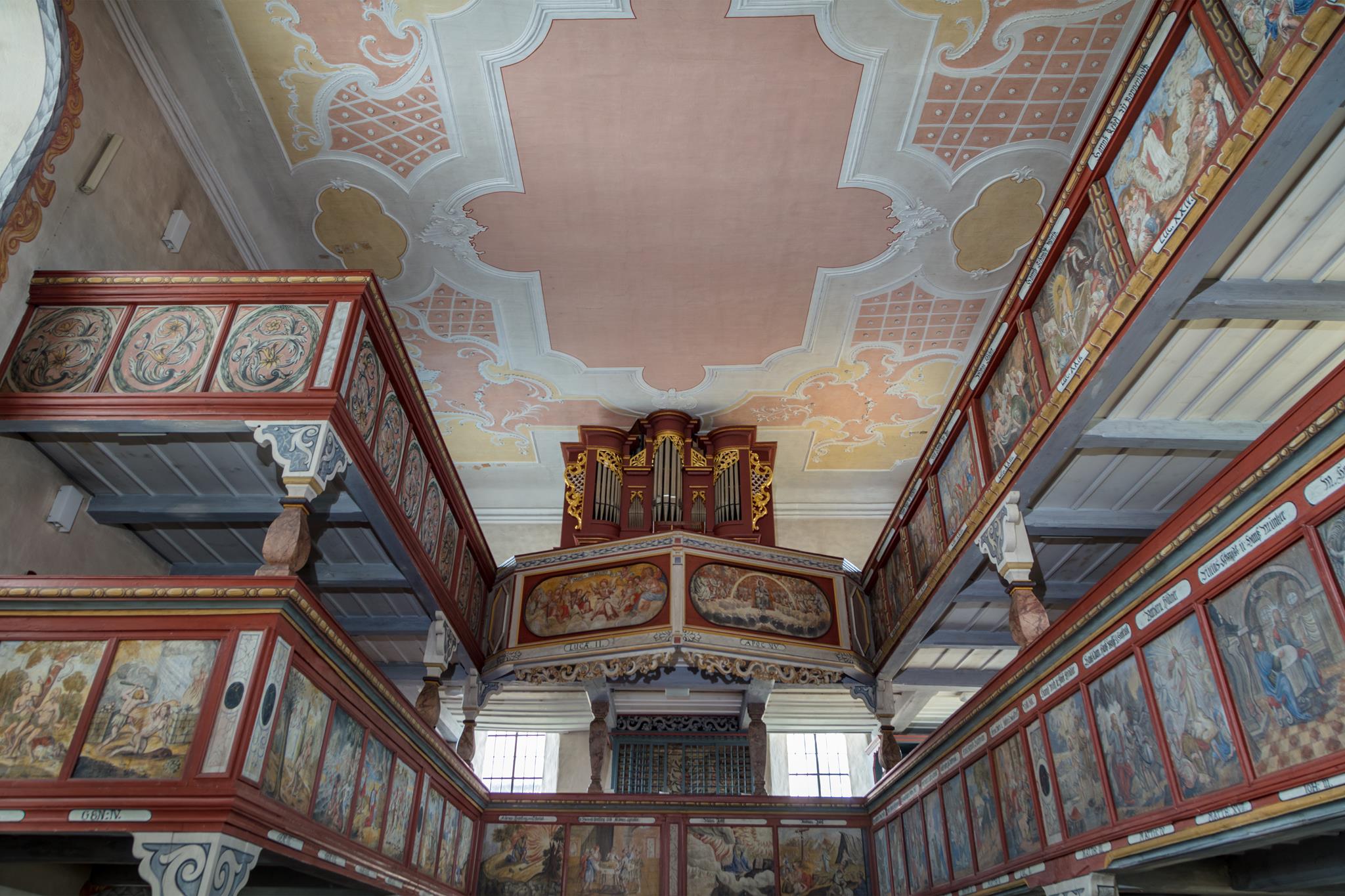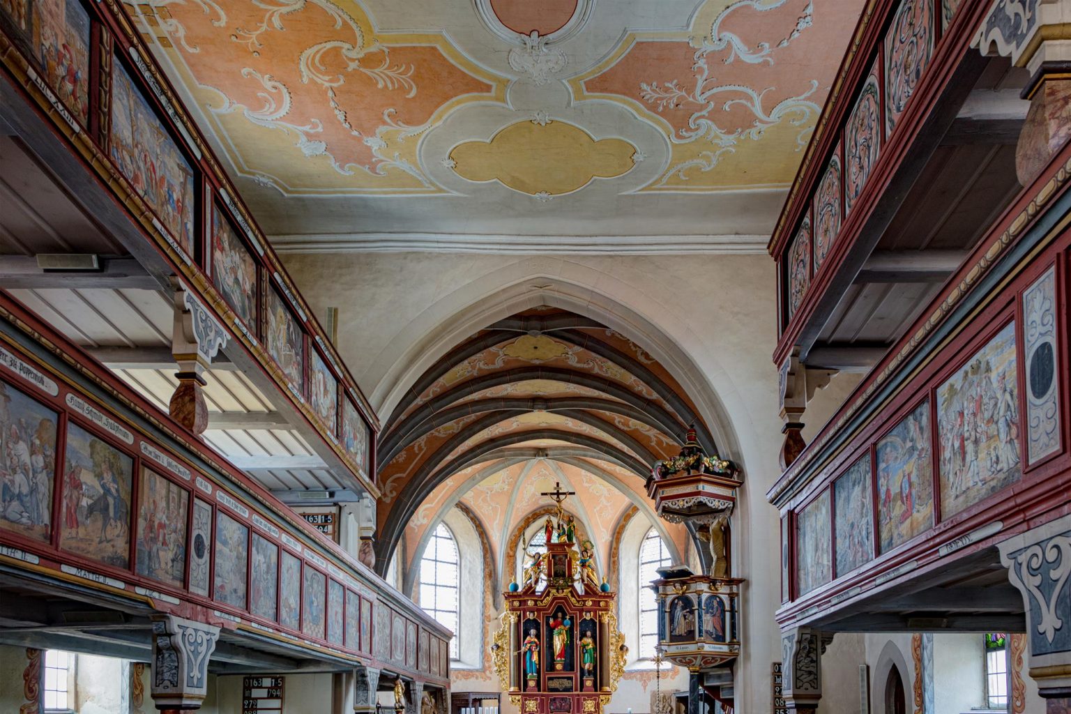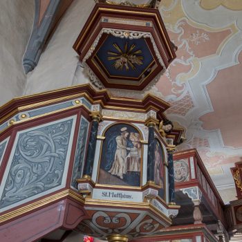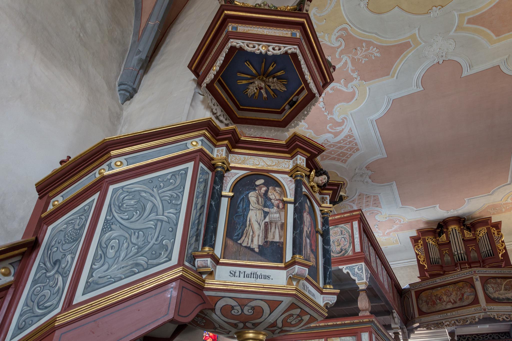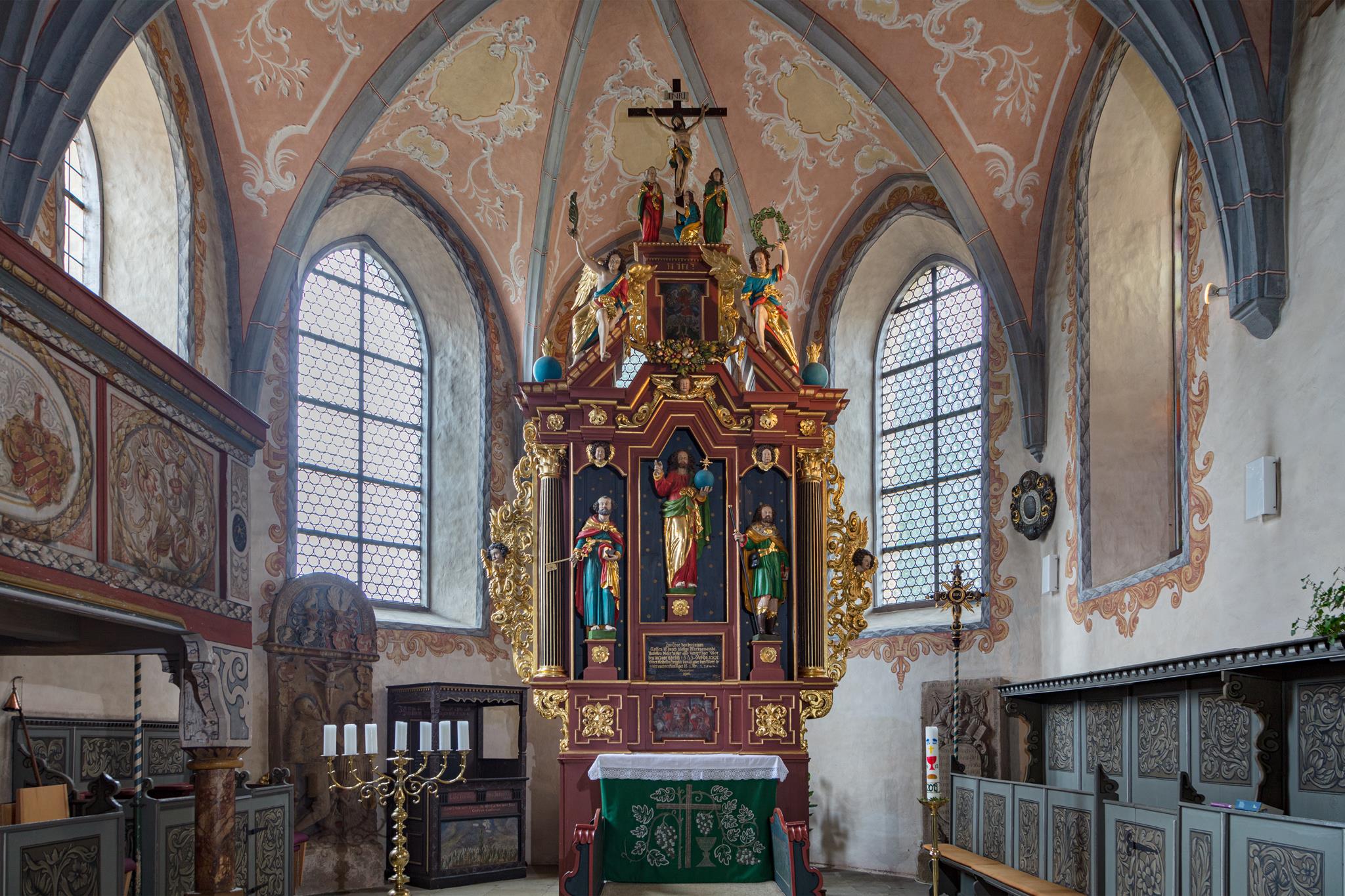 Baroni z Waldenfelsu nechali kapli ze 14. století rozšířit a přebudovat. V barokním období byly pole pozdně gotické klenby i rovný strop vymalovány a ozdobeny štukem. Dvojité galerie a lavice byly vymalovány. Pro jednotlivá pole na zábradlí galerií byla částečně použita květinová výzdoba, částečně erby a hlavně biblické výjevy se jmény dárců. Obě malby na varhanním kůru jsou obzvláště nápadné: andělé v nebi a všichni vykoupení oslavují Boha Otce a Beránka. Pestrými květinami jsou ozdobeny také lavice pánů z Waldenfelsu i lavice na klekání před oltářem (1780) a ambon (1761). Cenné náhrobky připomínají šlechtice a duchovenstvo.