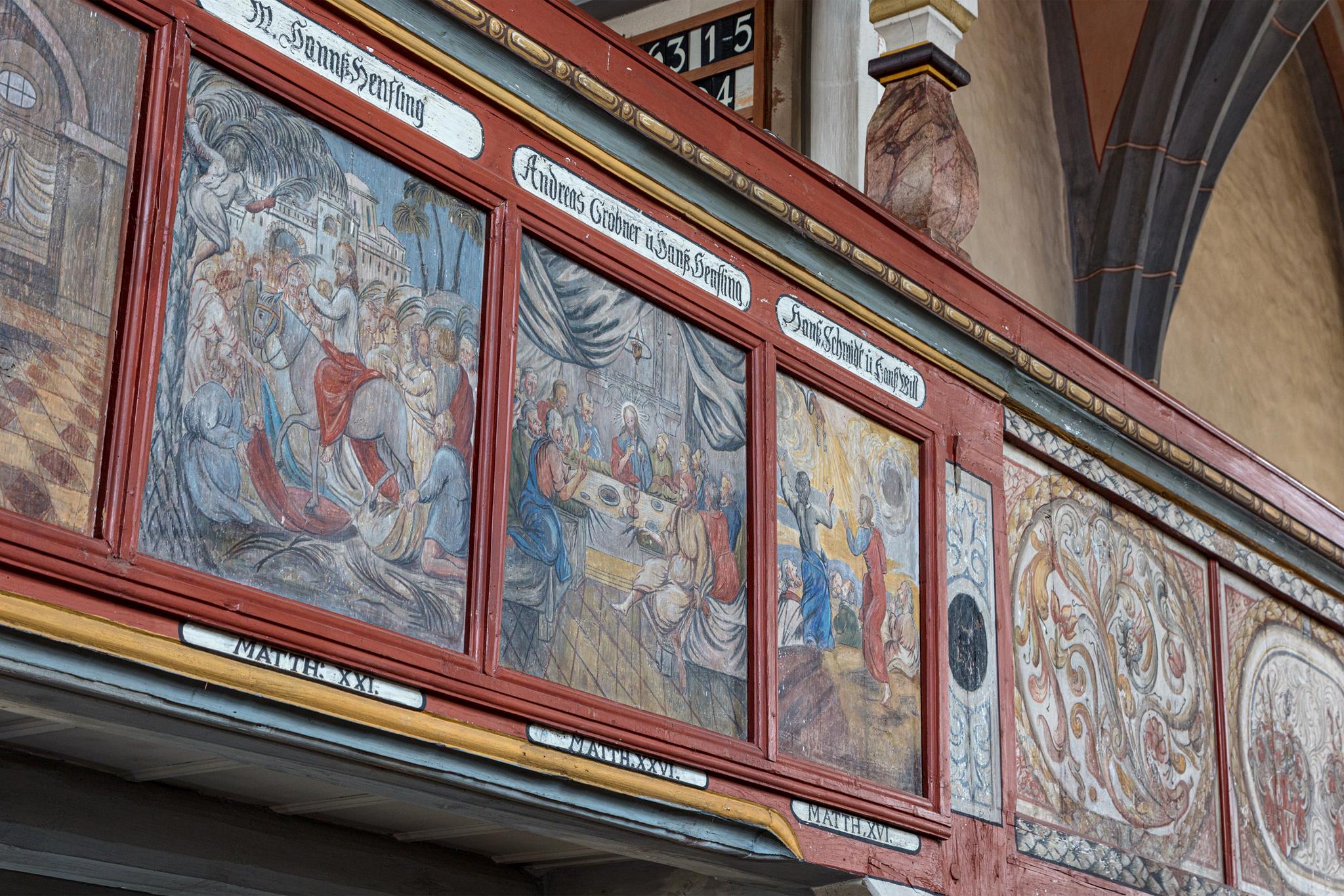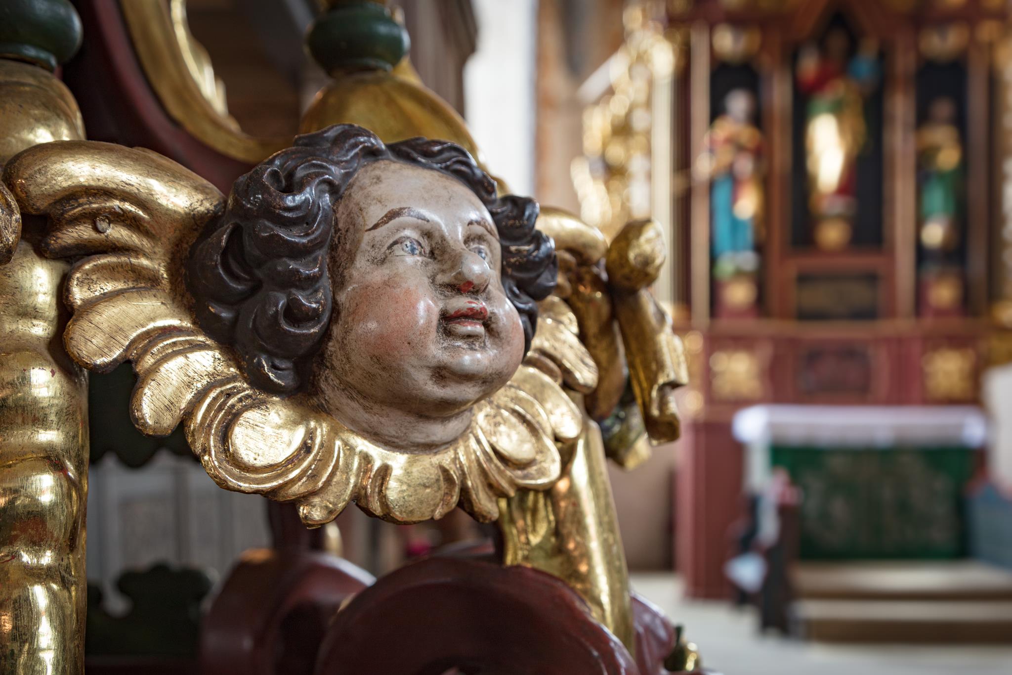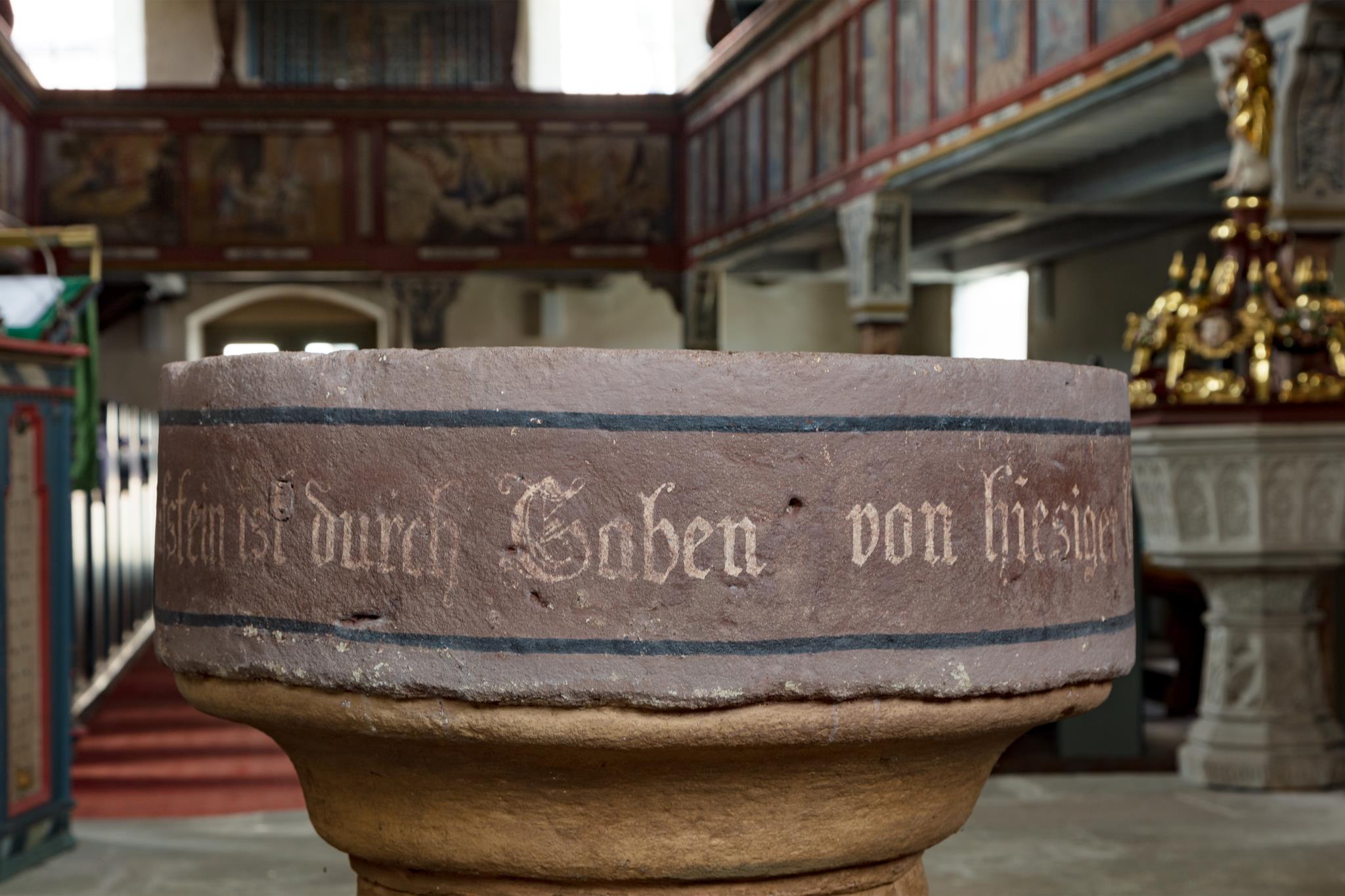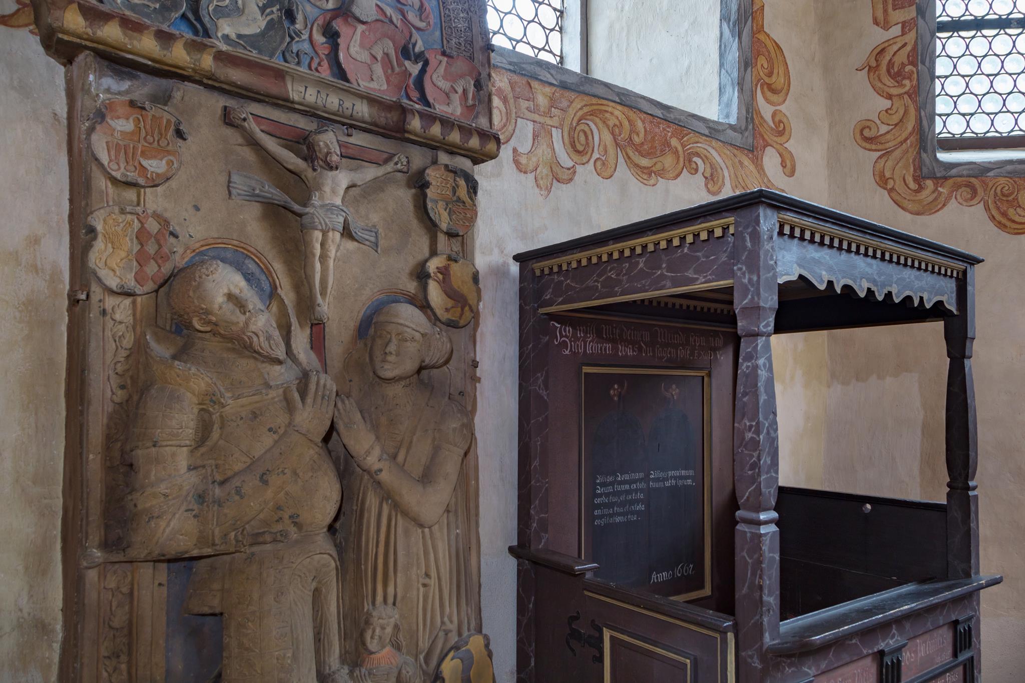 „Můj přítel je jako lilie mezi bodláky.“ Tento verš z písně Šalomounovy, sbírky milostných písní, najdete ve zpovědnici, zřejmě nejcennějším kusu kostela. Přítelem se tu míní Ježíš, přítel hříšníků. Lilie je však obklopena jedovatými konvalinkami. Vedle na oltáři stojí Petr s velkým zlatým klíčem, uprostřed Kristus, Spasitel, sotér, s obrázkem zeměkoule s křížem a vpravo patron kostela Jakub, poutník s holí. Andělé a scéna ukřižování korunují oltář, který sbor v r. 1663 sám financoval, jak hrdě prohlašuje nápis. Postavy vyřezal Johann Georg Brenck, stejně tak vyřezal i víko křtitelnice nahoře s Janem Křtitelem. Toto umělecké dílo nyní zdobí novogotický kámen. Uprostřed prostorného presbytáře stojí ještě jedna, starší, v archaickém kulatém tvaru, kterou sbor v roce 1667 také financoval.