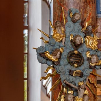 Jeho vybavení ukazuje, co slouží lidem ke spáse. Uprostřed kazatelny, tedy víry samé, stojí Kristus, Spasitel, obklopen čtyřmi evangelisty, kteří ztělesňují poselství spásy. Anděl úplně nahoře ji vytrubuje do světa. Pavel s mečem se přiznává k moci slova Božího. Až budou na zemi odpuštěny hříchy, odemknou Petrovy klíče nebesa. Tak se dělo až do 19. století i v evangelickém kostele v ozdobně vyřezávané zpovědnici při soukromých zpovědích. Původní křtitelnice, u níž začíná „pouť do ráje“, byla nahrazena novogotickou. Večeři Páně připomíná obraz s výjevem Ježíšovy poslední večeře na predele.