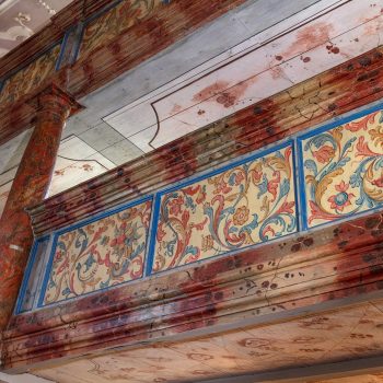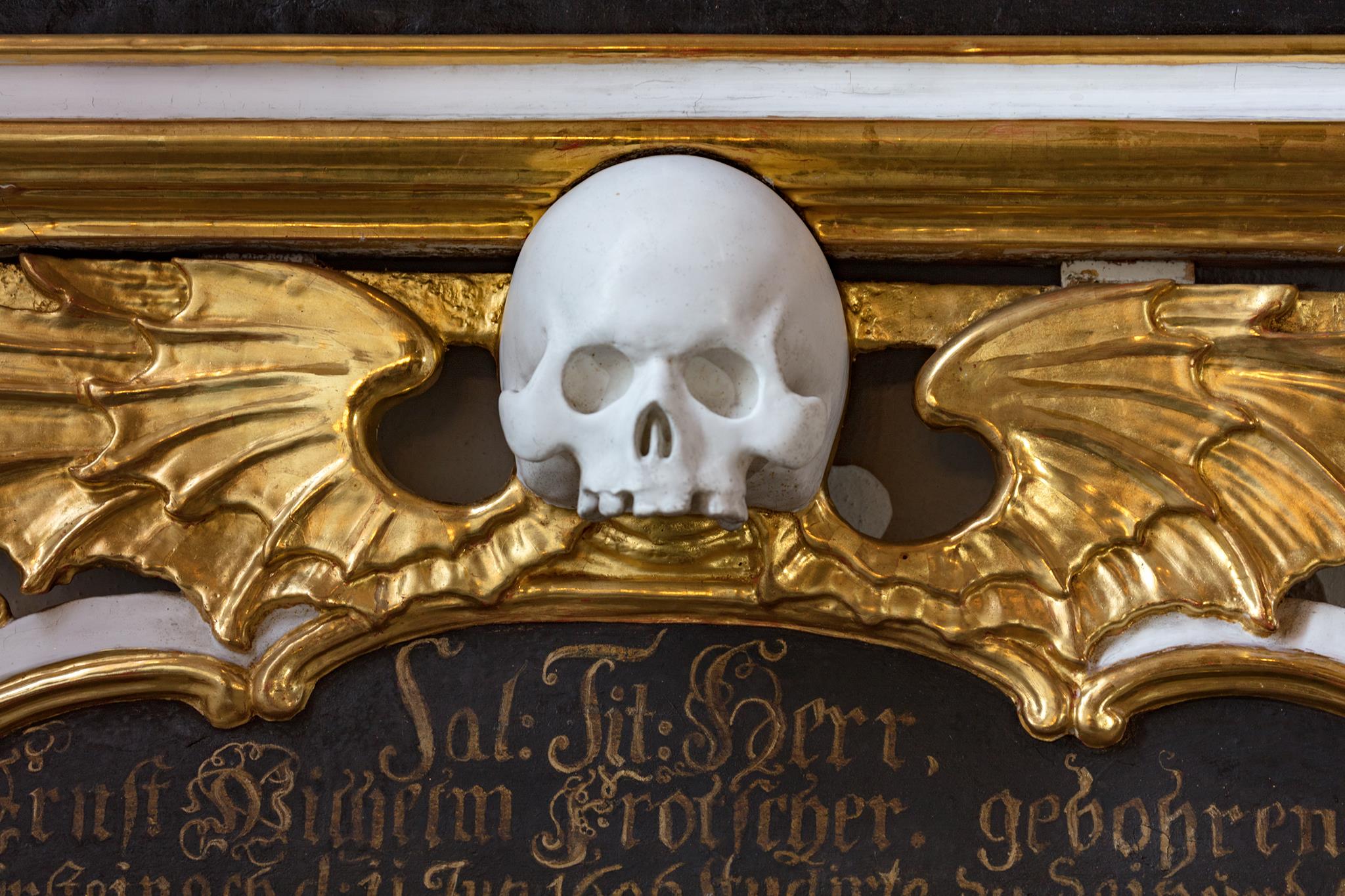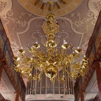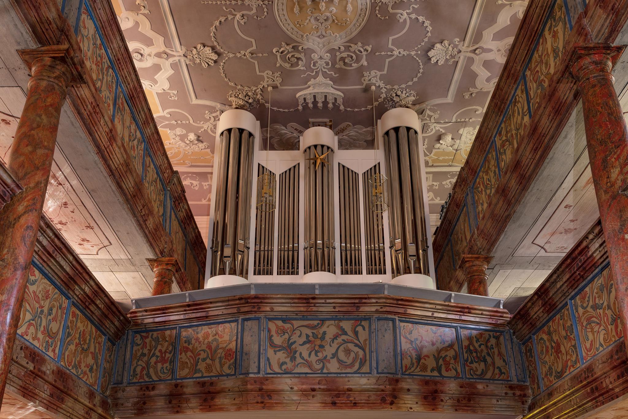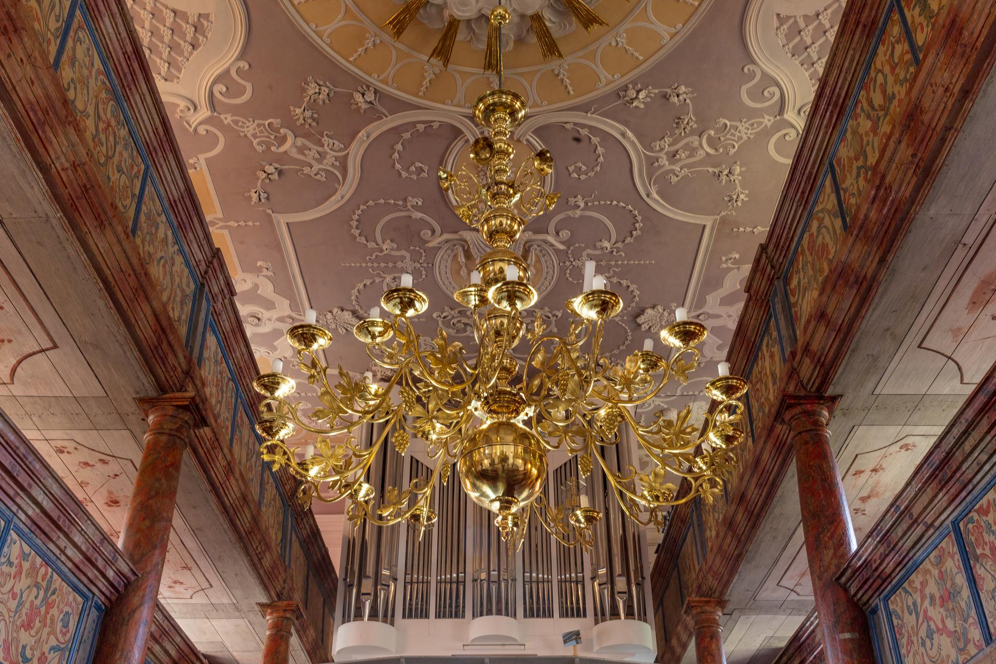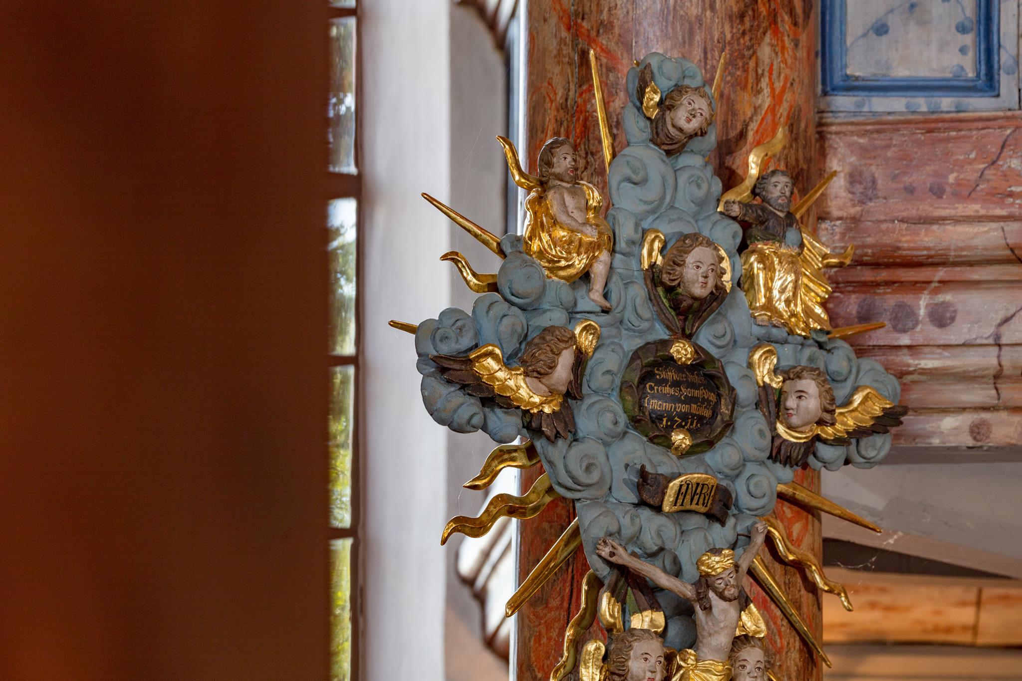 Umělecký stropní štuk bamberských štukatérů otce a syna Feegových zaujme bohatými ornamenty v symetrii vrcholného baroka. Symboly desek přikázání a archy úmluvy znamenají „starou smlouvu“. Uprostřed září Boží sláva: trojúhelník lemovaný květinami s Božím jménem Jahwe ve svatozáři. Nebe, cíl pozemské pouti, se otevírá. Na podlaze kostela u vchodu najdou návštěvníci srdečné uvítání.