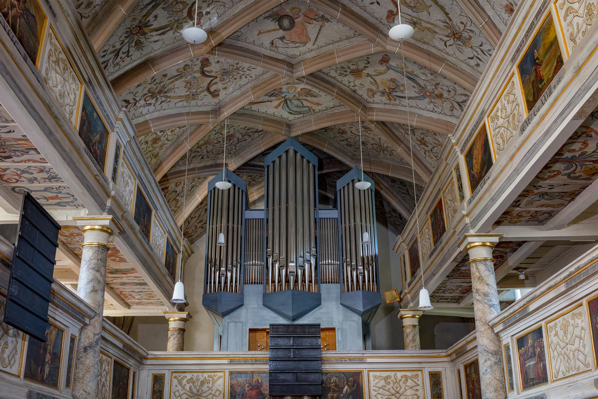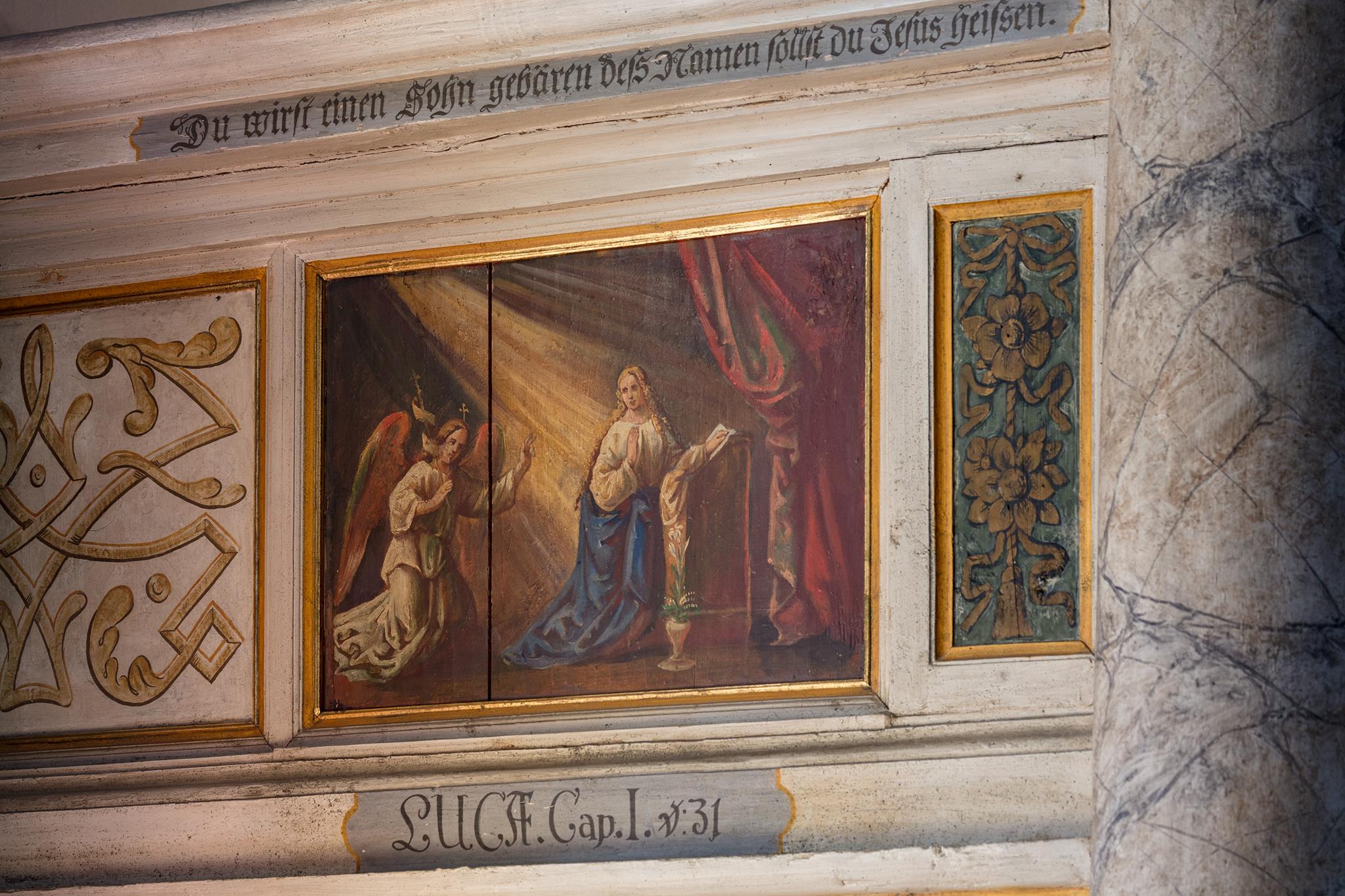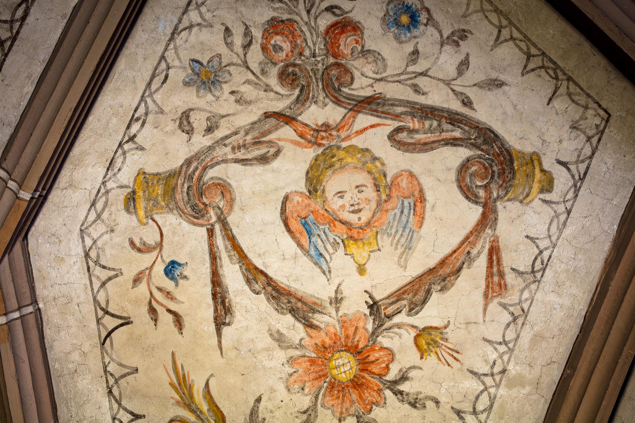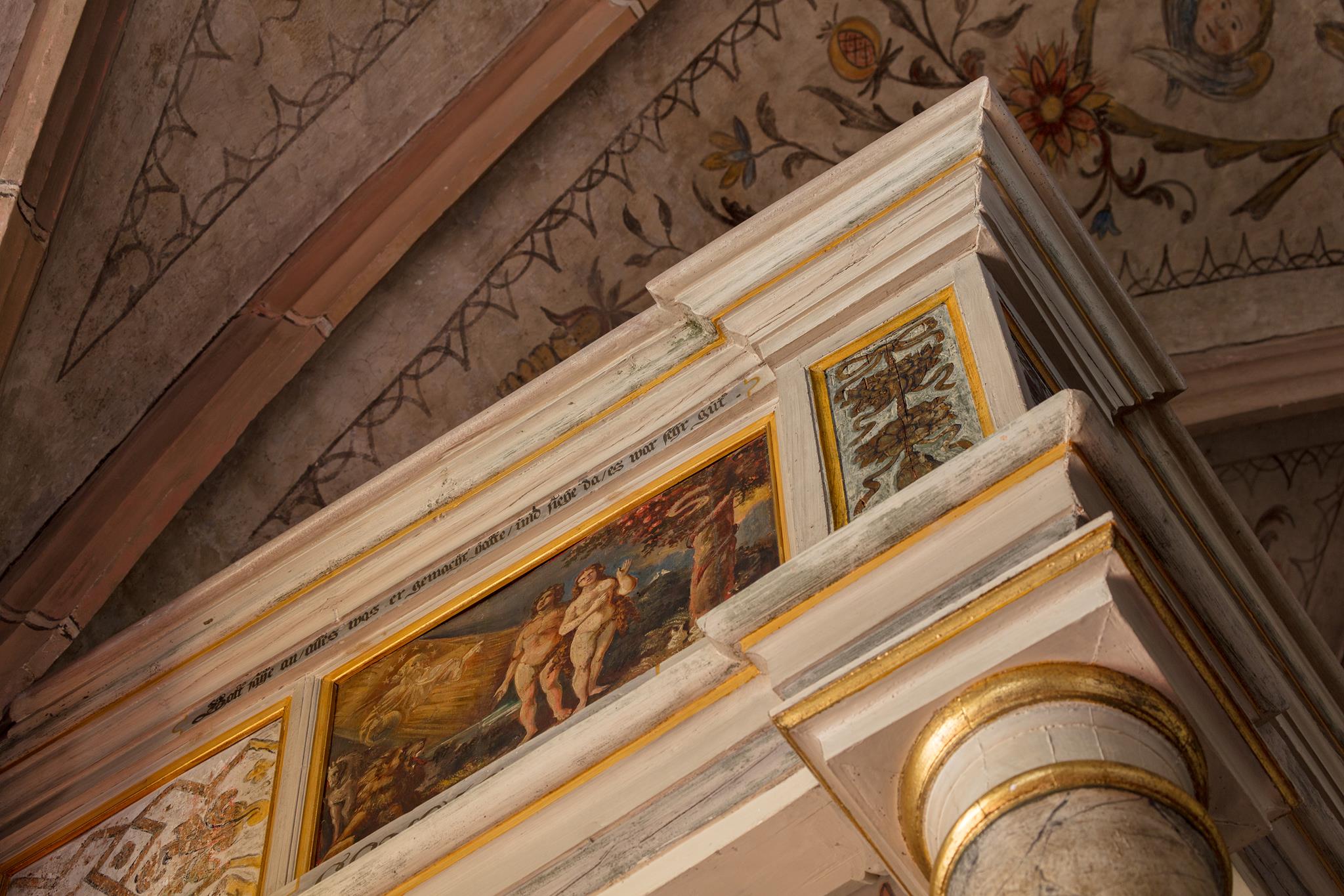Často nelze přesně určit, kdy mnohé obrazy vznikly. Celý prostor kostela vypadá jako bohatě zdobená obrázková Bible. Některé obrazy pochází z r. 1497, kdy byl původní starší kostel rozšířen a zřízen pozdně gotický presbytář. Roku 1651 byly postaveny první galerie. Z nich zřejmě pochází malby na deskách, které byly nyní ořezány na podlahu druhé galerie. Stávající obrazy na galerii s mnoha biblickými scénami a nápisy byly namalovány teprve po instalaci nových dřevěných empor v presbytáři a v lodi v letech 1715, popř. 1729/30. Dokládají to letopočty u jmen dárců. Klenba byla barokně vymalována až v roce 1955 – s anděly zvěstujícími slávu Boží hudbou a s květinovou dekorací. Na stropě presbytáře uzavírá kruh svatá Trojice. Výsledkem je bohatě malovaný kostel s pozdně gotickou síťovou klenbou a s dvojitými barokními galeriemi, které se rozprostírají po třech stranách stěn presbytáře.