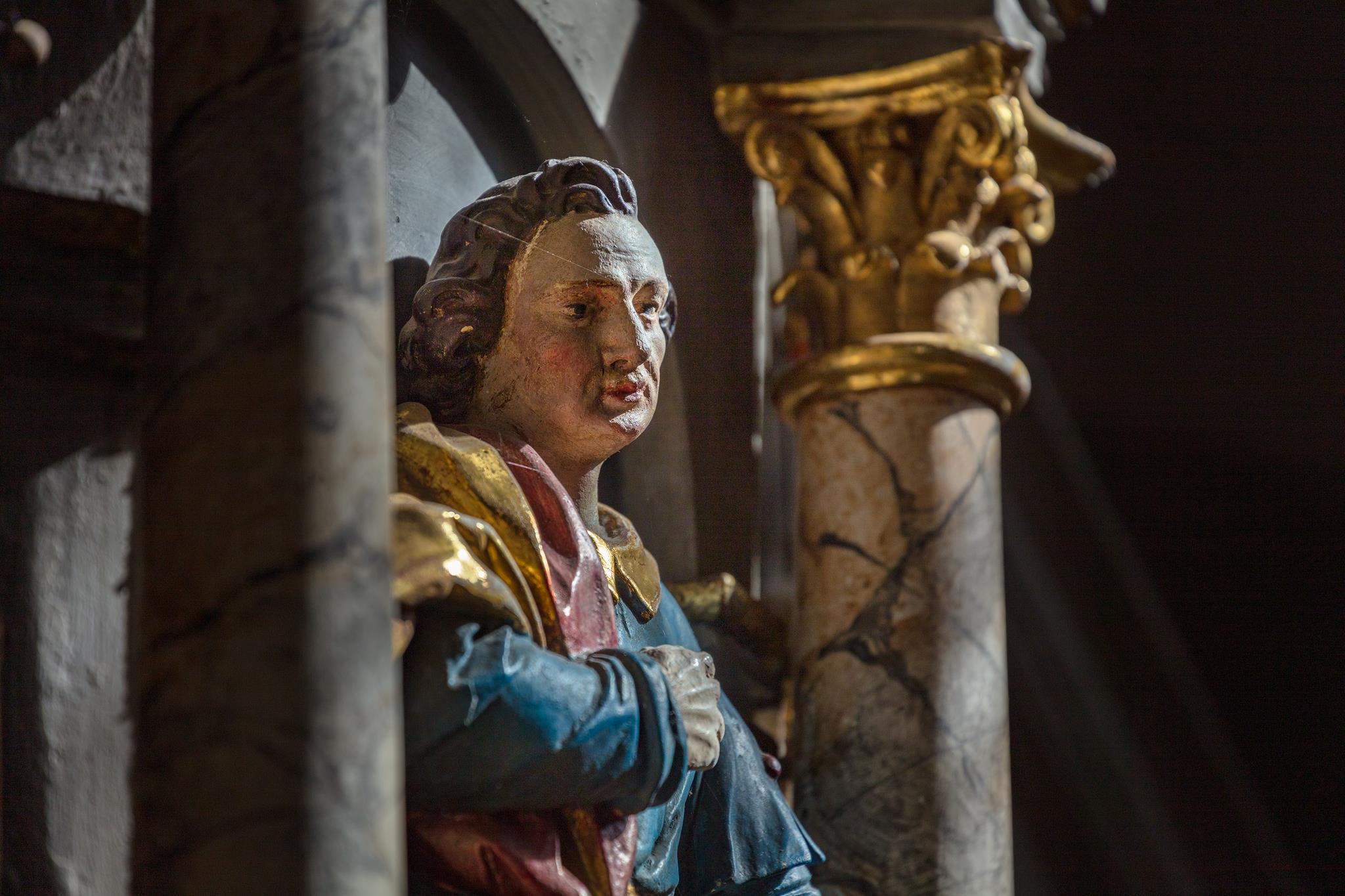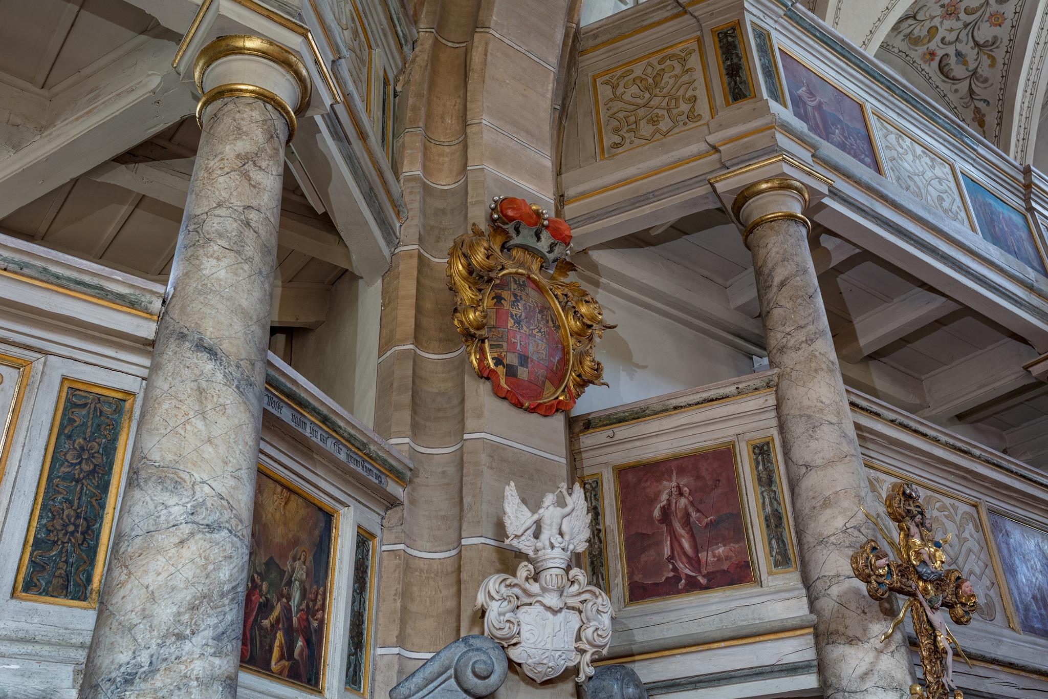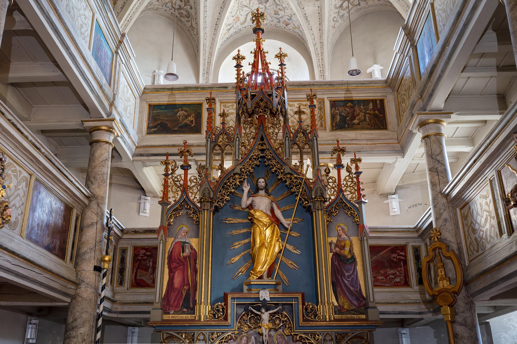 V oblouku presbytáře stojí kazatelna zdobená sochami, které jsou v markrabských kostelích často: Kristus, Spasitel („Soter“), a čtyři evangelisté na kazatelně, na její stříšce je Vzkříšený s praporem vítězství. Podobná dřevěná plastika se Vzkříšeným Kristem byla začleněna do novogotického oltáře z pozdější doby. Na spodním okraji horní empory se nachází – částečně uměleckým písmem – jména mužů, kteří si koupili místo pod těmito nápisy.