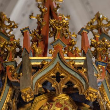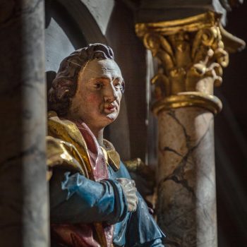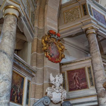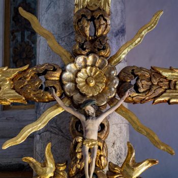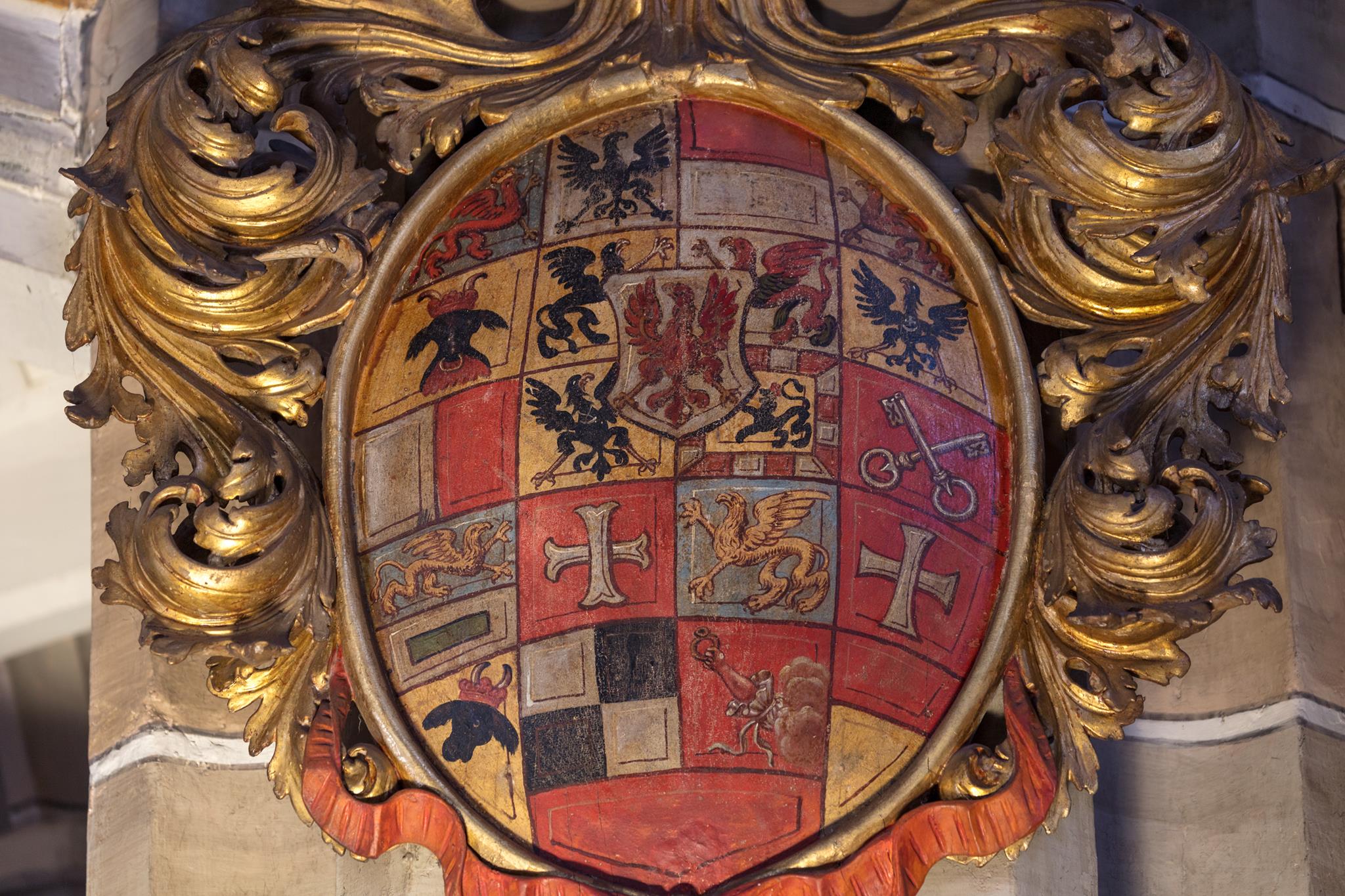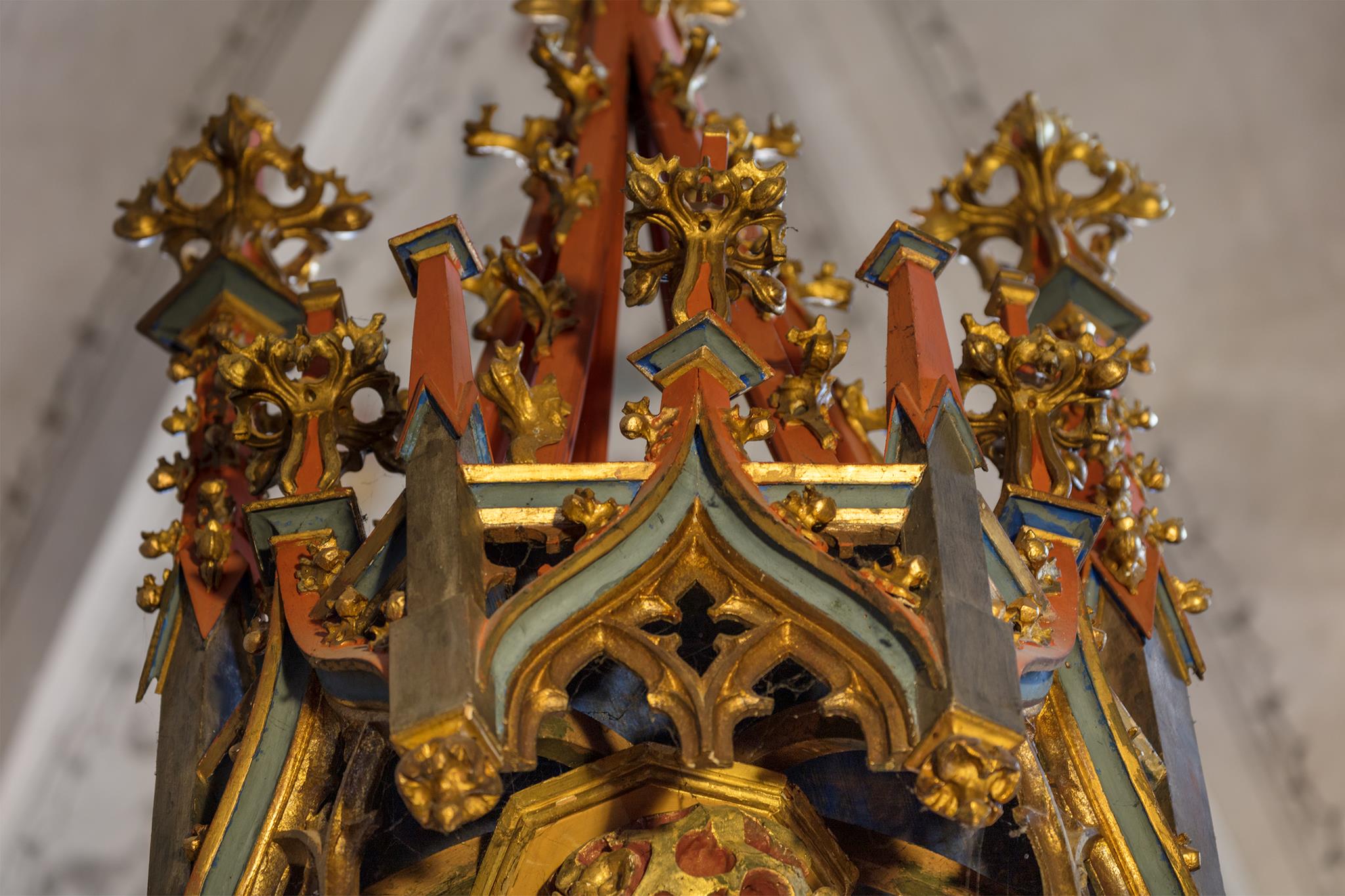 V oblouku presbytáře stojí kazatelna zdobená sochami, které jsou v markrabských kostelích často: Kristus, Spasitel („Soter“), a čtyři evangelisté na kazatelně, na její stříšce je Vzkříšený s praporem vítězství. Podobná dřevěná plastika se Vzkříšeným Kristem byla začleněna do novogotického oltáře z pozdější doby. Na spodním okraji horní empory se nachází – částečně uměleckým písmem – jména mužů, kteří si koupili místo pod těmito nápisy.