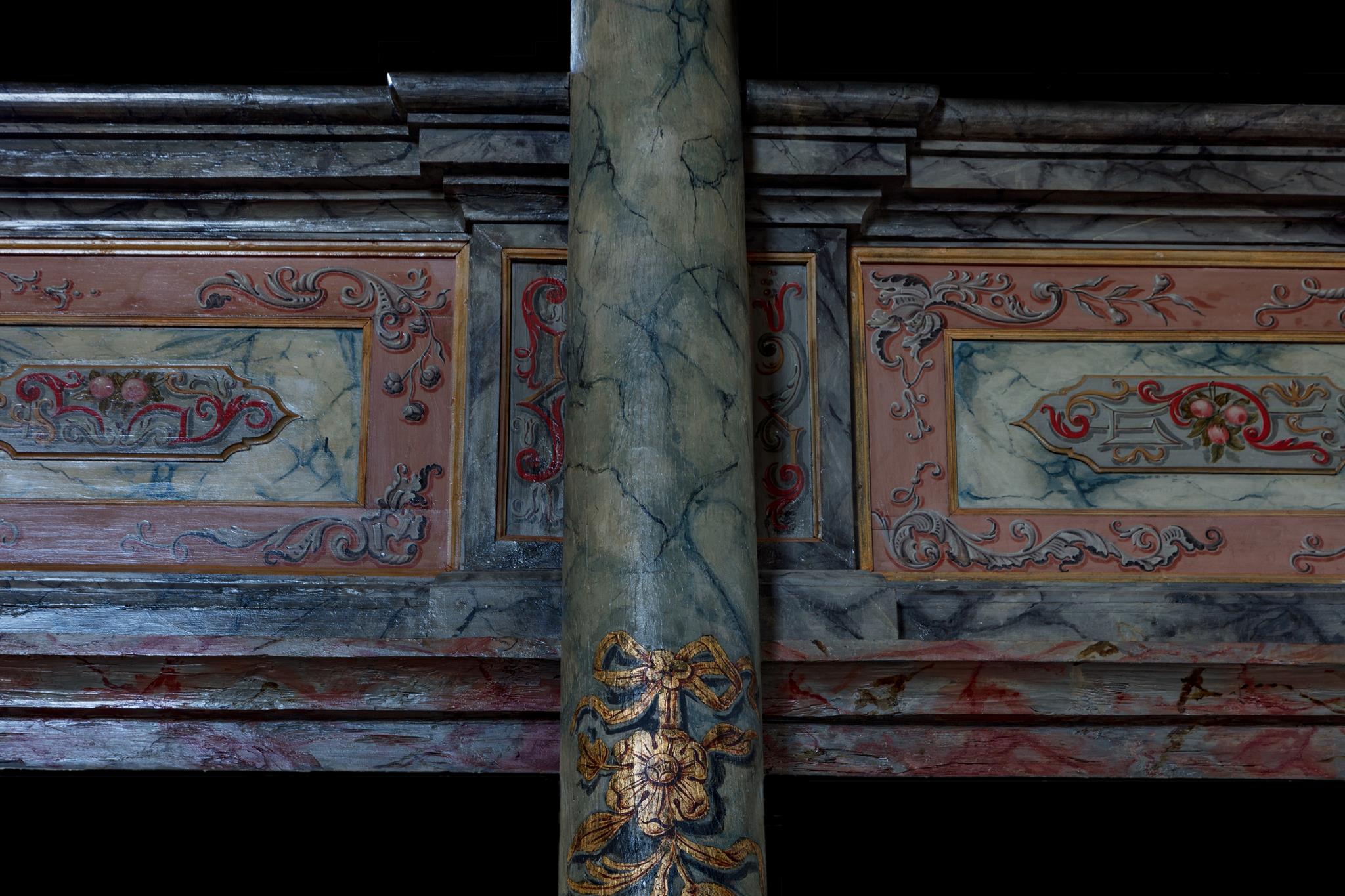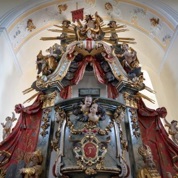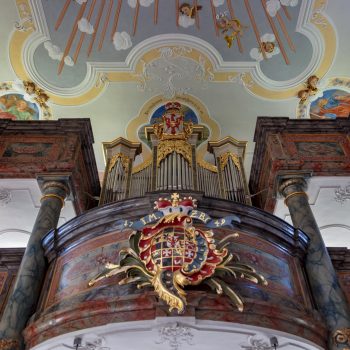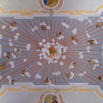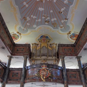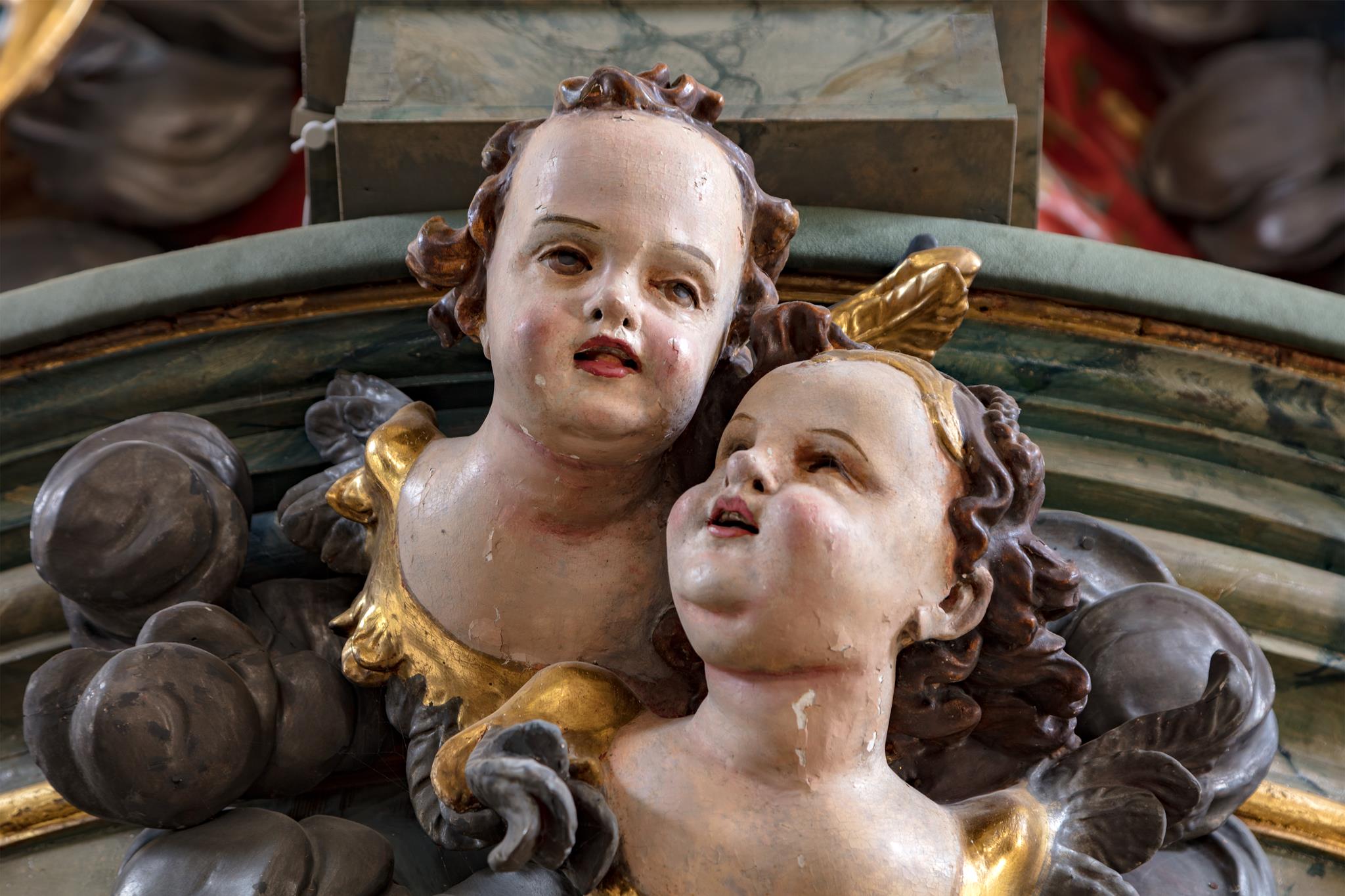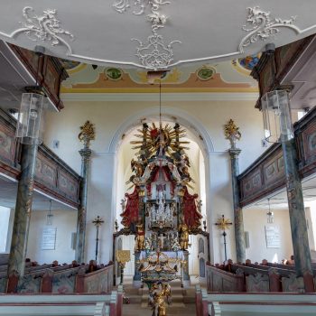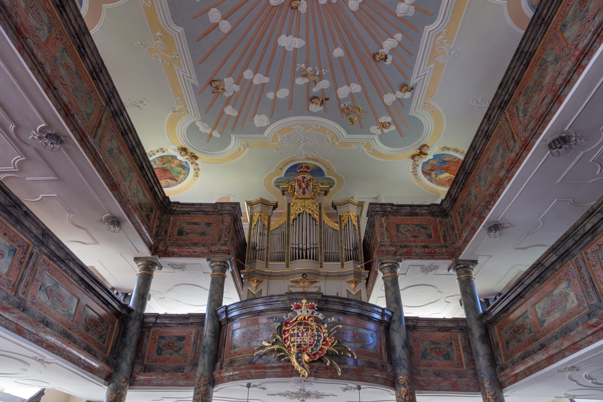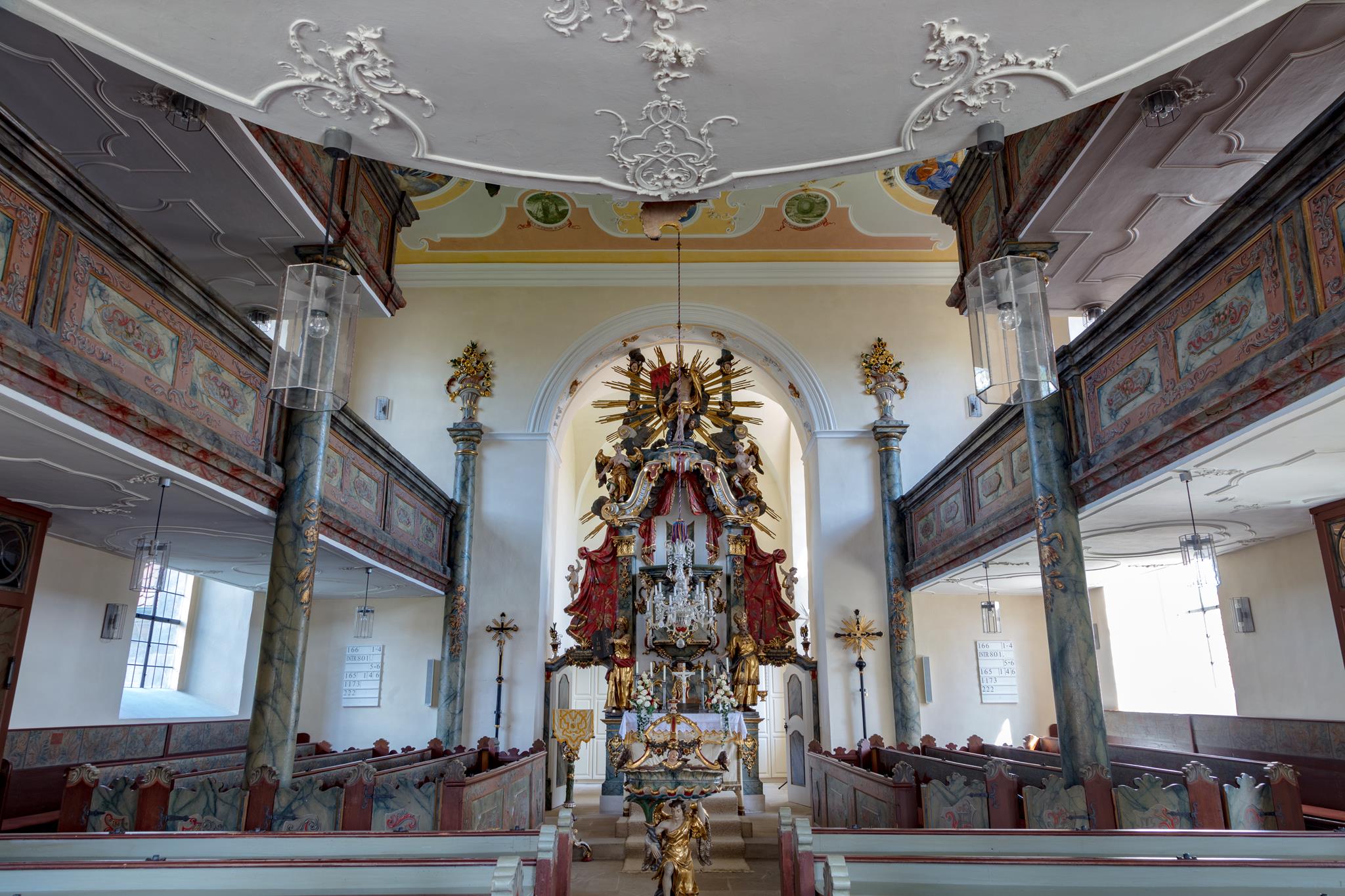 V tomto kostele, všeuměleckém díle vytvořeném nejlepšími umělci regionu, se otvírá samo nebe. Na stropě září Boží sláva. Ze zlatého trojúhelníku prorážejí paprsky světla mezi bílými oblaky do celého prostoru. Andělé s tvářemi dětí a žen tvoří nebeský dvůr a – stejně jako Boží oko – přátelsky shlížejí na lidi. Dvorní štukatér J. F. Andreioli vytvořil hezké výrazné obličeje, „privilegovaný dvorní malíř“ H. S. Lohe namaloval strop s obrazy k žalmovým veršům. V pestrých barvách vymaloval i celý kostel.