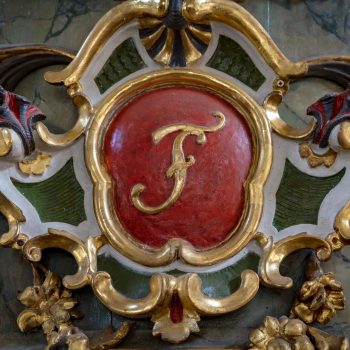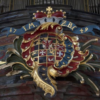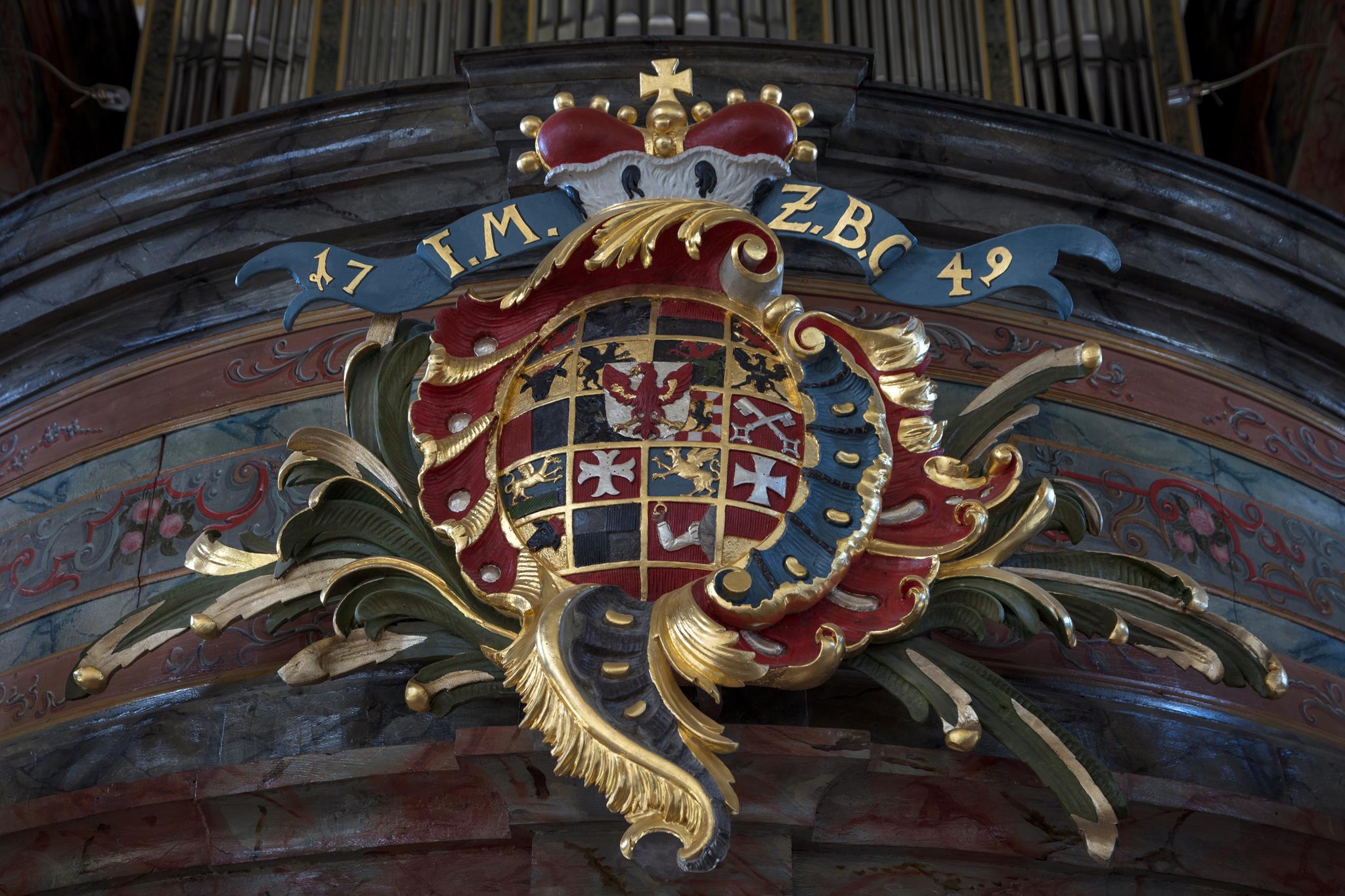 Markrabě Friedrich pravděpodobně nemohl přispět penězi, když po požáru musel být kostel v letech 1741-49 nově postaven. Ale nechal připevnit svůj erb k varhanám a jeho „F“ vidíme i na kazatelně. Na oltáři s kazatelnou nevidíme žádný kříž, oltář je v červené a zlaté barvě. Jen procesní kříže připomínají Ježíšovu smrt. Vzkříšený se však objevuje v aureole a svatozáři jako vítěz nad smrtí a zdraví žehnající rukou. Mojžíš jako dárce zákona a Áron jako velekněz odkazují k spáse skrze Krista. Oltář s vestavěnou kazatelnou zhotovil stejně jako křtitelnici s andělem, vzácný dvoustranný ambon a varhanní prospekt dvorní sochař J. G. Räntz. Na původně dochovaných lavicích jsou ukázky umělecky vymalovaných čísel, která určují, kdo si příslušné místo pronajal.