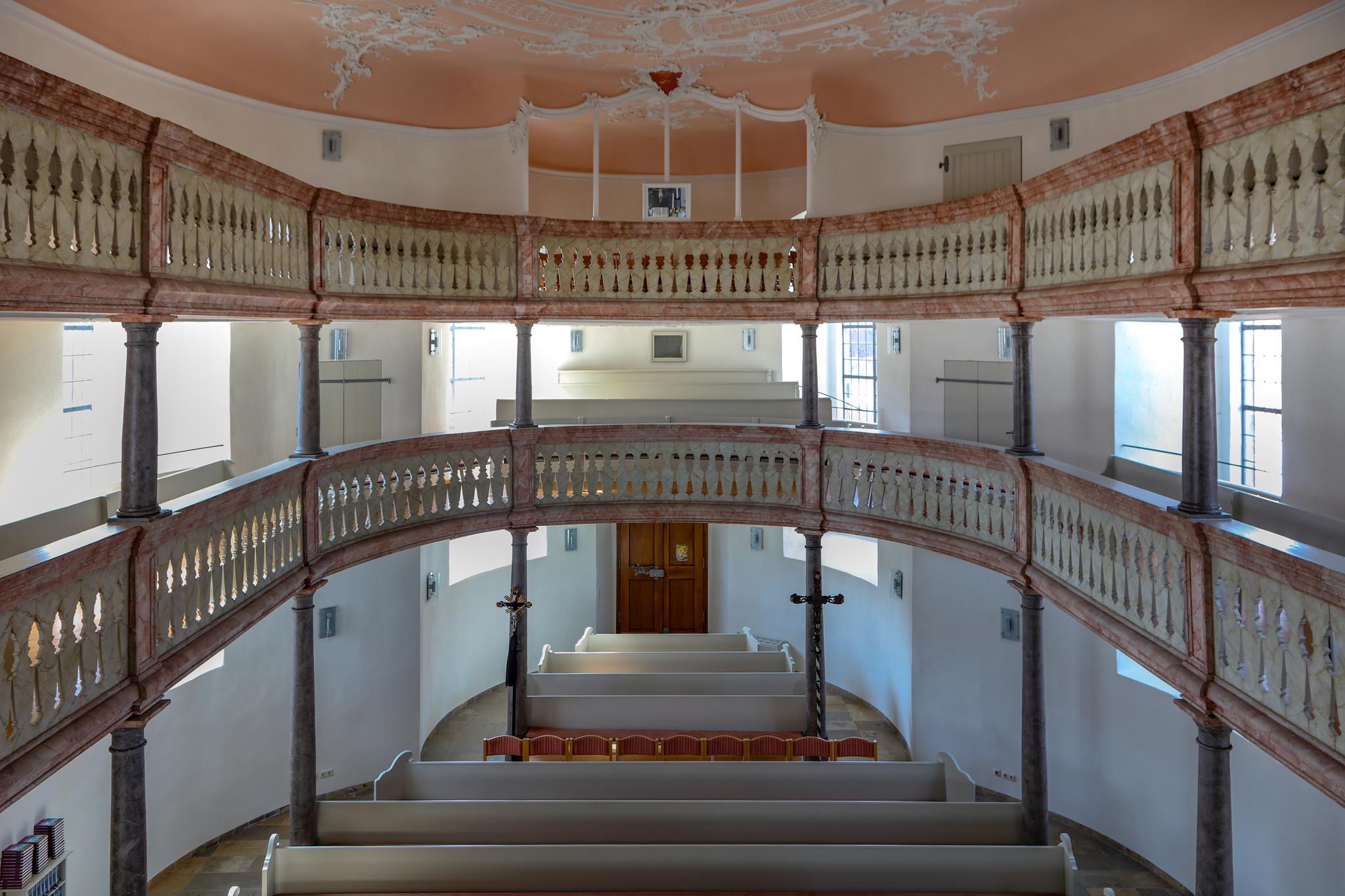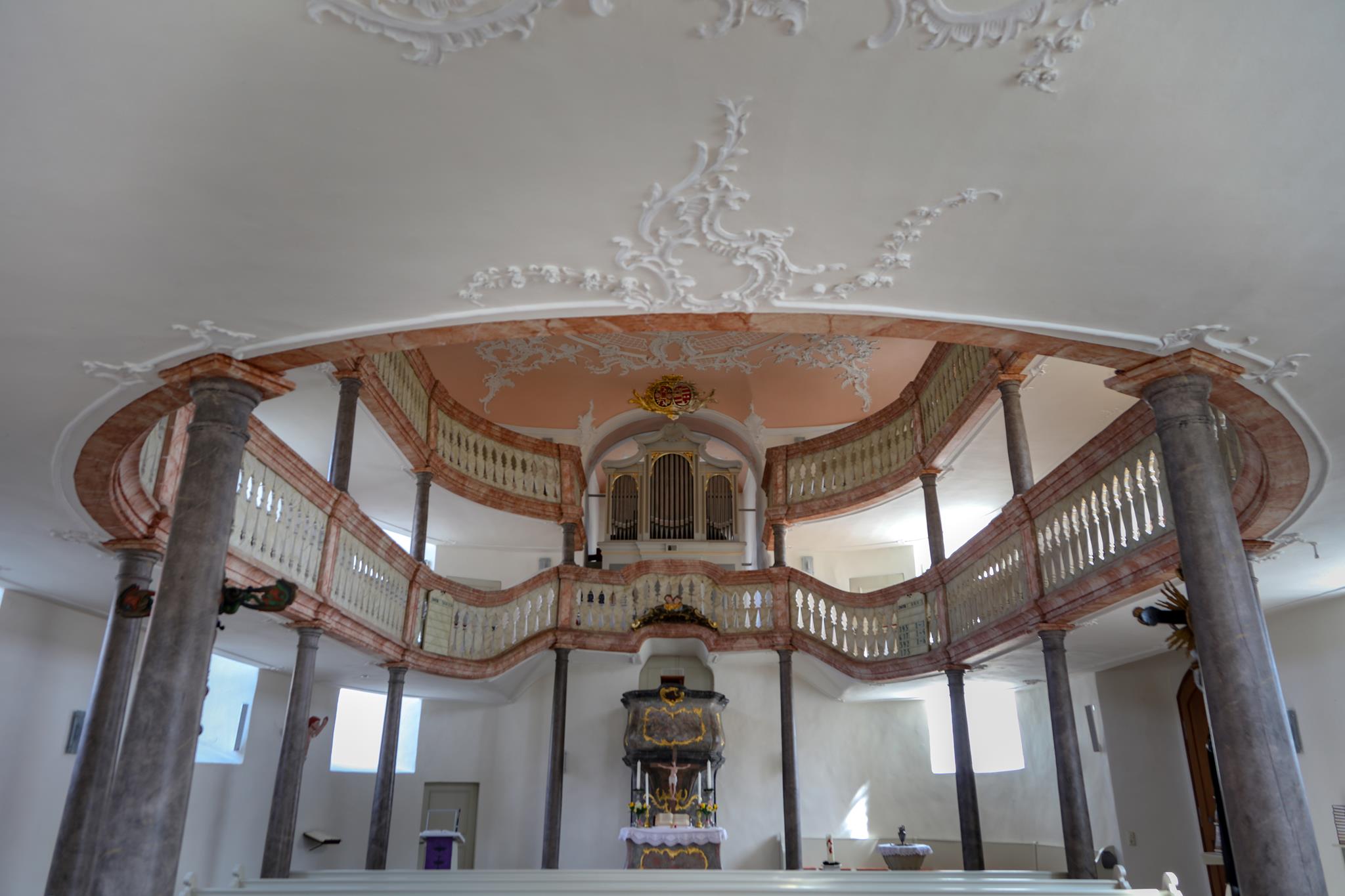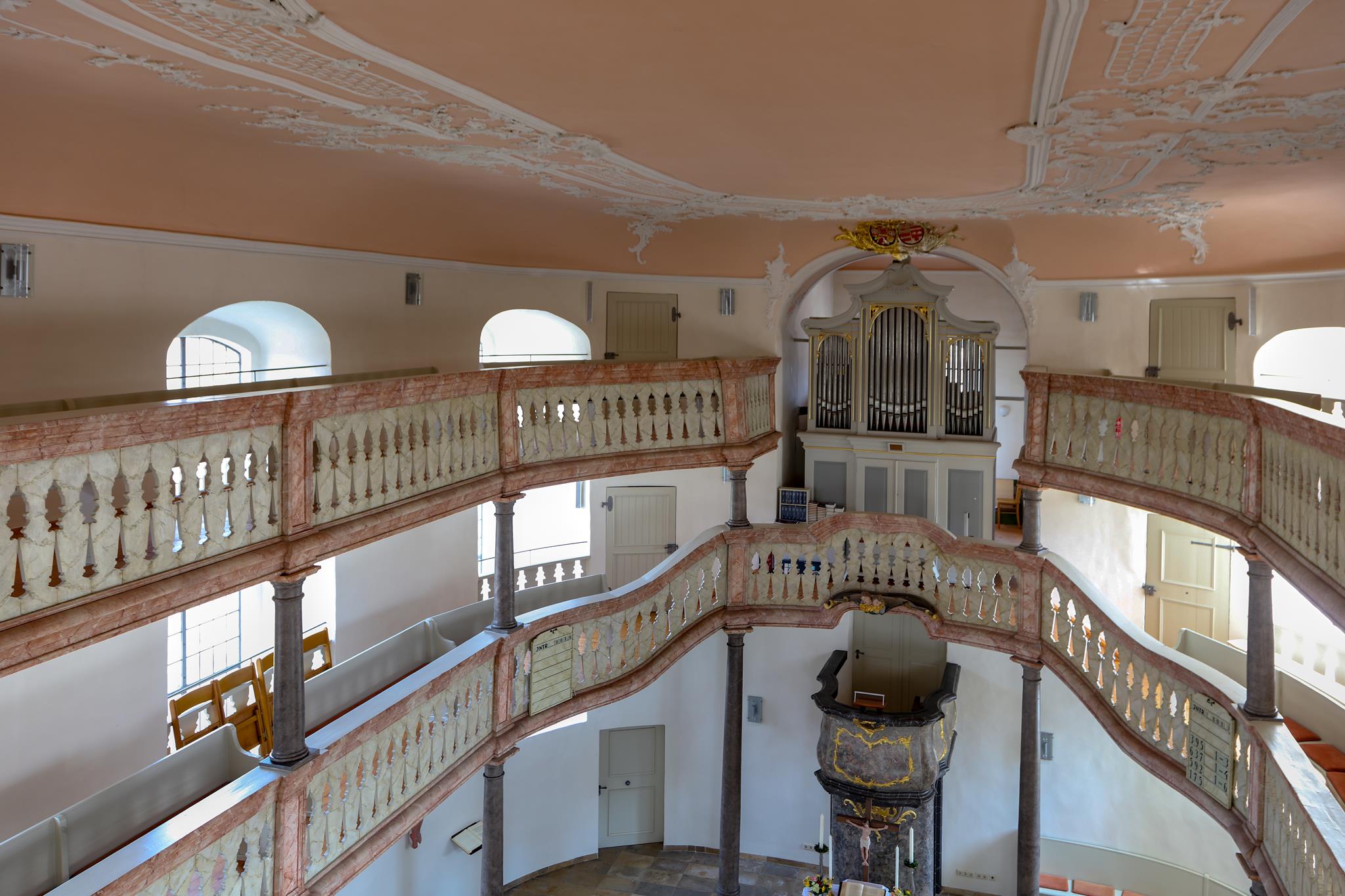 Obě galerie s mramorovým zábradlím se elegantně vznášejí v oválném prostoru kostela. Horní galerie rámuje varhany, které se tyčí nad oltářem a kazatelnou. Spodní galerie se klene nad kazatelnou a zdůrazňuje tak místo kázání. Oltář a kazatelna z šedého štukového mramoru stojí za sebou, je to stará forma kazatelnového oltáře. Nad světlým prostorem s bílými stěnami a velkými okny se klene štukový strop, mistrovské dílo v rokokovém slohu. Zdobí ho bílé ornamenty na růžovém pozadí. V obrazových znázorněních můžeme vidět hlavy andělů nad kazatelnou, ženskou tvář na spodní straně zadní galerie a procesní kříž z roku 1750, z novější doby pak oltářní kříž a Vzkříšeného s taneční lehkostí – obojí od bamberského umělce R. Bauer-Haderleina.