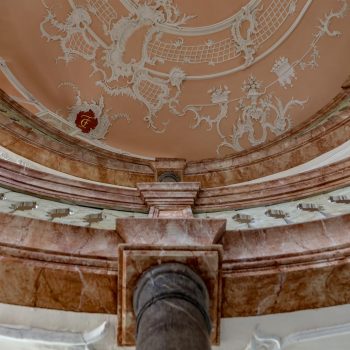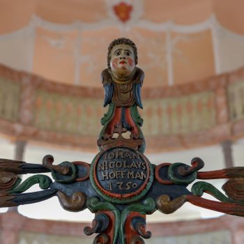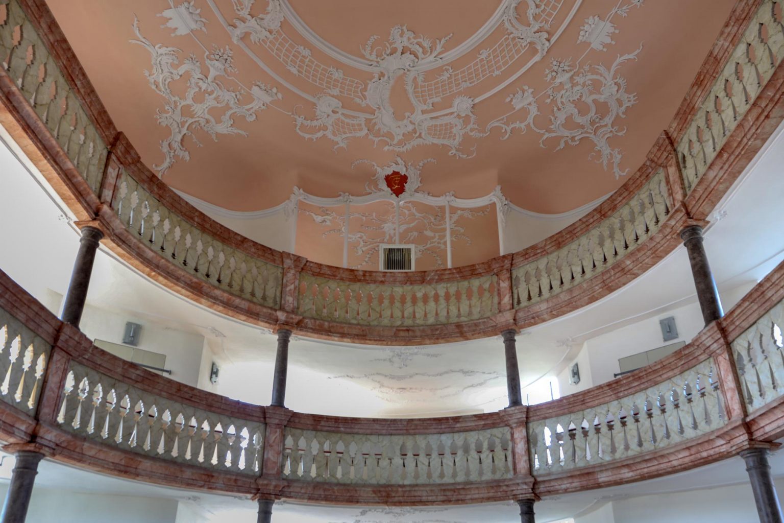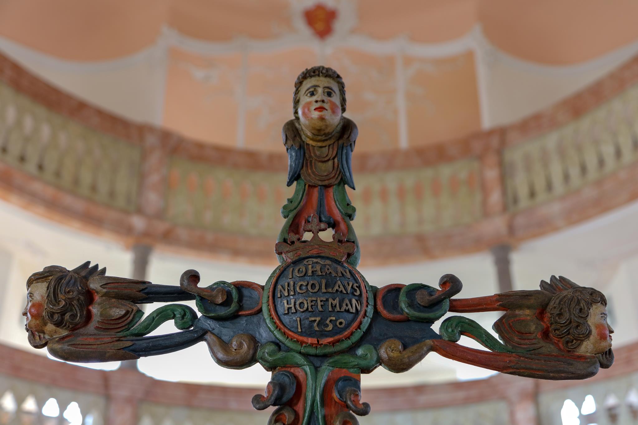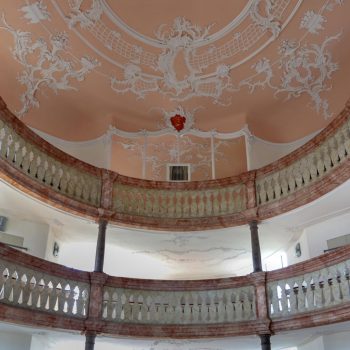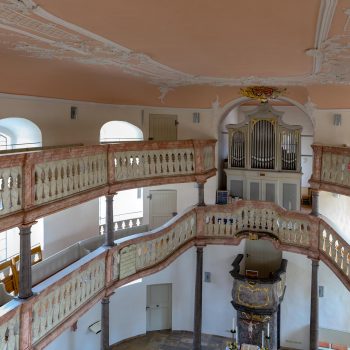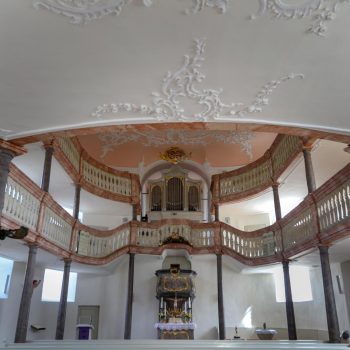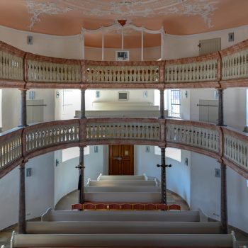 Obě galerie s mramorovým zábradlím se elegantně vznášejí v oválném prostoru kostela. Horní galerie rámuje varhany, které se tyčí nad oltářem a kazatelnou. Spodní galerie se klene nad kazatelnou a zdůrazňuje tak místo kázání. Oltář a kazatelna z šedého štukového mramoru stojí za sebou, je to stará forma kazatelnového oltáře. Nad světlým prostorem s bílými stěnami a velkými okny se klene štukový strop, mistrovské dílo v rokokovém slohu. Zdobí ho bílé ornamenty na růžovém pozadí. V obrazových znázorněních můžeme vidět hlavy andělů nad kazatelnou, ženskou tvář na spodní straně zadní galerie a procesní kříž z roku 1750, z novější doby pak oltářní kříž a Vzkříšeného s taneční lehkostí – obojí od bamberského umělce R. Bauer-Haderleina.