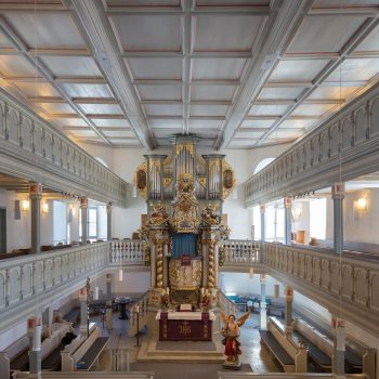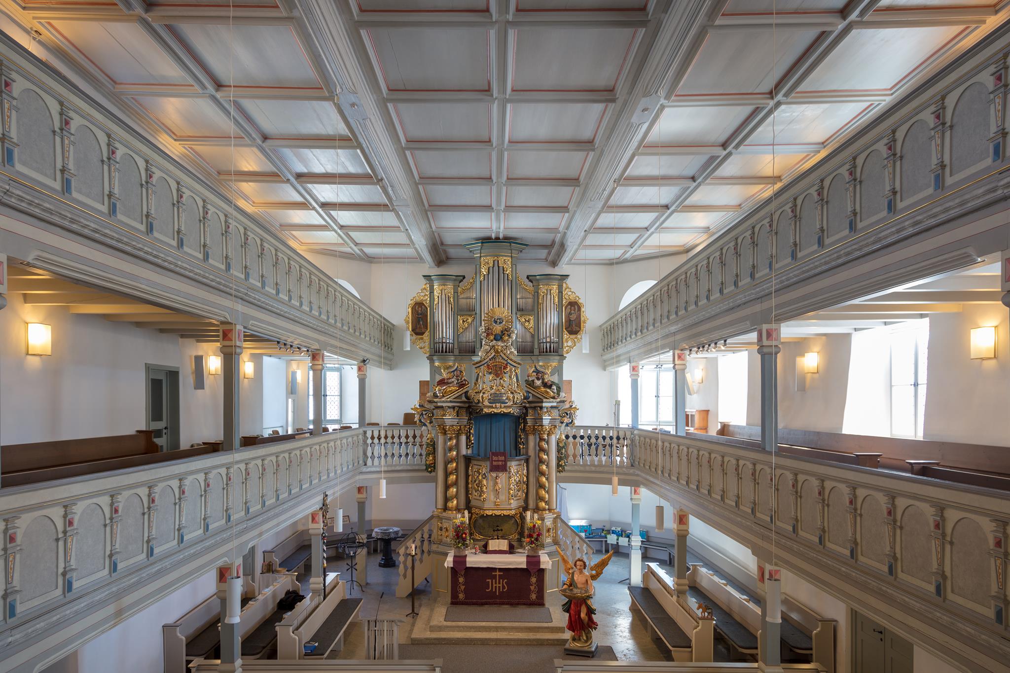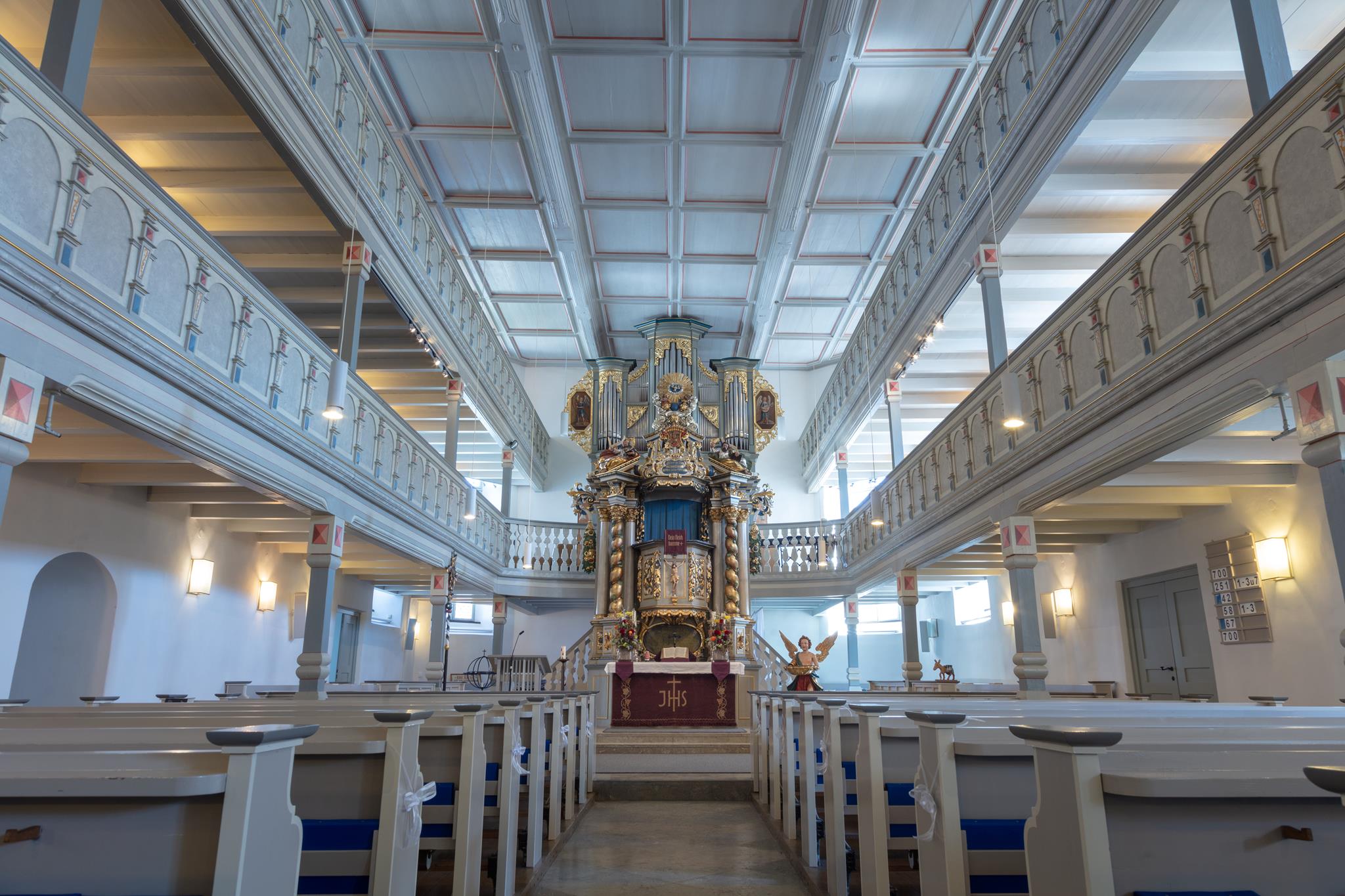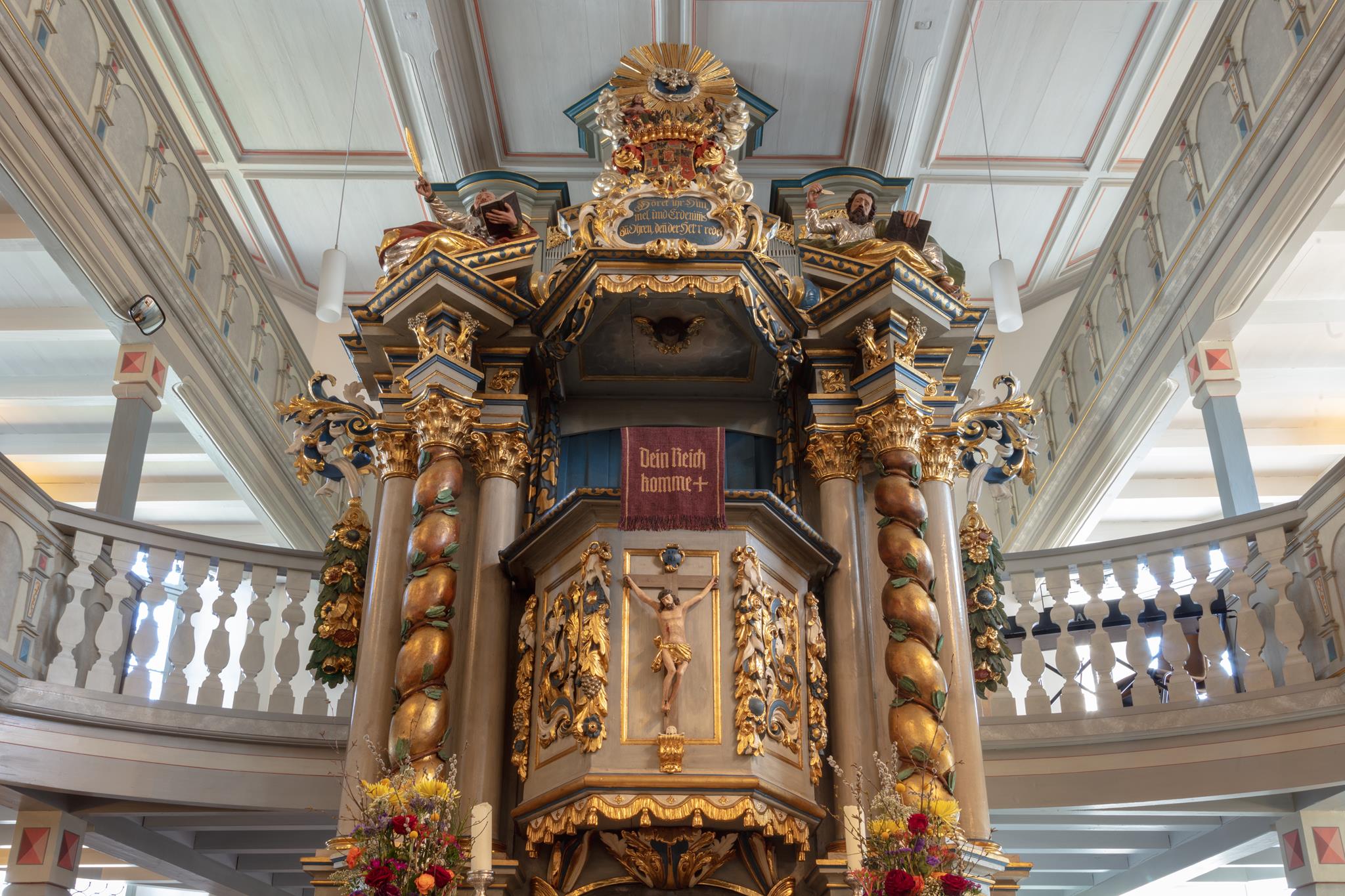 Oltář s vestavěnou kazatelnou a varhany nad ním přitahují vaše smysly. Ostatní interiér kostela je od renovace v r. 2012 naladěn ve světle šedých tónech, s bílým pozadím je celek oltářní stěny v barevném kontrastu. K tomu patří i anděl s křtitelnicí z dílny Johanna Nikolause Knolla (1722). O tři roky později pak jeho dílna vyrobila i oltář. Na stříšce kazatelny vyzývá nápis návštěvníky kostela, aby slyšeli Boží slovo. Nad erbem markraběte trůní trojjediný Bůh: Otec, Syn i Duch svatý ve figurálním zobrazení. I barokní varhany z dílny Heidenreich včetně měchů (v krovech) z roku 1768 se v originální podobě dochovaly dodnes.