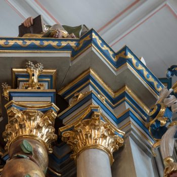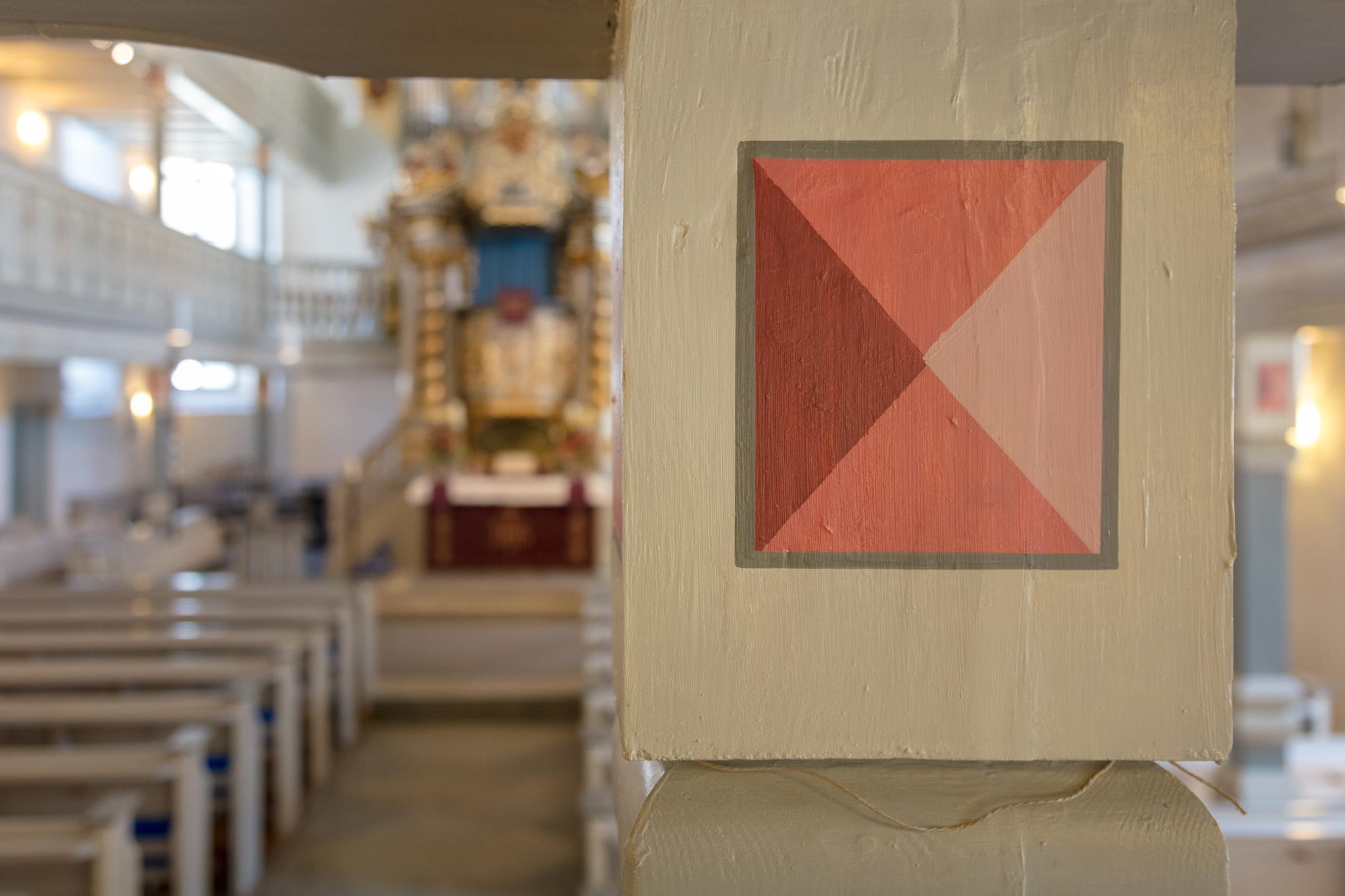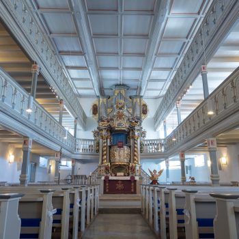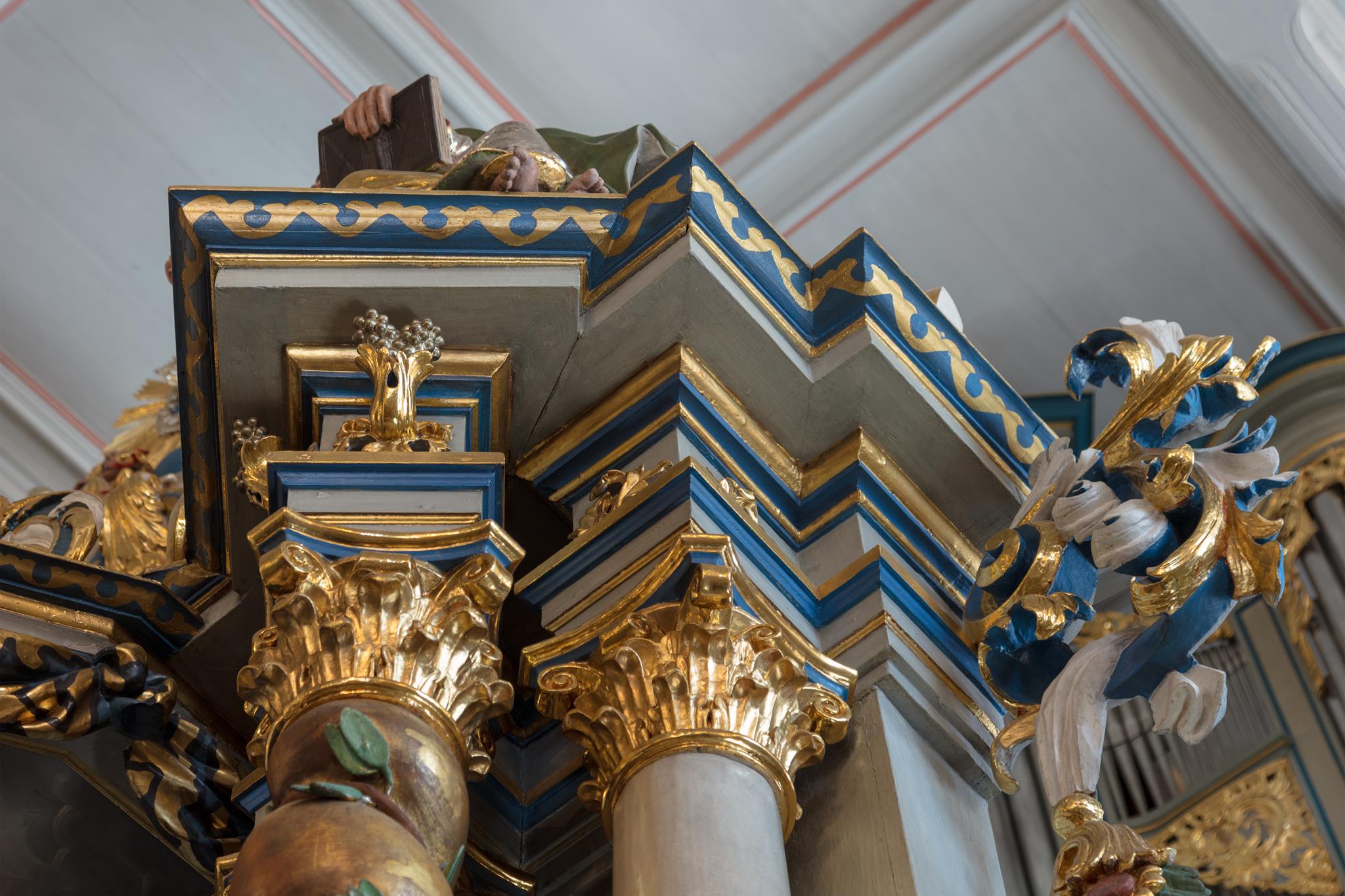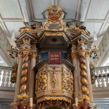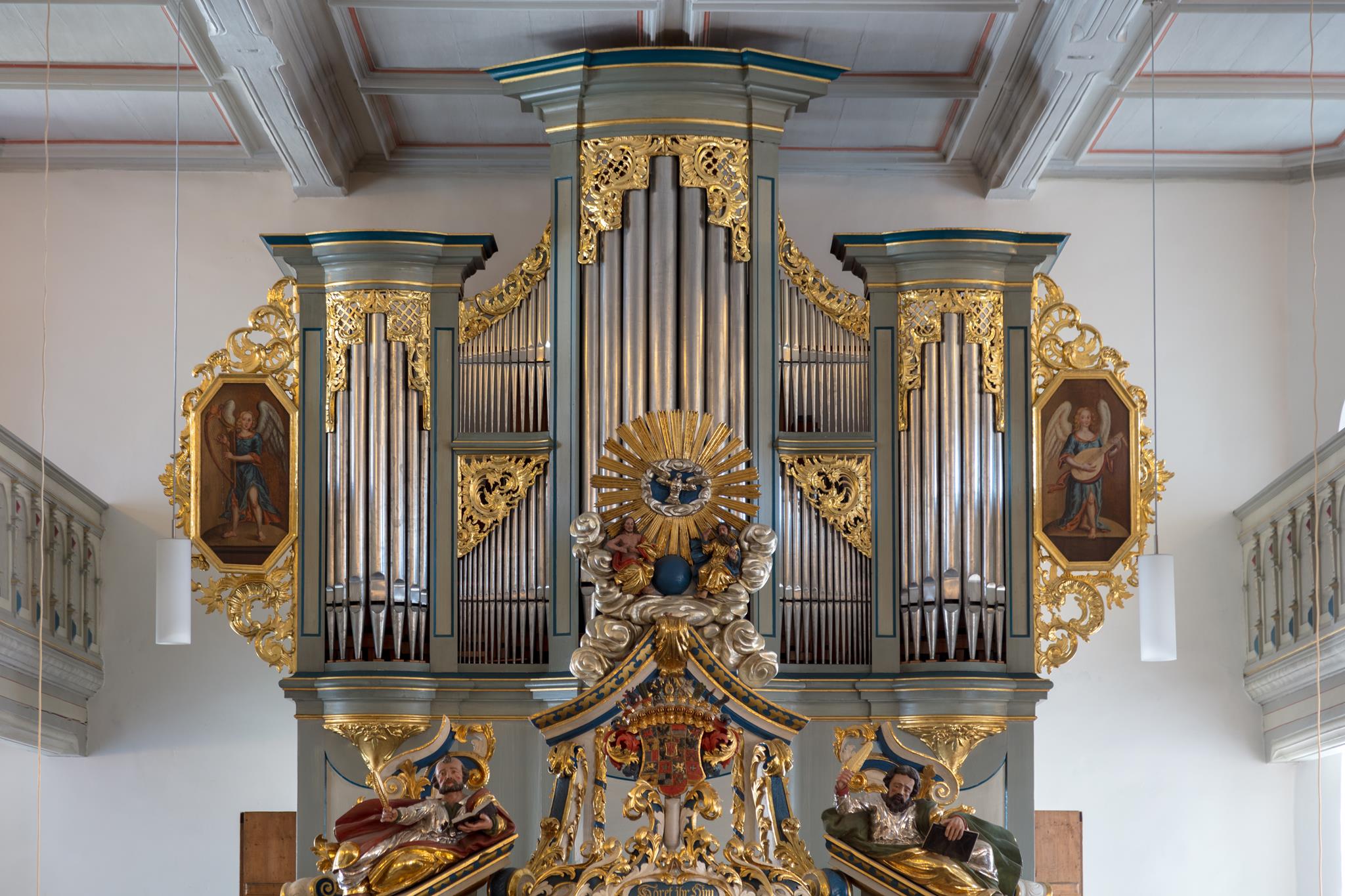Oltář s vestavěnou kazatelnou a varhany nad ním přitahují vaše smysly. Ostatní interiér kostela je od renovace v r. 2012 naladěn ve světle šedých tónech, s bílým pozadím je celek oltářní stěny v barevném kontrastu. K tomu patří i anděl s křtitelnicí z dílny Johanna Nikolause Knolla (1722). O tři roky později pak jeho dílna vyrobila i oltář. Na stříšce kazatelny vyzývá nápis návštěvníky kostela, aby slyšeli Boží slovo. Nad erbem markraběte trůní trojjediný Bůh: Otec, Syn i Duch svatý ve figurálním zobrazení. I barokní varhany z dílny Heidenreich včetně měchů (v krovech) z roku 1768 se v originální podobě dochovaly dodnes.