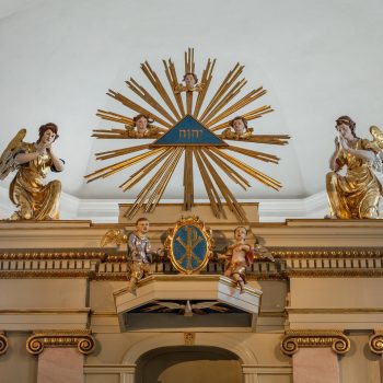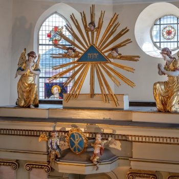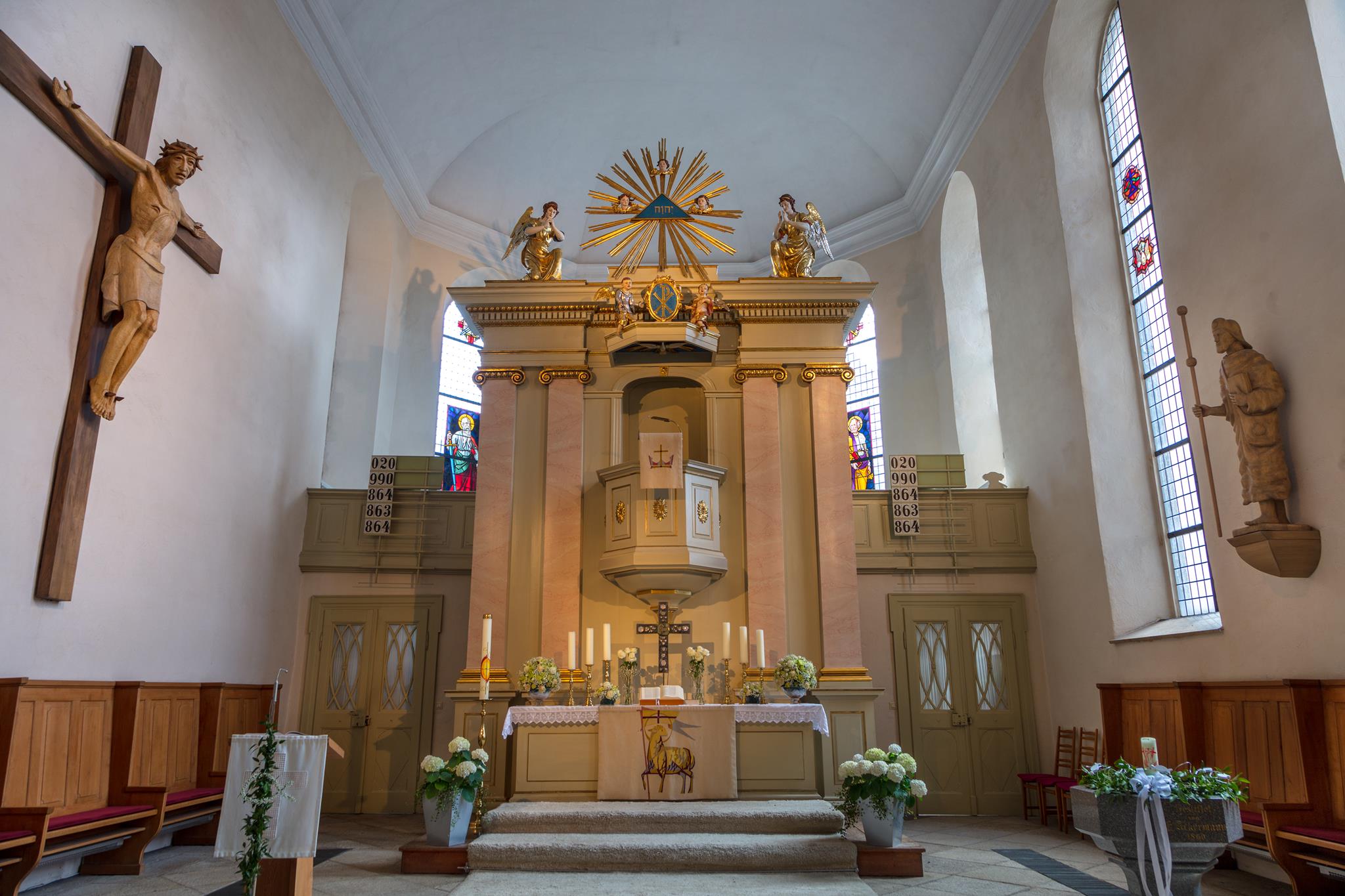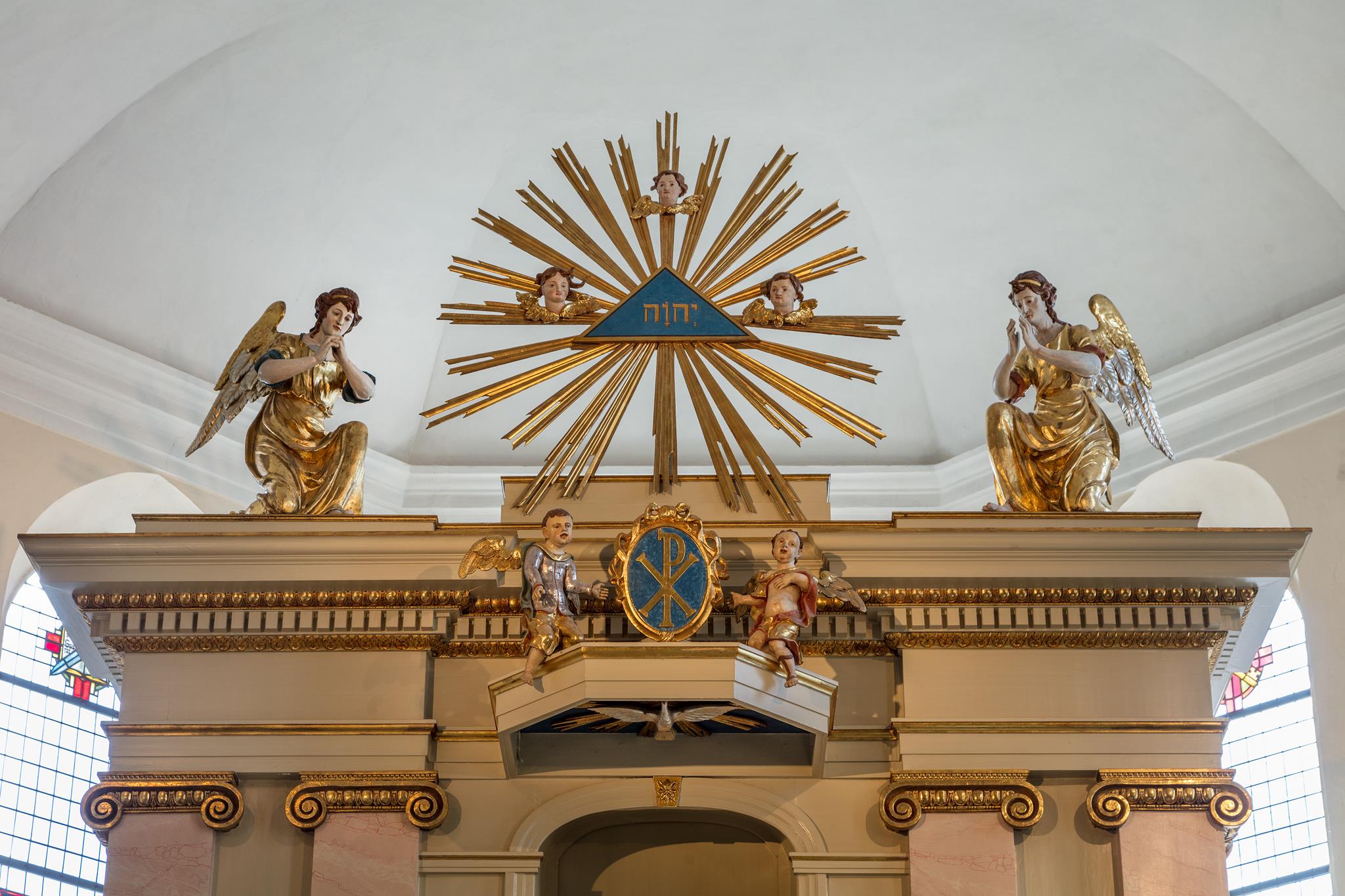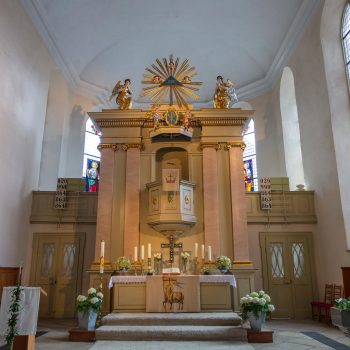 Mezi dvěma rohovými páry sloupů vyčnívá nad stolem Páně kazatelna. Na modré spodní straně stříšky kazatelny sestupuje Duch svatý v podobě holubice. Oba andělé nedrží erb ani iniciály nejvyššího světského patrona (to by byl bavorský král), nýbrž monogram Kristův. Zlatá svatozář nad tím osvětluje trojúhelník jako symbol trojjediného Boha. Oba velcí klečící andělé k tomu možná přibyli až později, ale přesto se dobře hodí k uctívání Nejsvětější Trojice.