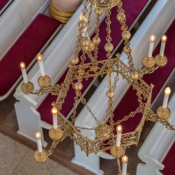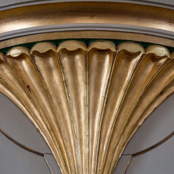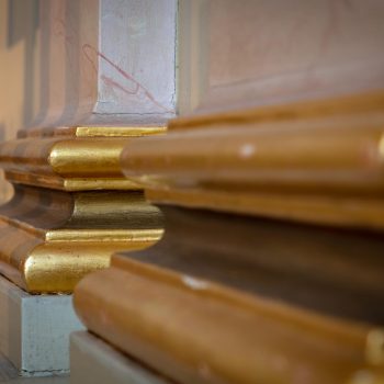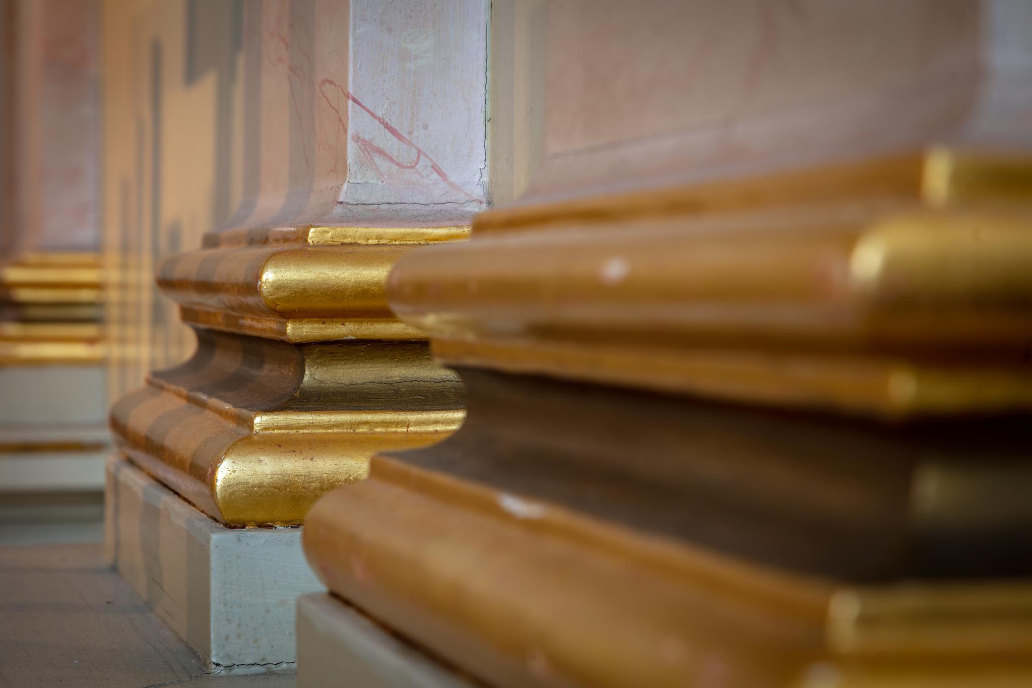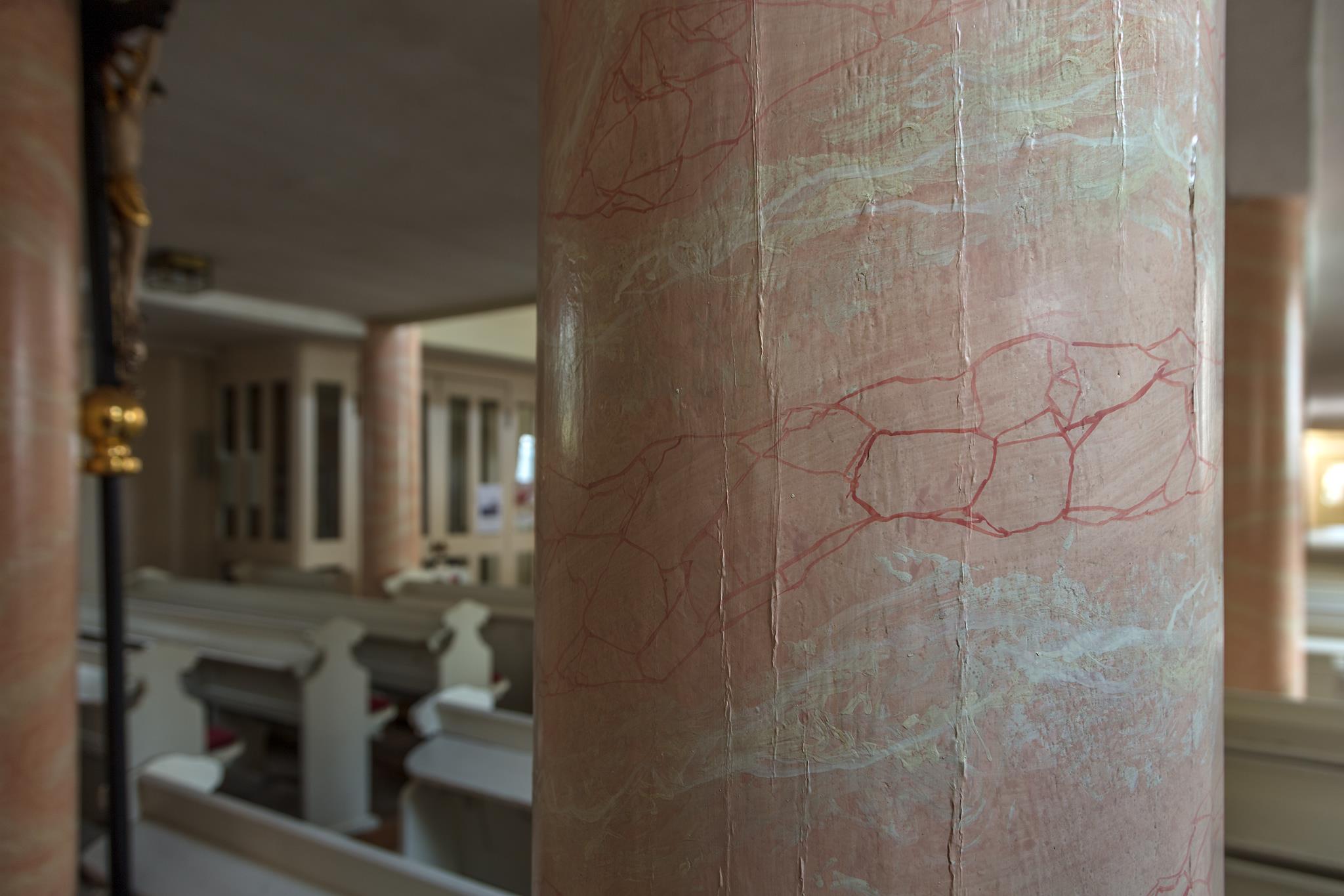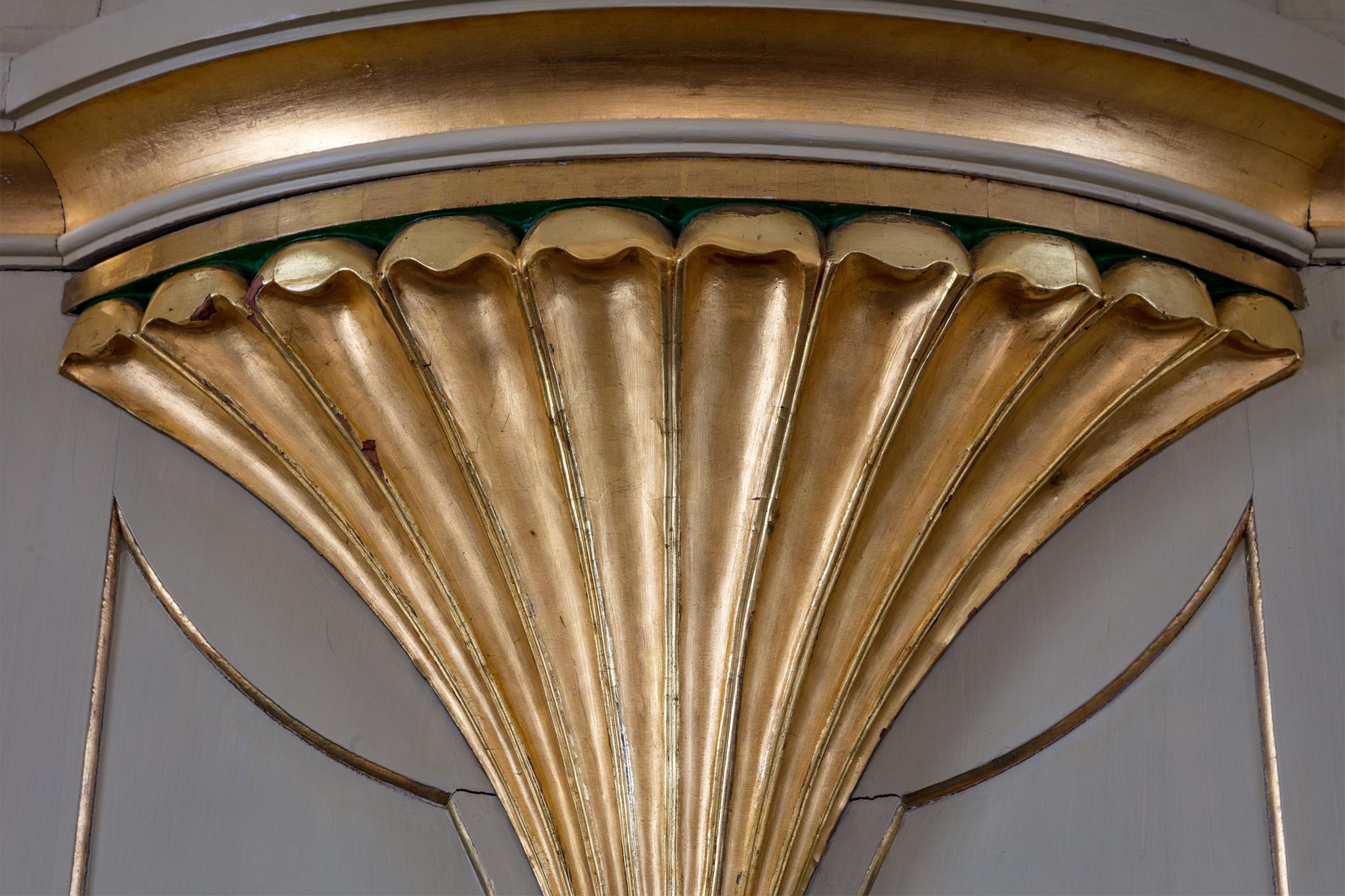 Mezi dvěma rohovými páry sloupů vyčnívá nad stolem Páně kazatelna. Na modré spodní straně stříšky kazatelny sestupuje Duch svatý v podobě holubice. Oba andělé nedrží erb ani iniciály nejvyššího světského patrona (to by byl bavorský král), nýbrž monogram Kristův. Zlatá svatozář nad tím osvětluje trojúhelník jako symbol trojjediného Boha. Oba velcí klečící andělé k tomu možná přibyli až později, ale přesto se dobře hodí k uctívání Nejsvětější Trojice.