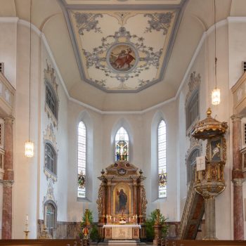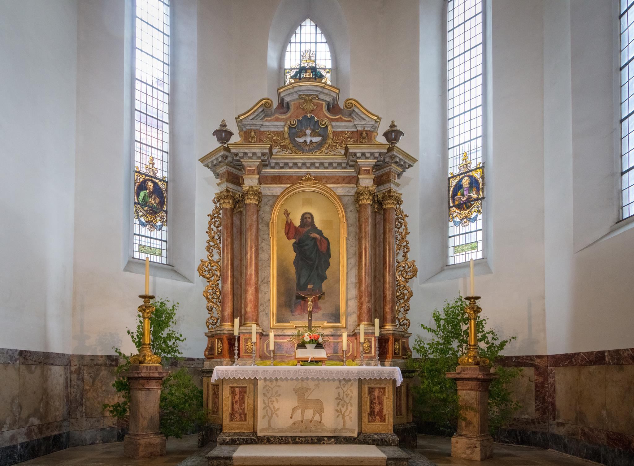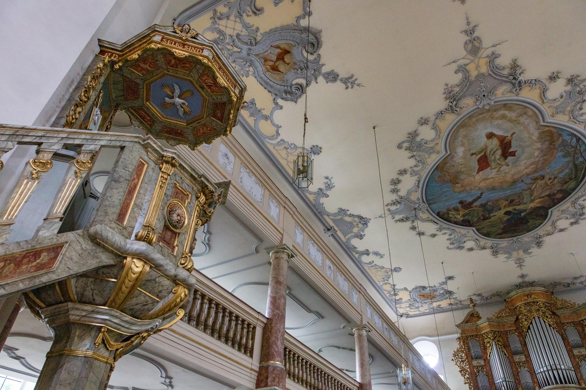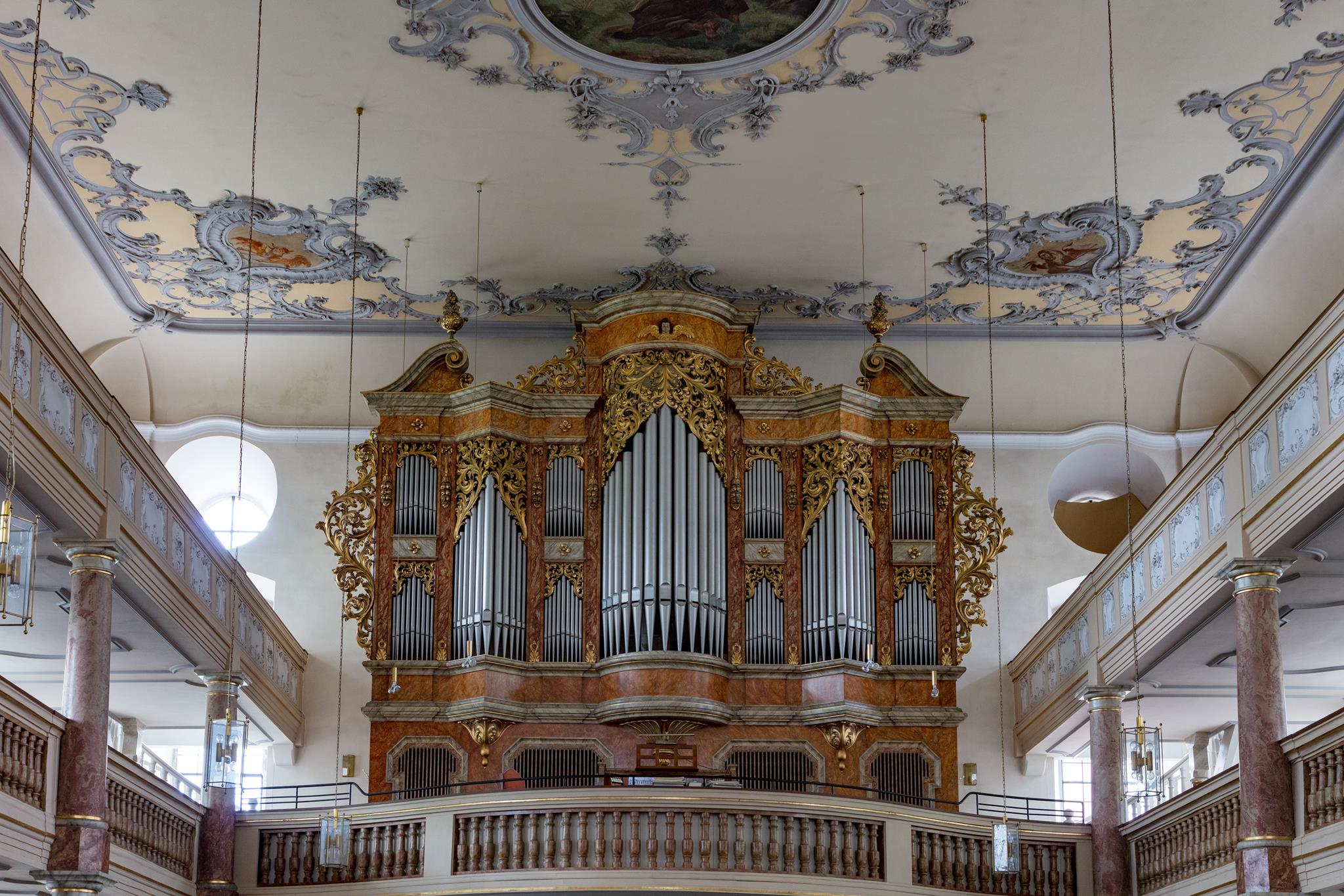 Při rekonstrukci v letech 1904/05 byl interiér kostela přizpůsoben původnímu baroknímu vzhledu: dvoupatrové galerie, velké varhany v bohatě zdobené skříni, nástropní malby se znázorněním nanebevstoupení Krista uprostřed a umělecká štuková výzdoba. Při renovaci v r. 1954 byl kostel barevně adaptován podle vzhledu, jak vypadal při vysvěcení v r. 1739. Dnes tedy vypadá stejně jako jeho někdejší velký a nádherný markrabský předchůdce.