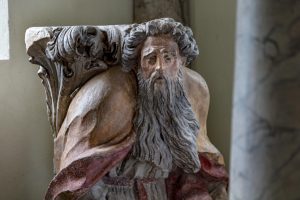 second book of Moses, God himself handed these to Moses when he made a covenant with the people of Israel on Mt Sinai. Thus the tablets of the Ten Commandments have become a sign of this covenant: God chooses Israel to be His people. In the Christian churches, Moses plays the role of a forerunner: the ‘Old Covenant’ points to the ‘New Covenant’, which God has made through Jesus Christ. Moses is often shown with two little horns on his head. This can traced to an error in translation: it is said that his face shone when he had encountered God and came down from the mountain. In the Latin translation the word used for ‘shining’ was ‘cornuta’ which also means ‘horned’ and the little horns came from this.(picture: Moses by Elias Räntz, former pulpit base in Holy Trinity Church, Bad Berneck)