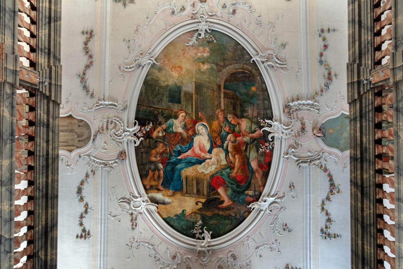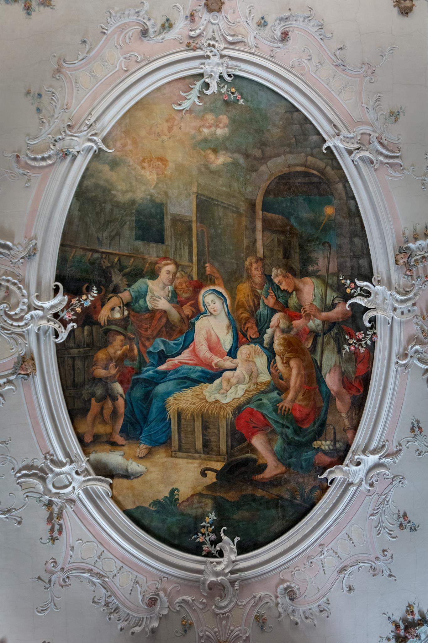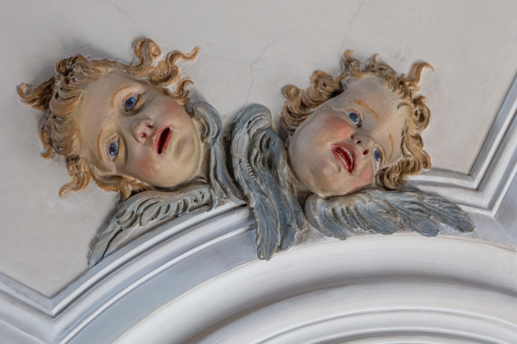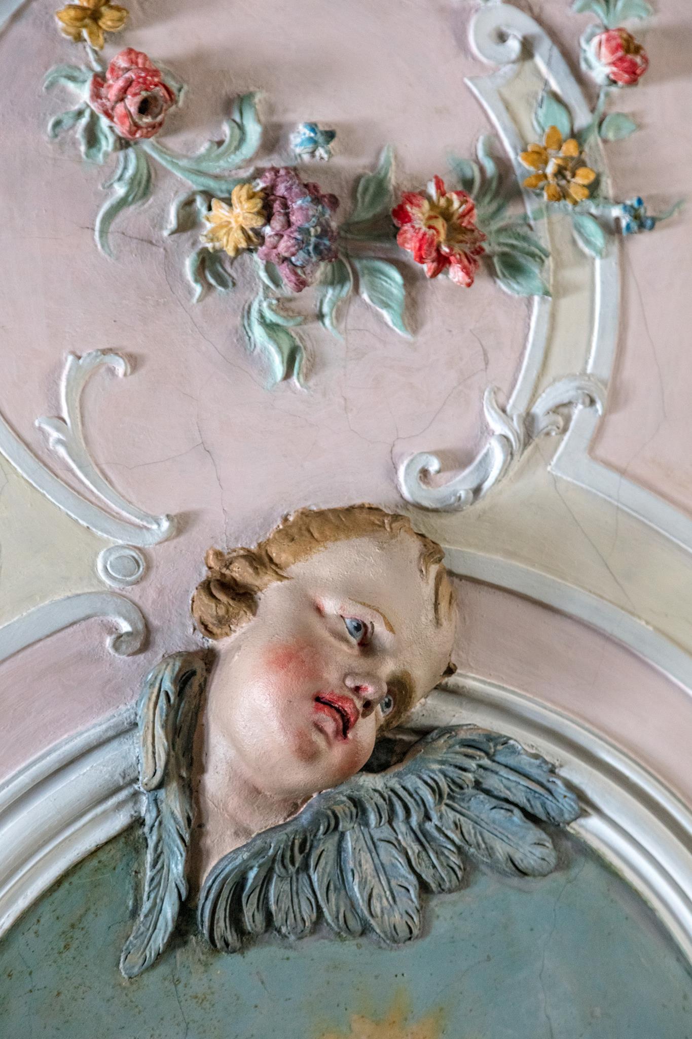 The stucco ceiling made by the court stucco artist J.F.Andreioli is a particularly notable work of art: angels, flowers and rich ornamentation surround the oval ceiling painting of the Nativity. The inscription with the coat of arms of the donor is now on the door on the left, near the altar, where in former times the inhabitants could come in easily, when they used to come to church twice a day for prayers.