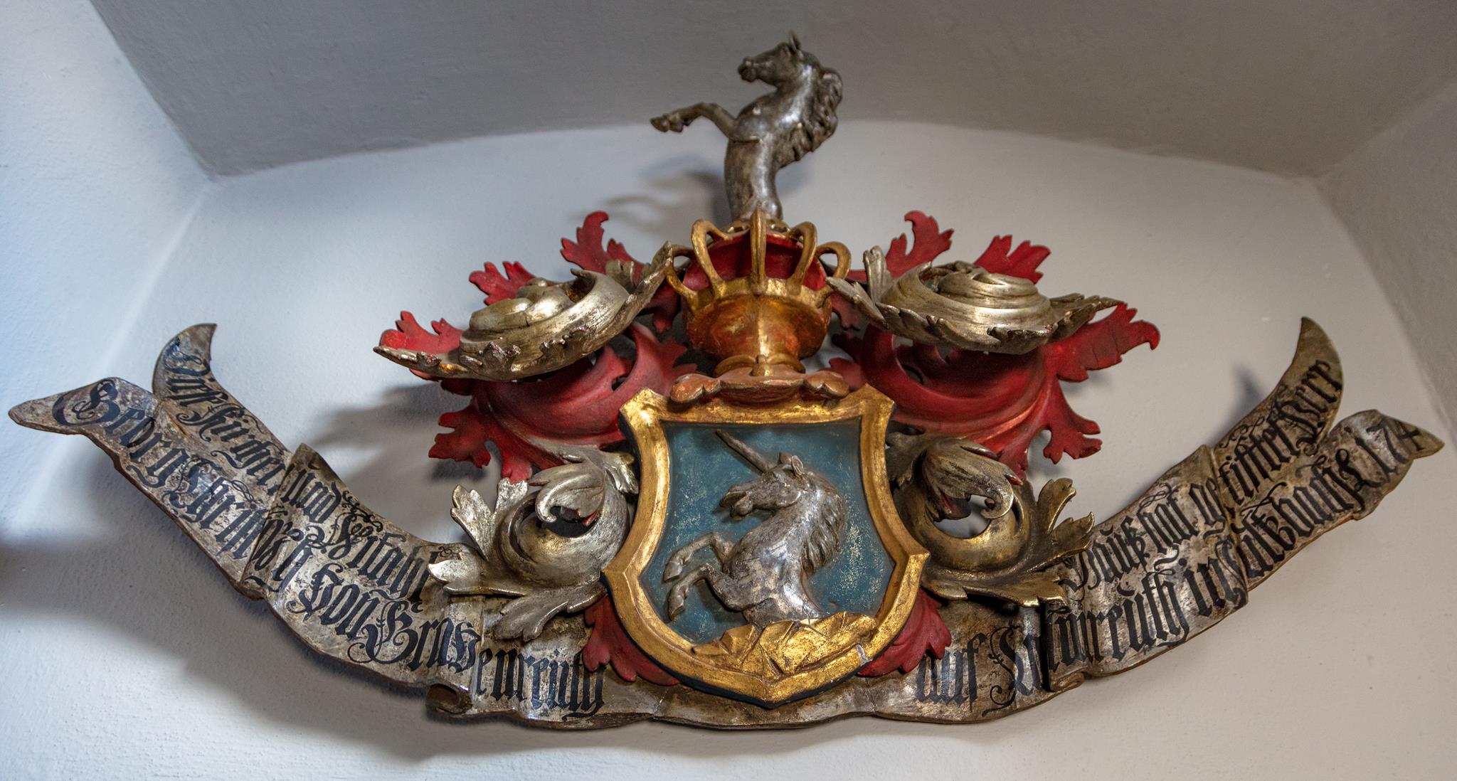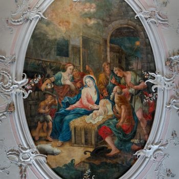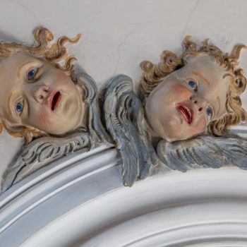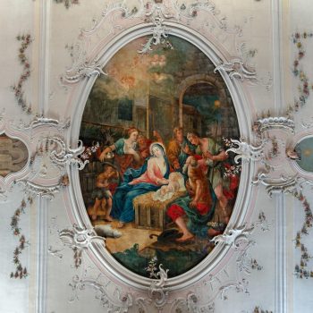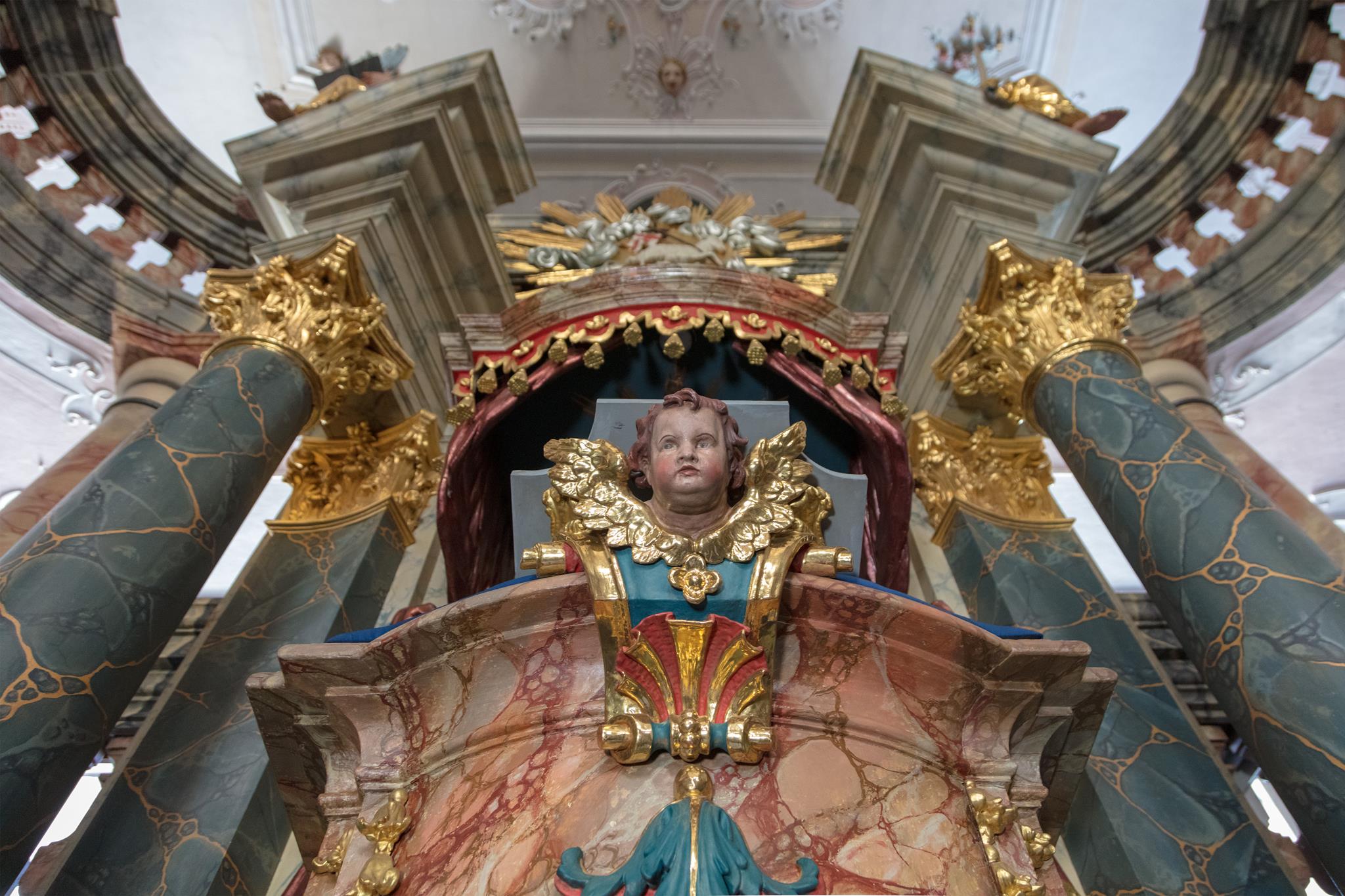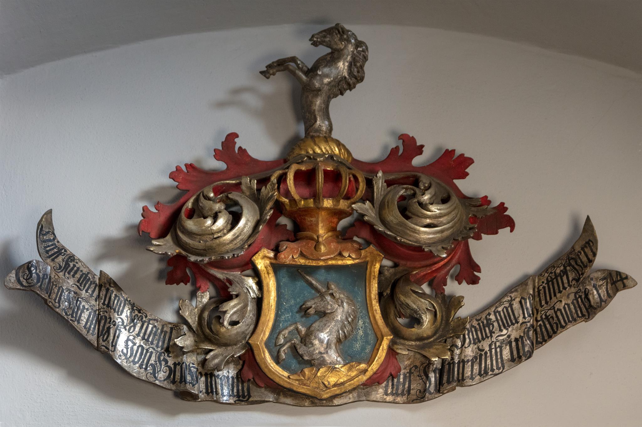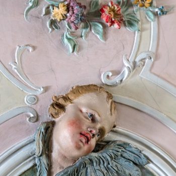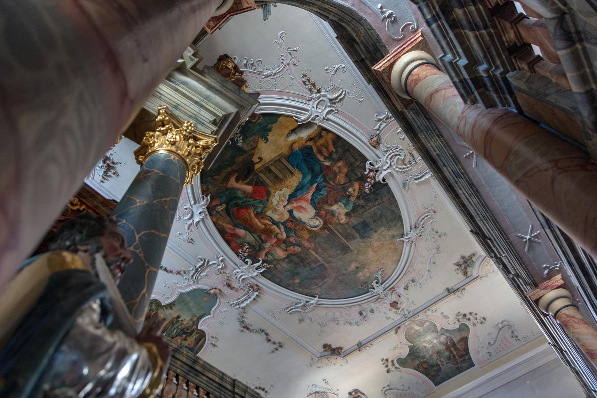 The stucco ceiling made by the court stucco artist J.F.Andreioli is a particularly notable work of art: angels, flowers and rich ornamentation surround the oval ceiling painting of the Nativity. The inscription with the coat of arms of the donor is now on the door on the left, near the altar, where in former times the inhabitants could come in easily, when they used to come to church twice a day for prayers.