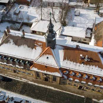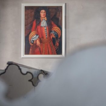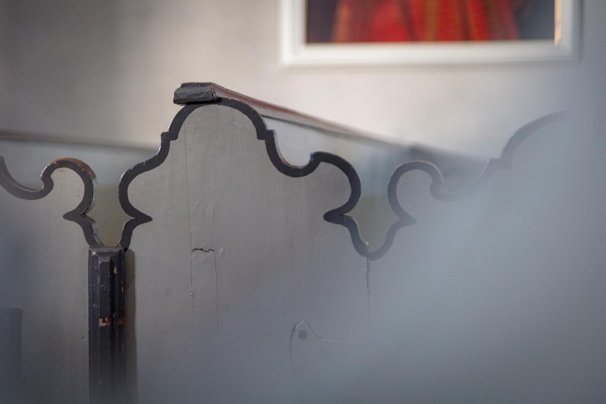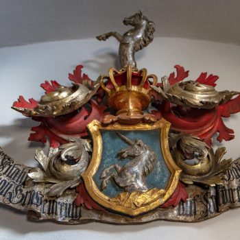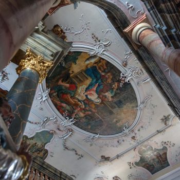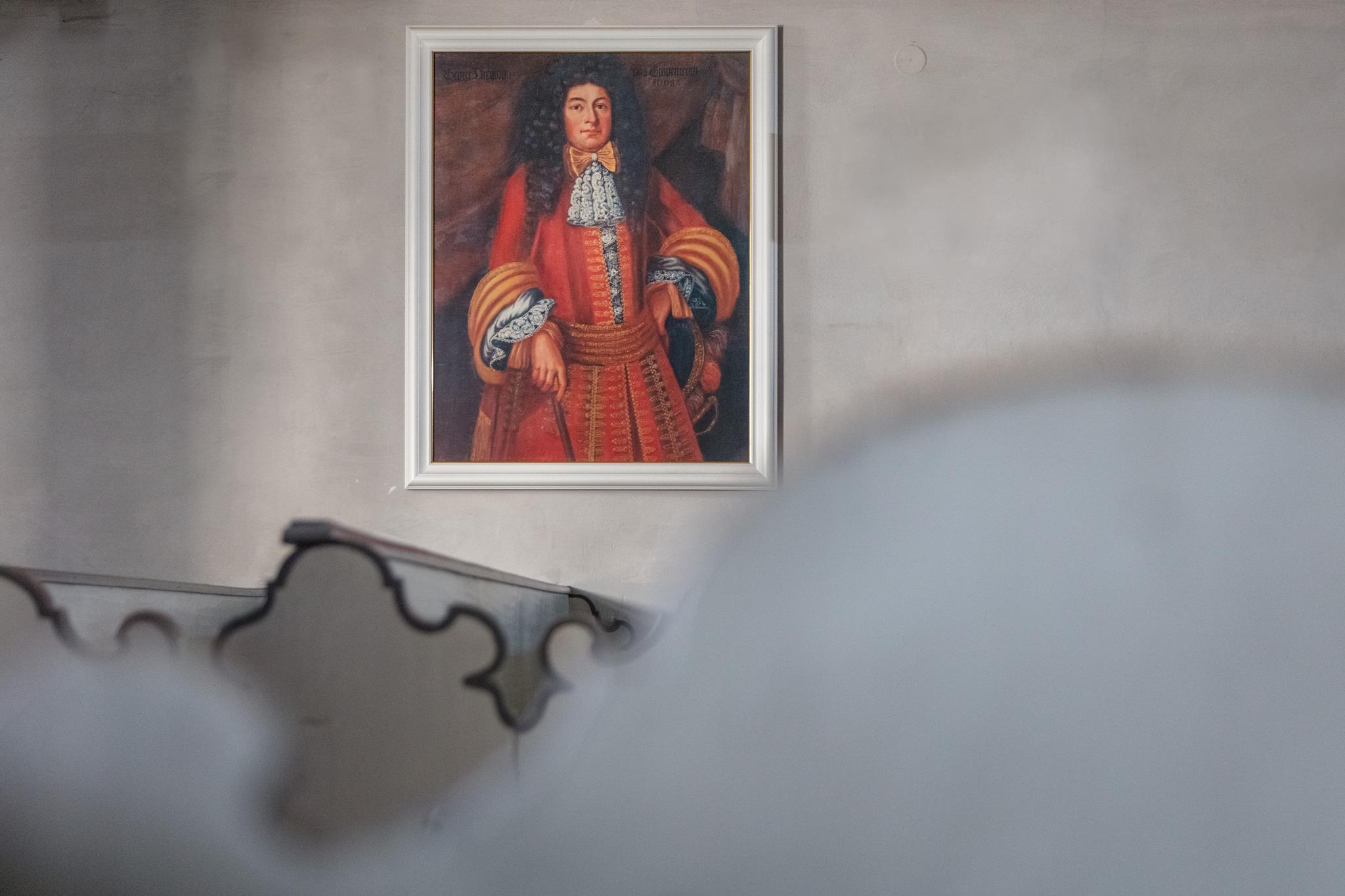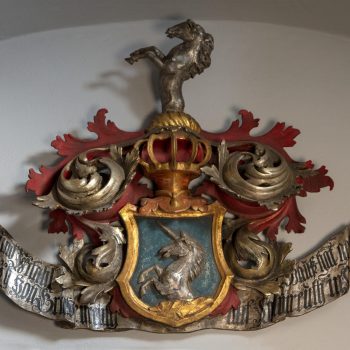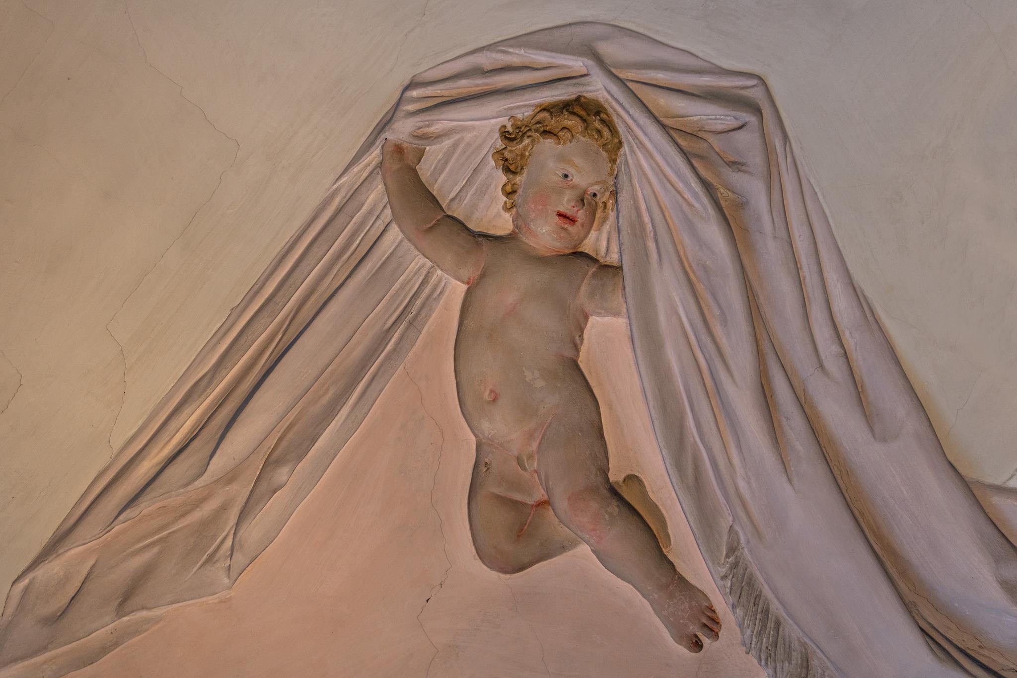The stucco ceiling made by the court stucco artist J.F.Andreioli is a particularly notable work of art: angels, flowers and rich ornamentation surround the oval ceiling painting of the Nativity. The inscription with the coat of arms of the donor is now on the door on the left, near the altar, where in former times the inhabitants could come in easily, when they used to come to church twice a day for prayers.