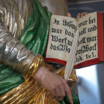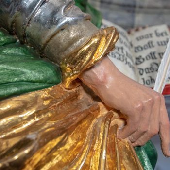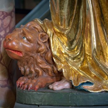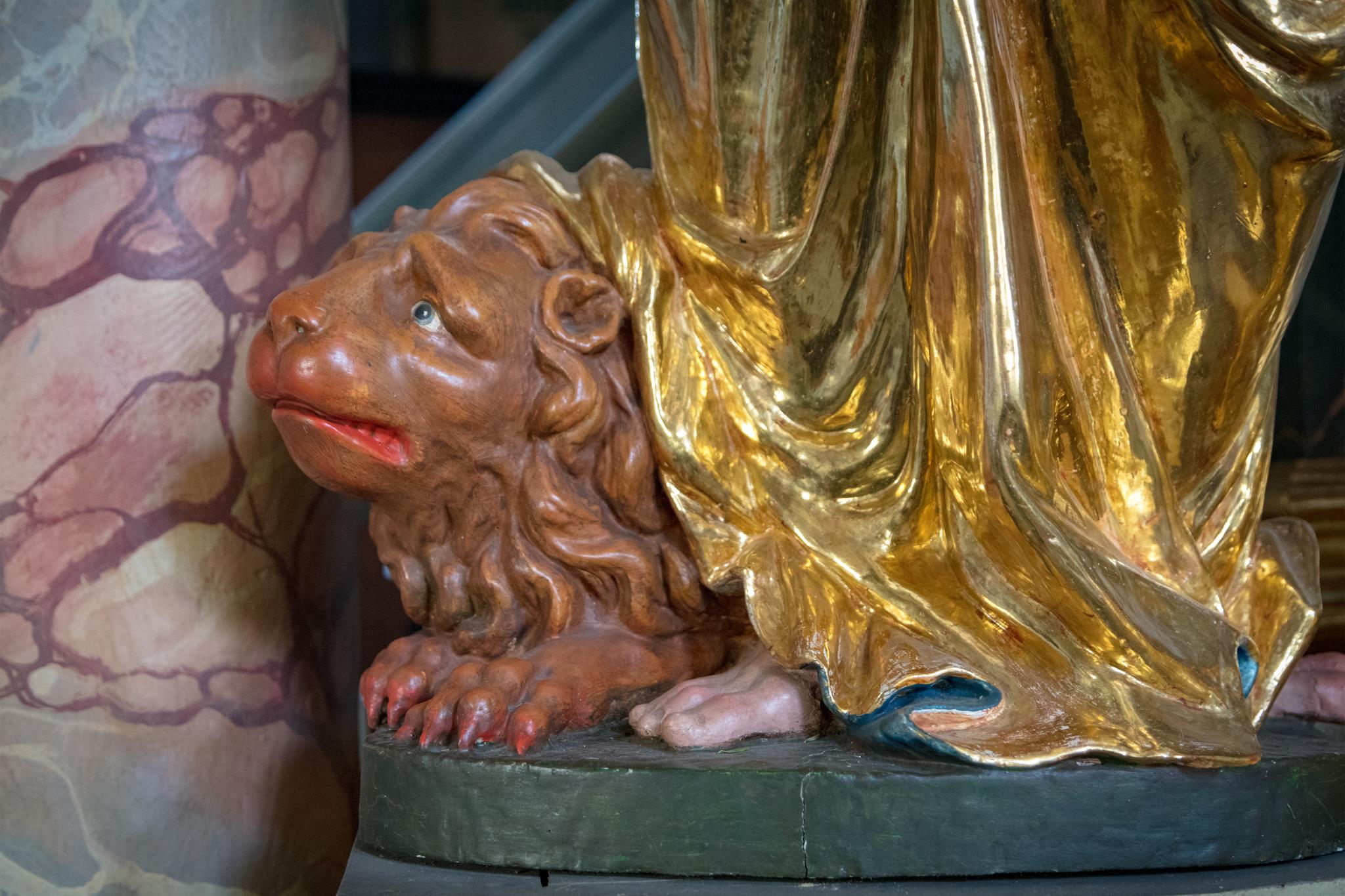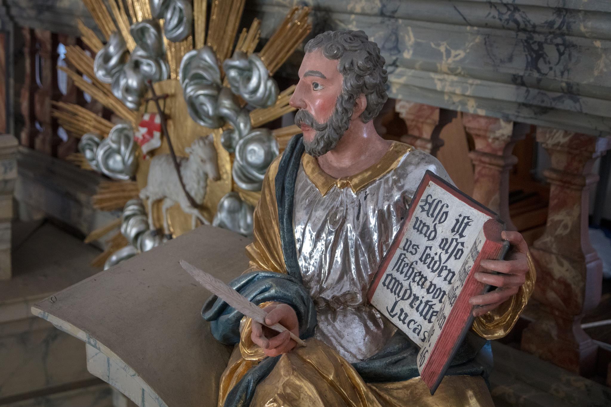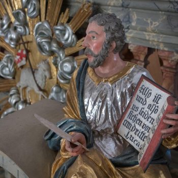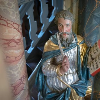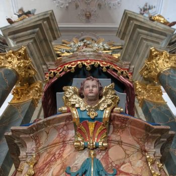 The pulpit altar, and the organ above it, is encircled by the two-storeyed galleries which run around the church. The four Evangelists, shining in gold and metallic colours and made by the then renowned sculptor J.J.Martini frame the altar. The curved pulpit, on a grey background, emerges from between green marbled pillars. Above, the Lamb of God is resplendent in a golden halo of rays of light.