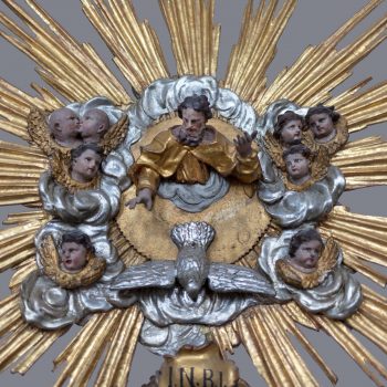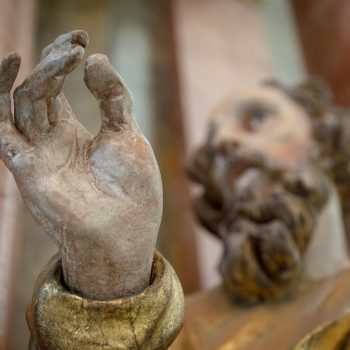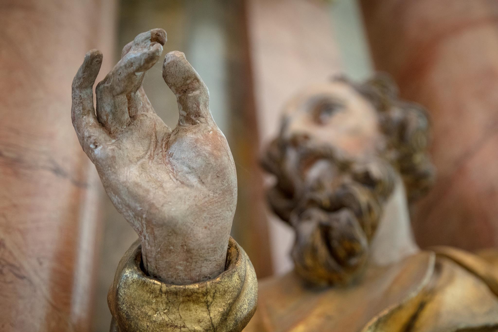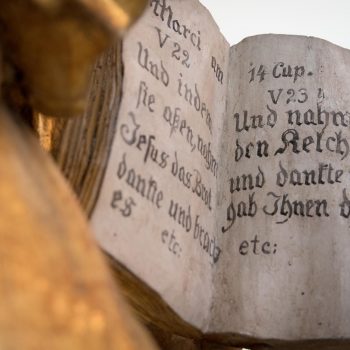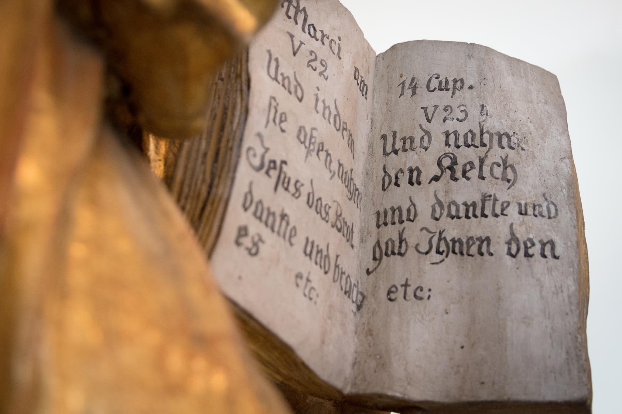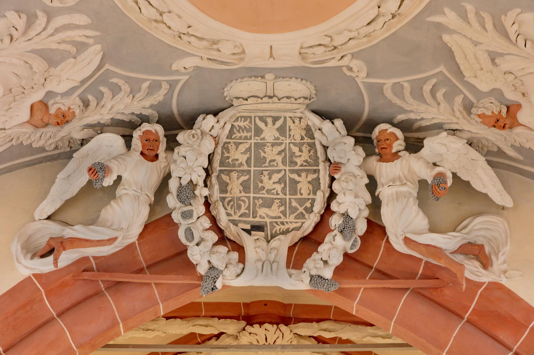 The angels on the ceiling of the church, far less delicate than those in the cloisters, are evidence of the baroque alterations. Margrave Christian Ernst had the church redesigned by his architect Antonio della Porta after 1698. The heavy stucco ceiling was made by Bernardo Quadri , whilst the pulpit altar with the four Evangelists is the work of the court sculptor Elias Räntz. They carry open books on which are written the words of communion. Compared to the angels on the altar, the figure of the risen Christ seems small.