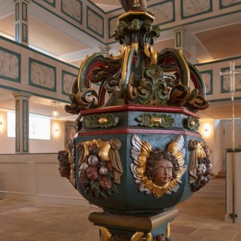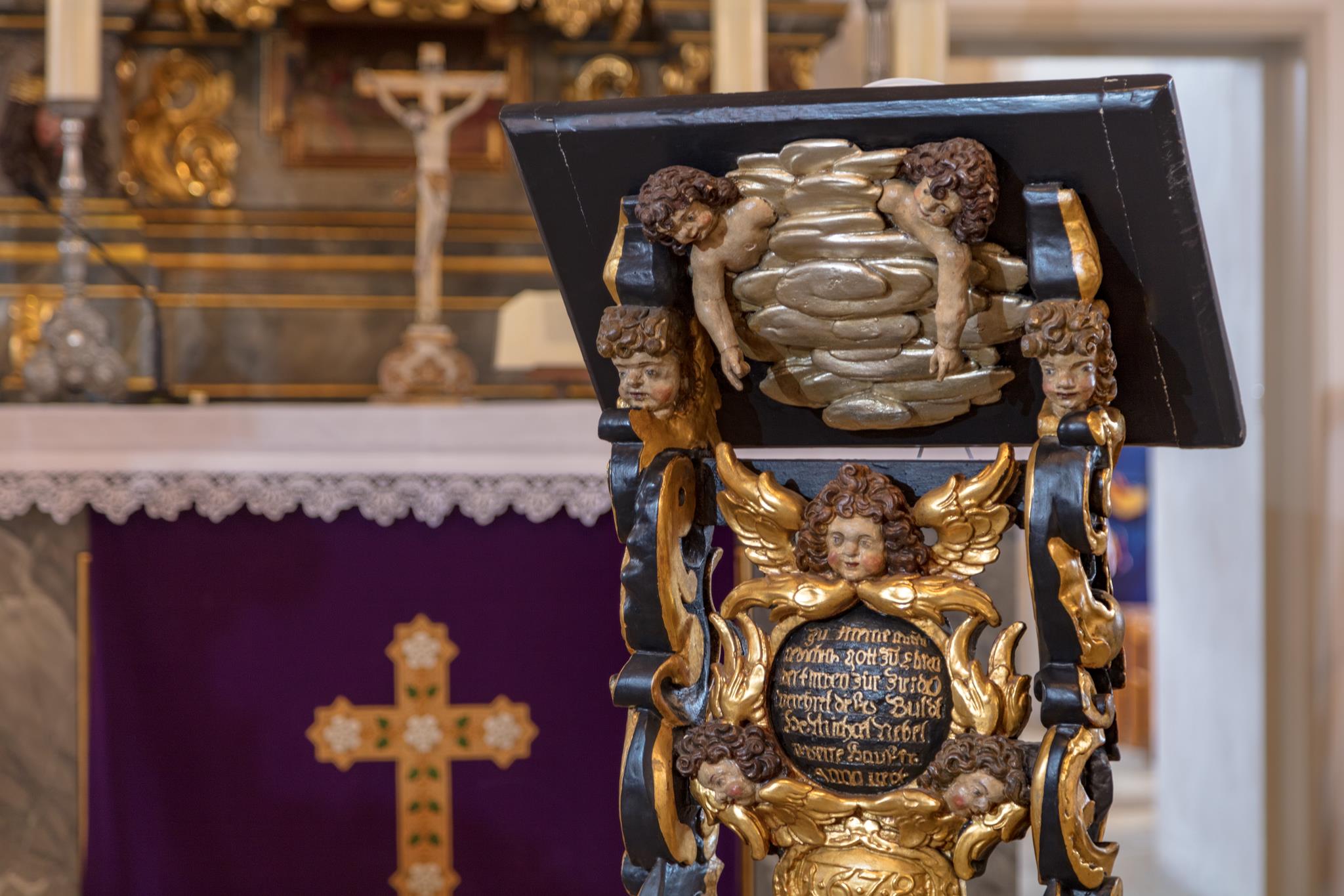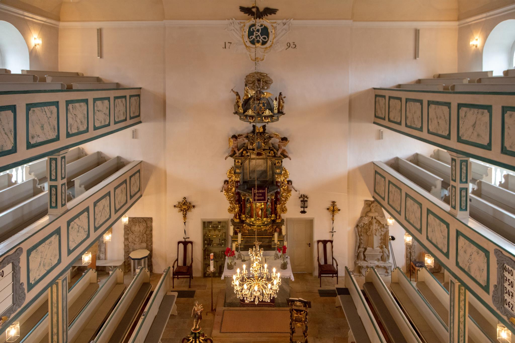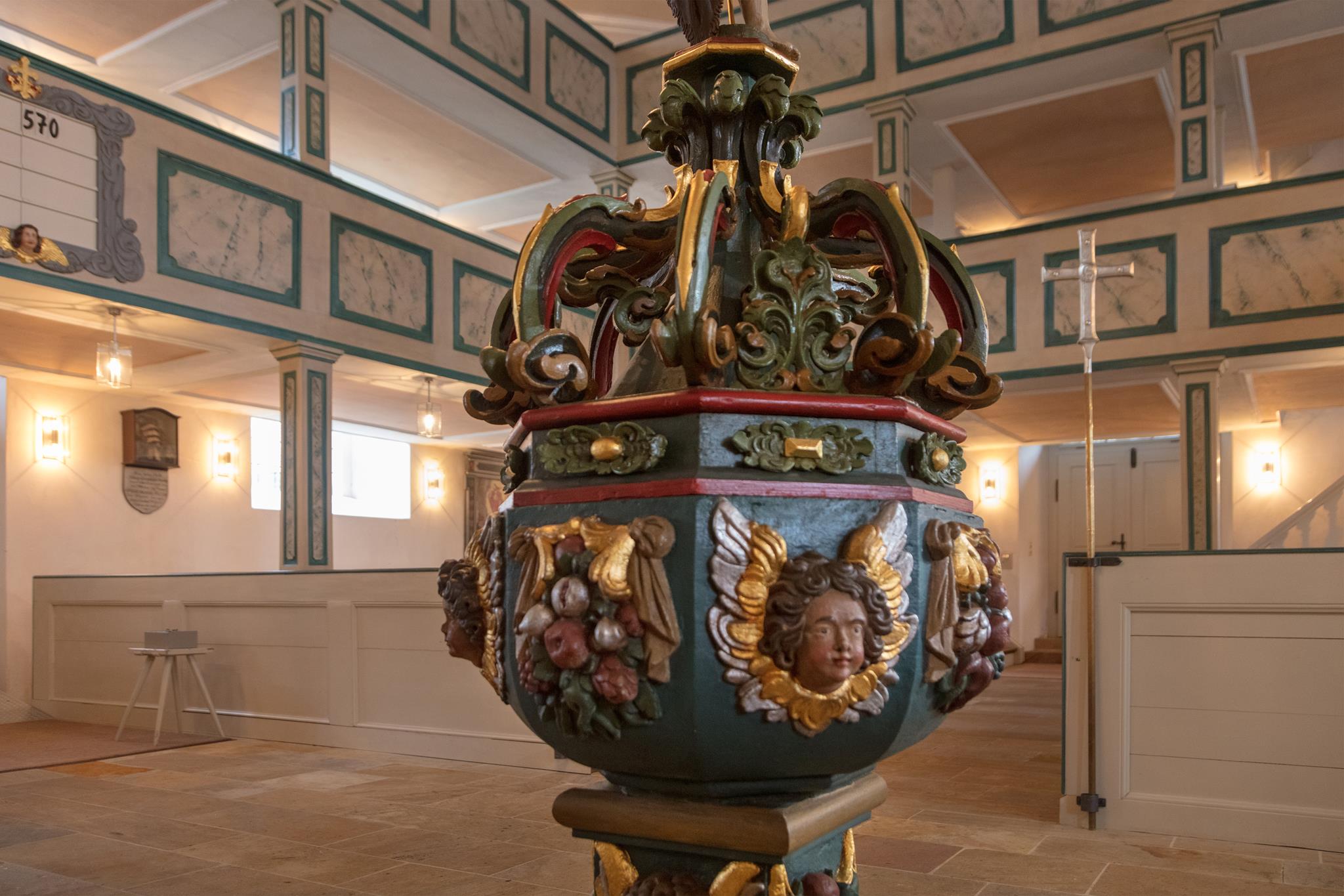 Worthy of note are the richly carved, gilded and brightly painted pulpit altar with Christ the Saviour in the centre, and the four Evangelists, the angels with the instruments of the Passion and the calling of Isaiah right at the top; and in addition, the font which is all in blue, plus the lectern- all the work of the sculptor J.G.Brenck – and the processional crosses.The stucco on the ceiling, with the golden triangle and the Eye of God, surrounded by a splendid white halo of rays of light, and with its symbolism and beautiful decoration, was created by the court stucco artist A.R.Albini.