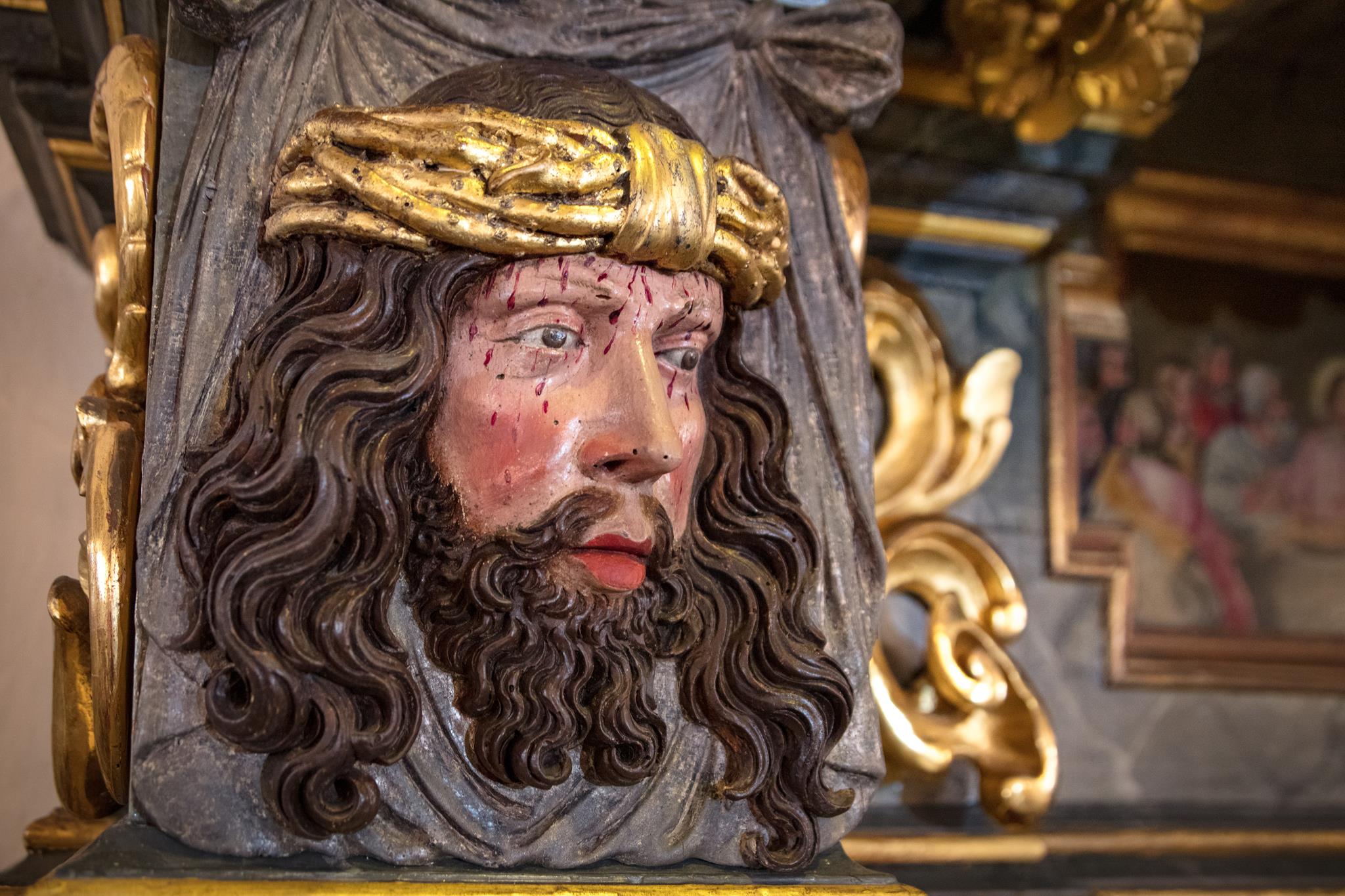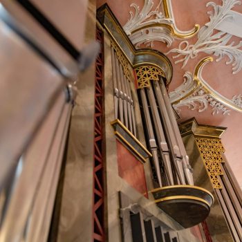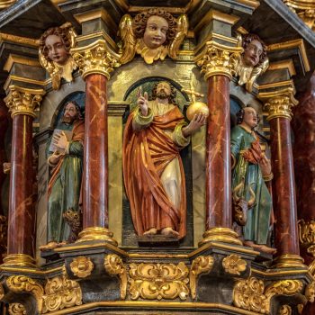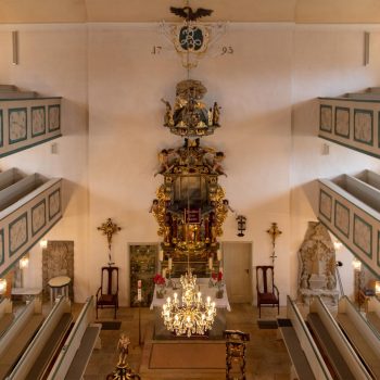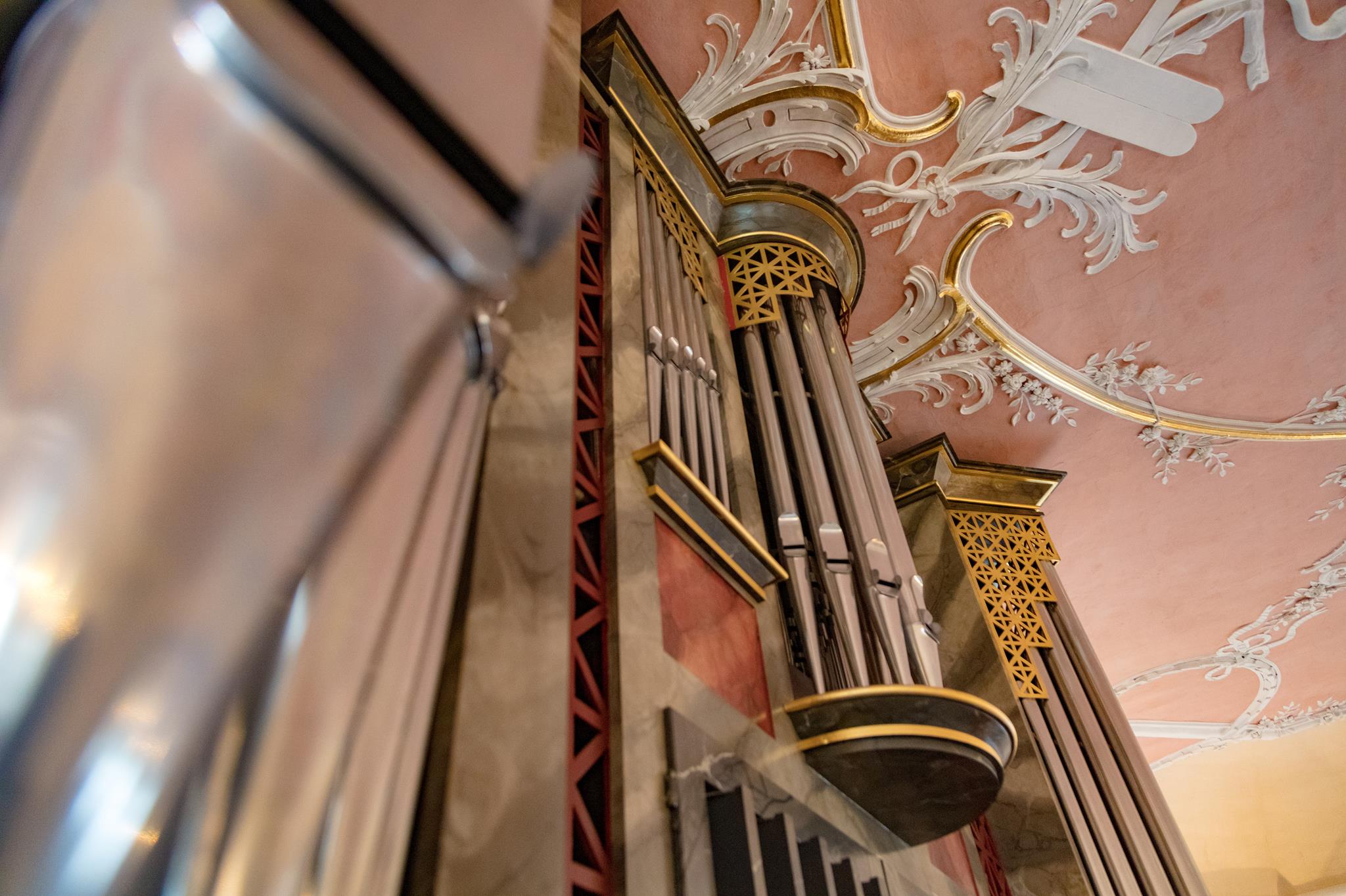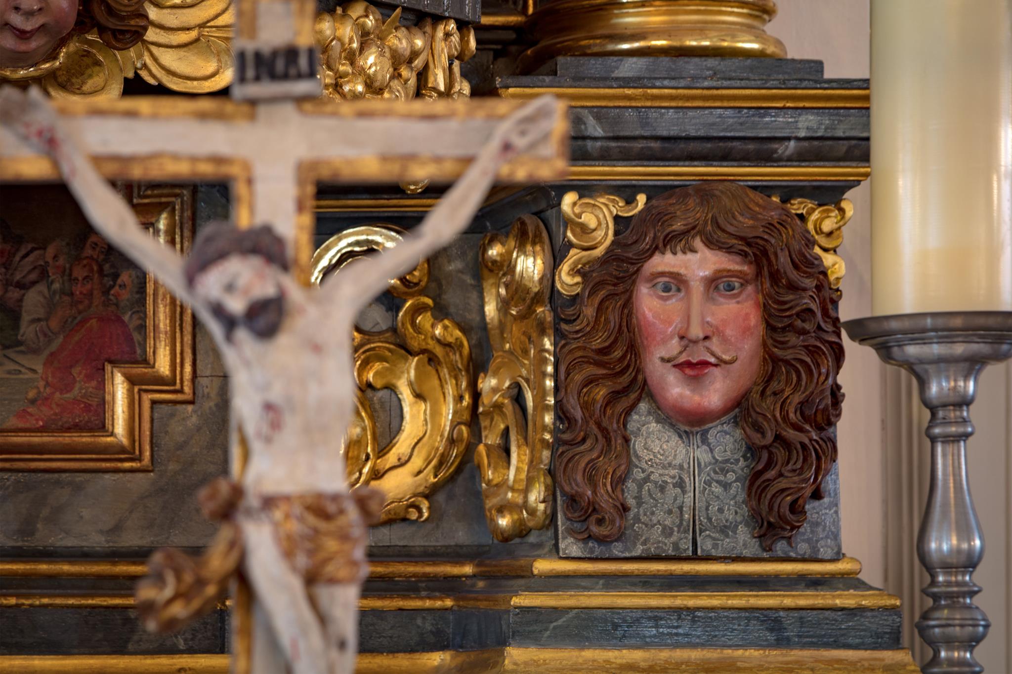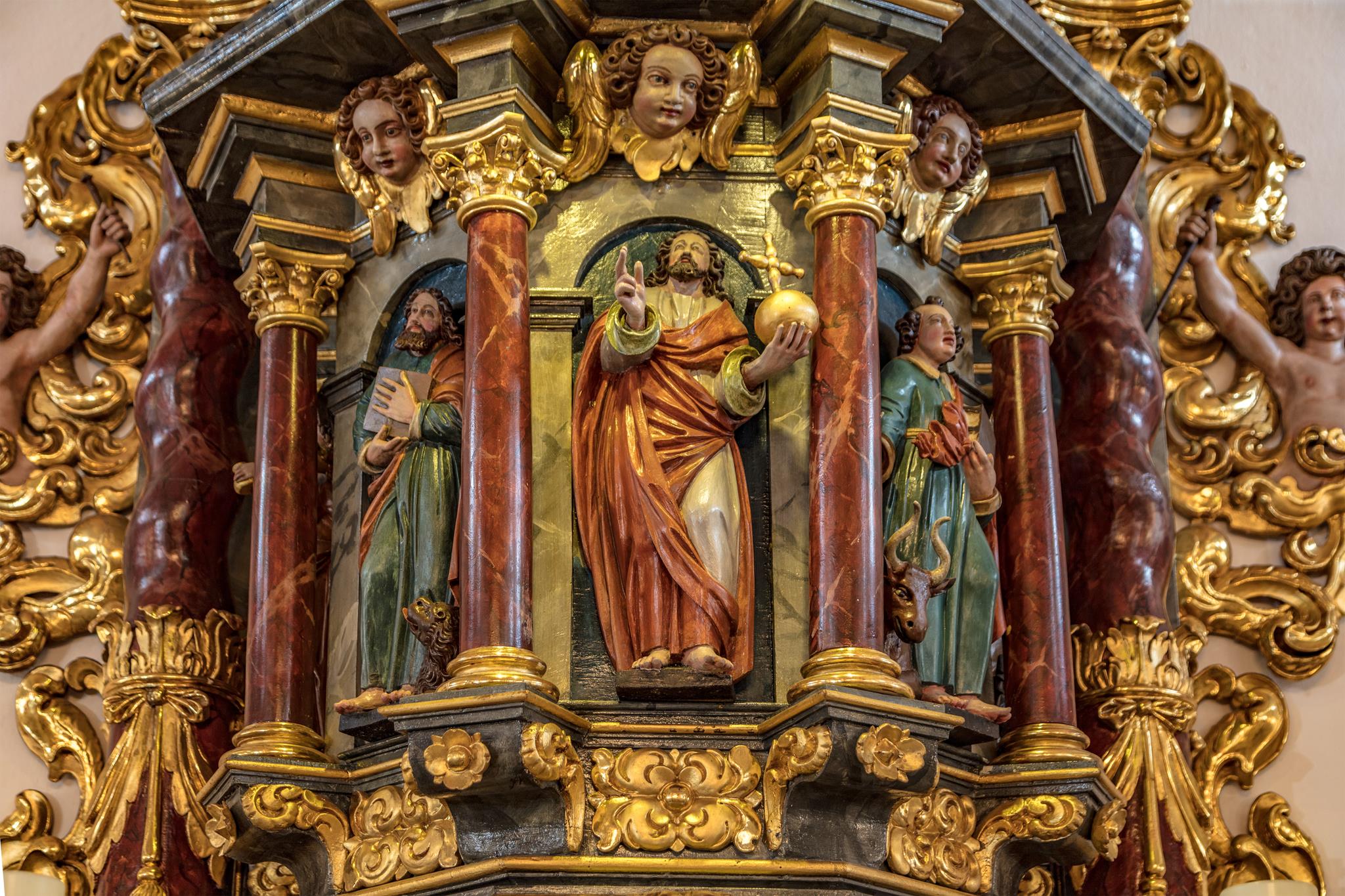 Worthy of note are the richly carved, gilded and brightly painted pulpit altar with Christ the Saviour in the centre, and the four Evangelists, the angels with the instruments of the Passion and the calling of Isaiah right at the top; and in addition, the font which is all in blue, plus the lectern- all the work of the sculptor J.G.Brenck – and the processional crosses.The stucco on the ceiling, with the golden triangle and the Eye of God, surrounded by a splendid white halo of rays of light, and with its symbolism and beautiful decoration, was created by the court stucco artist A.R.Albini.