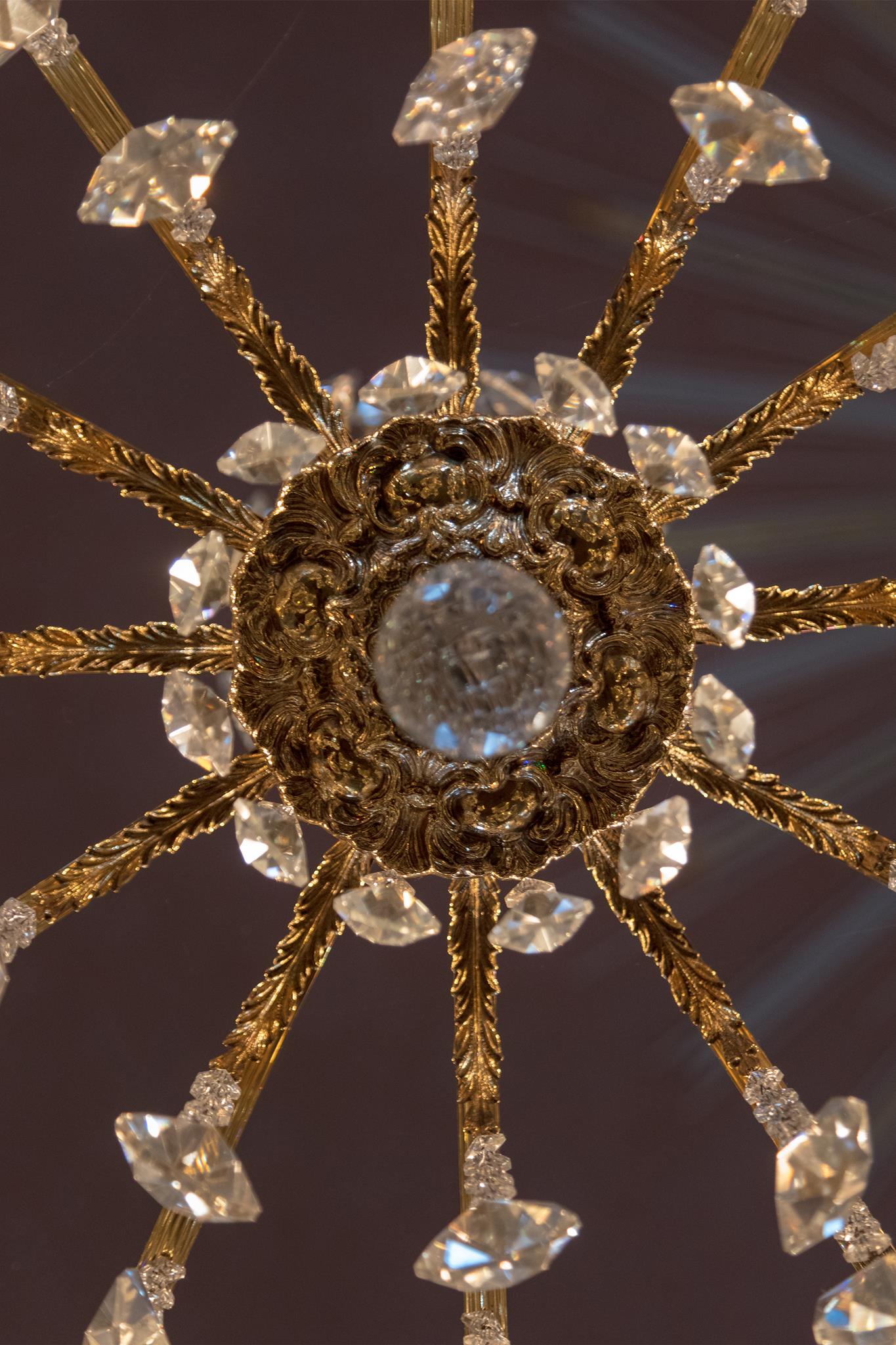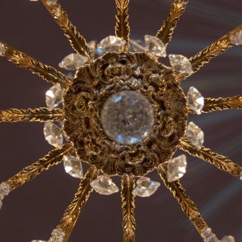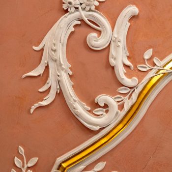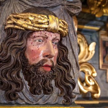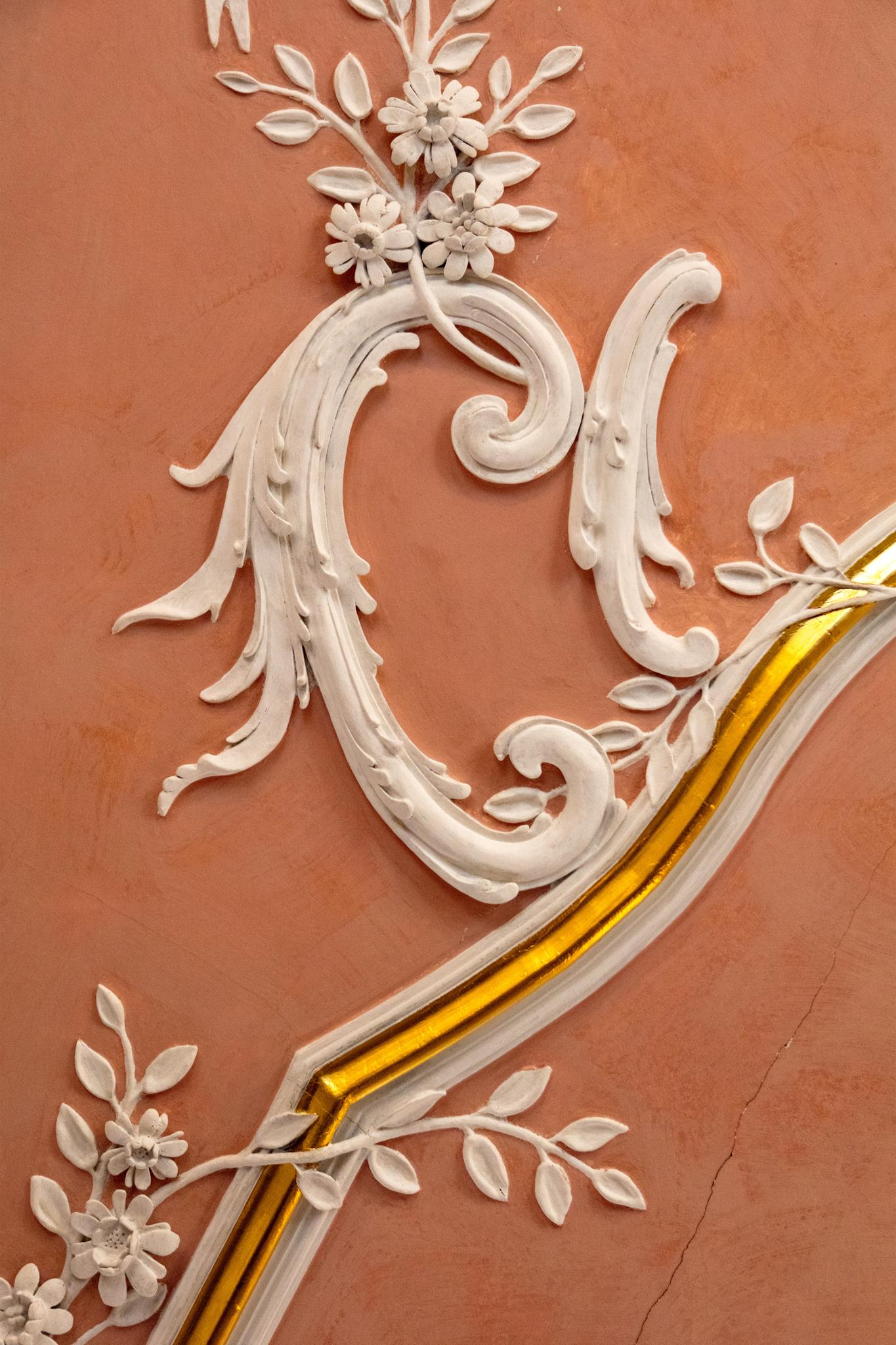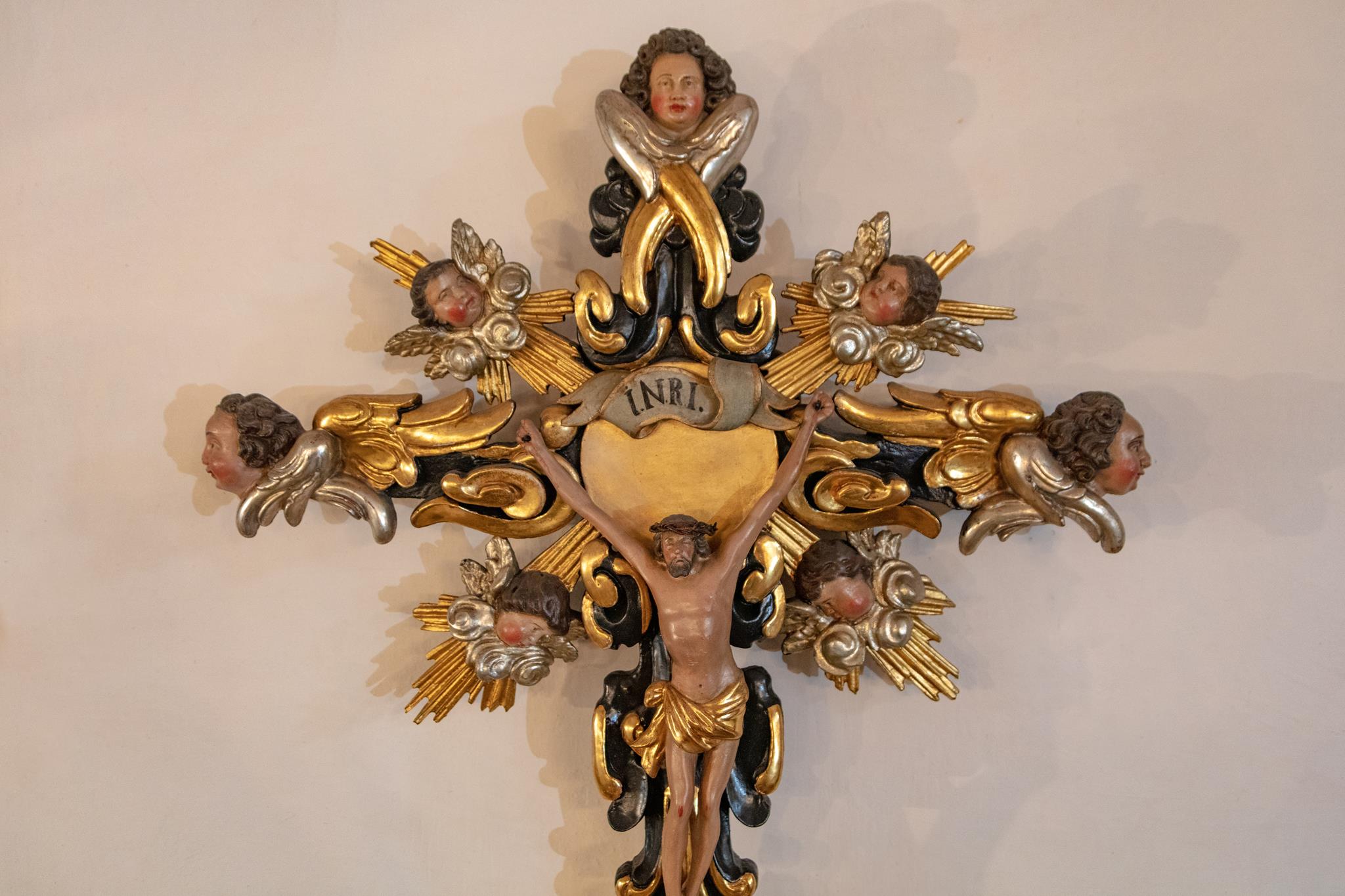 Worthy of note are the richly carved, gilded and brightly painted pulpit altar with Christ the Saviour in the centre, and the four Evangelists, the angels with the instruments of the Passion and the calling of Isaiah right at the top; and in addition, the font which is all in blue, plus the lectern- all the work of the sculptor J.G.Brenck – and the processional crosses.The stucco on the ceiling, with the golden triangle and the Eye of God, surrounded by a splendid white halo of rays of light, and with its symbolism and beautiful decoration, was created by the court stucco artist A.R.Albini.