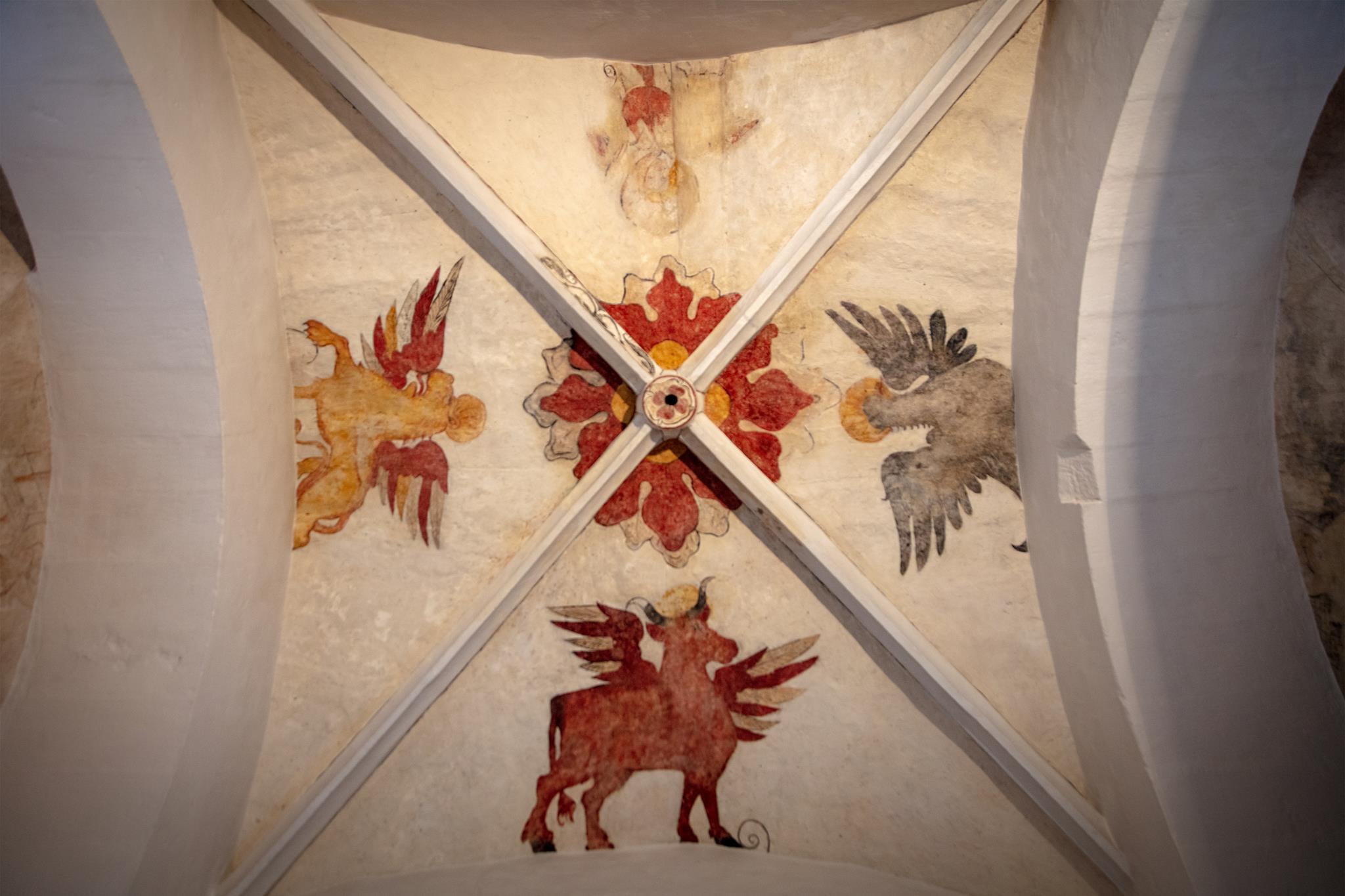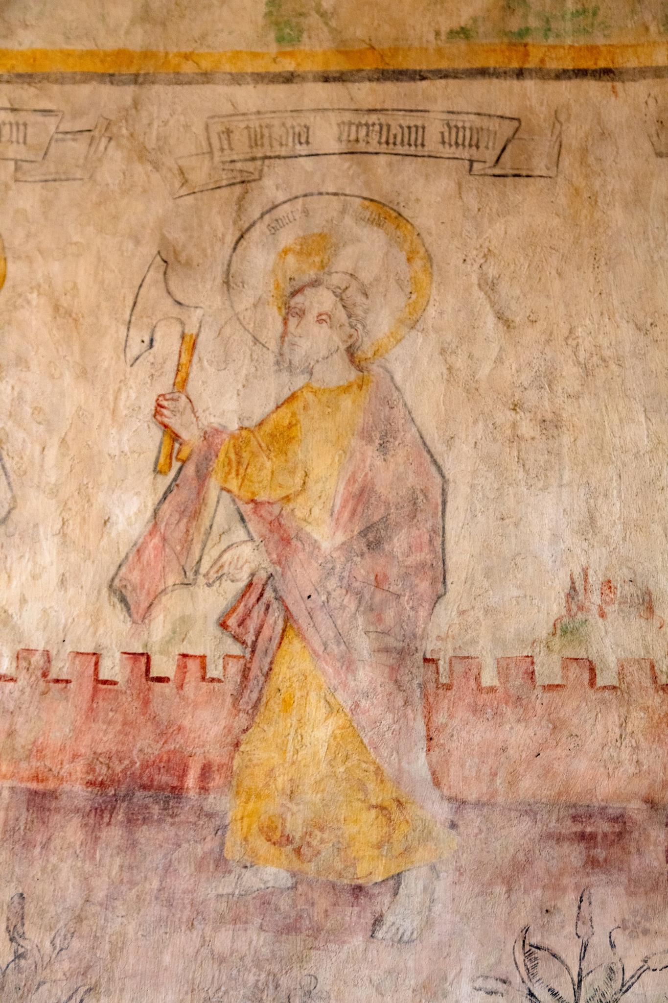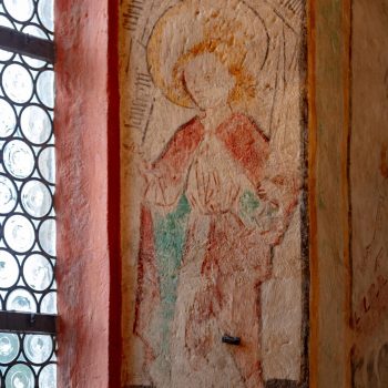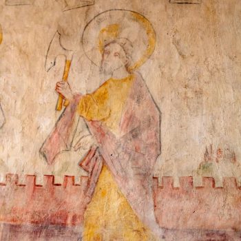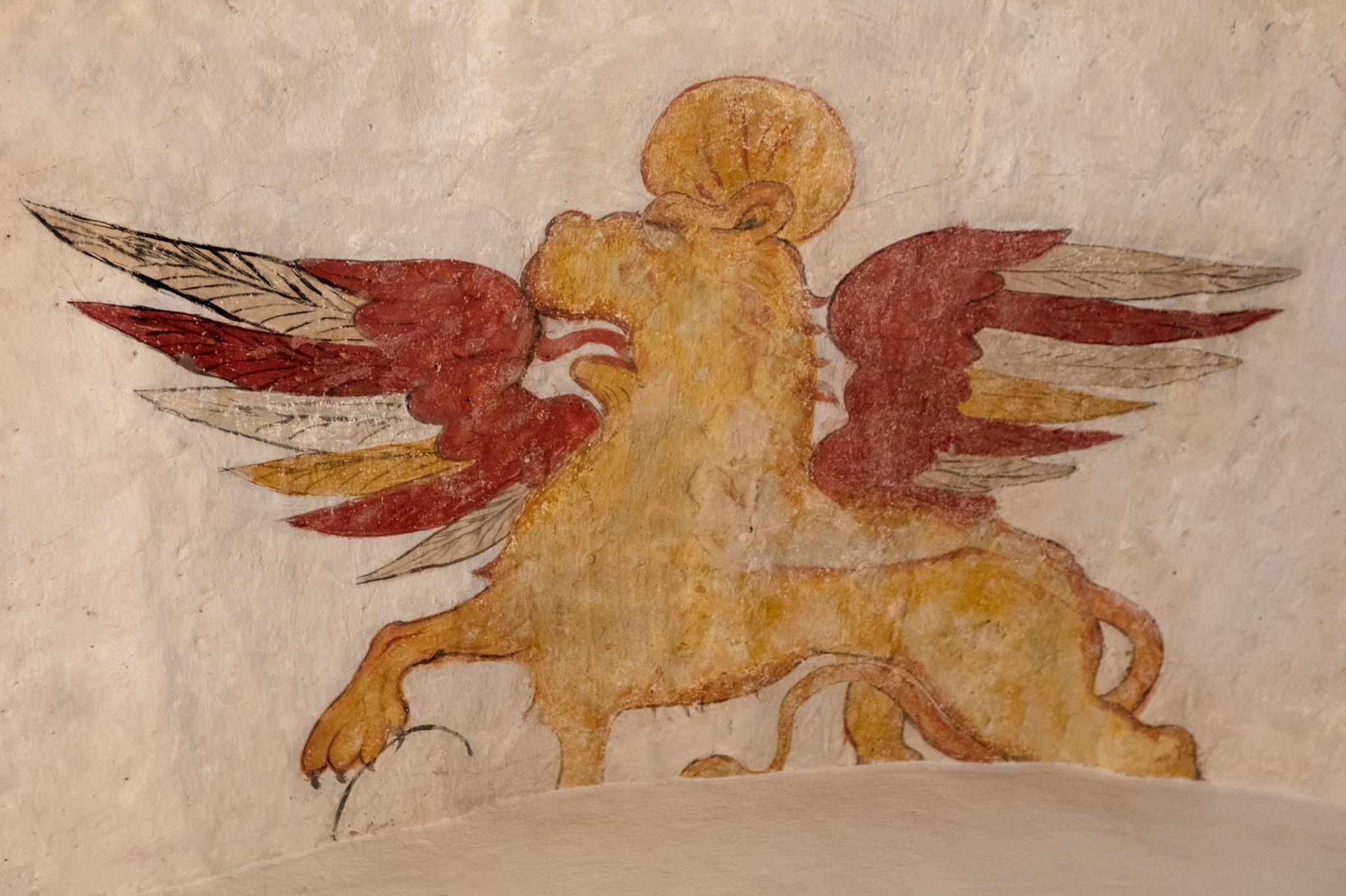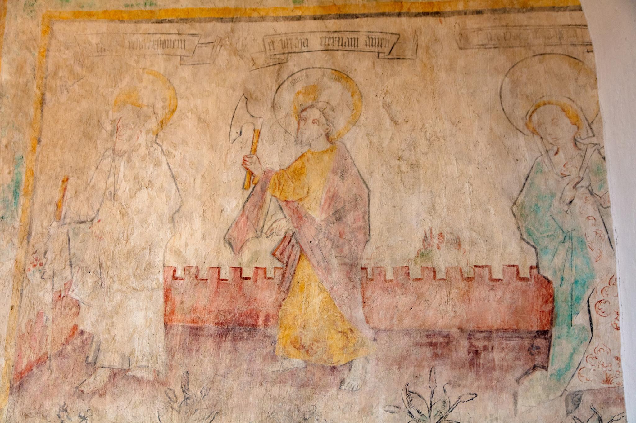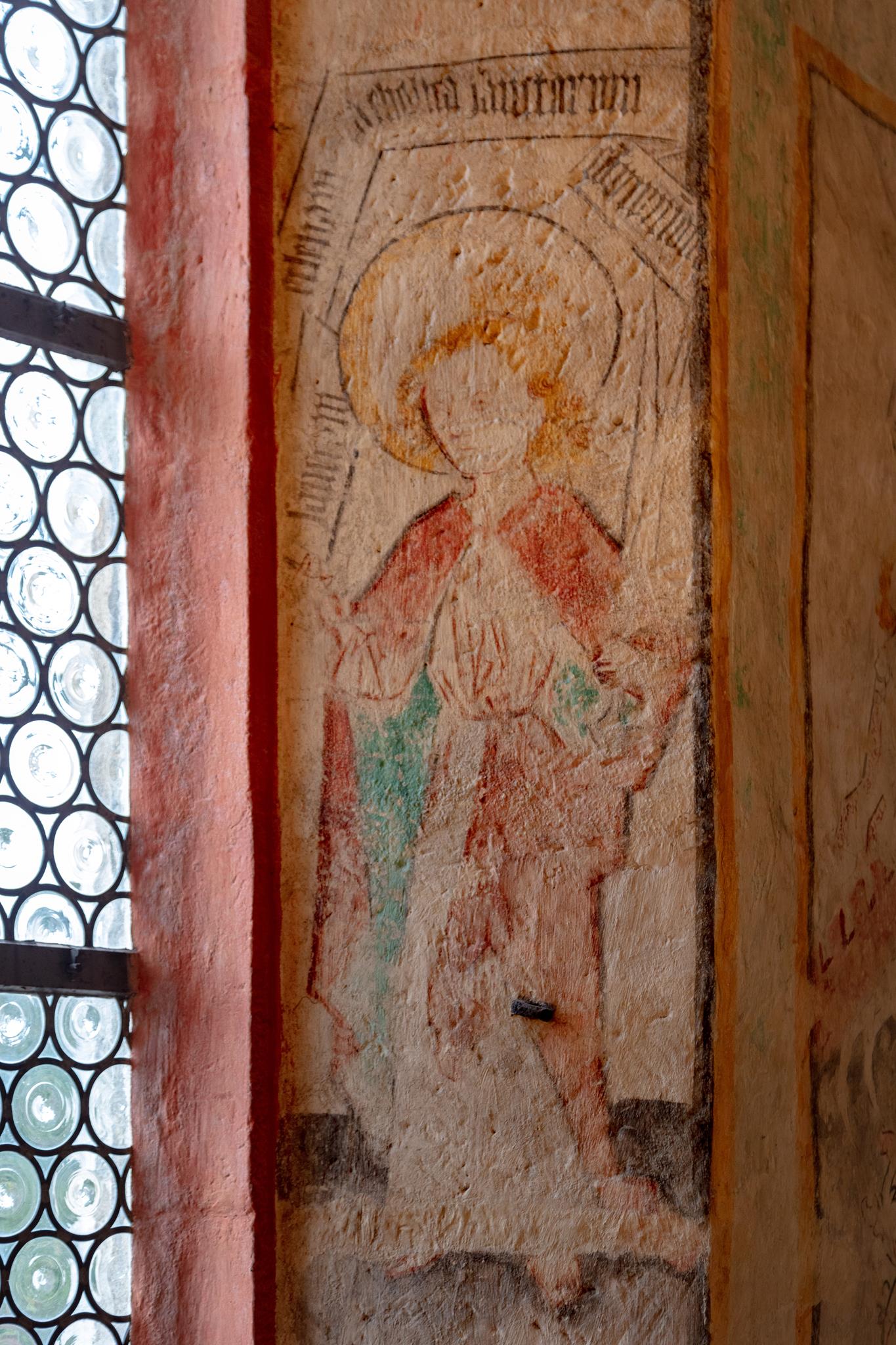 In the ancient former chapel of St Kilian , nowadays behind the altar, St Peter leads the twelve apostles. Each of them bears a sentence from the creed. Parts of this 15C ‘Apostles’ creed’ are well-preserved, as are the symbols of the Evangelists on the ceiling. In the main body of the church, the initials of the Prussian King Friedrich Wilhelm II and the black eagle are resplendent above the altar. On the altar itself, the donor von Lüchau, the local feudal lord, had himself immortalised, his portrait directly opposite that of Christ with the crown of thorns.