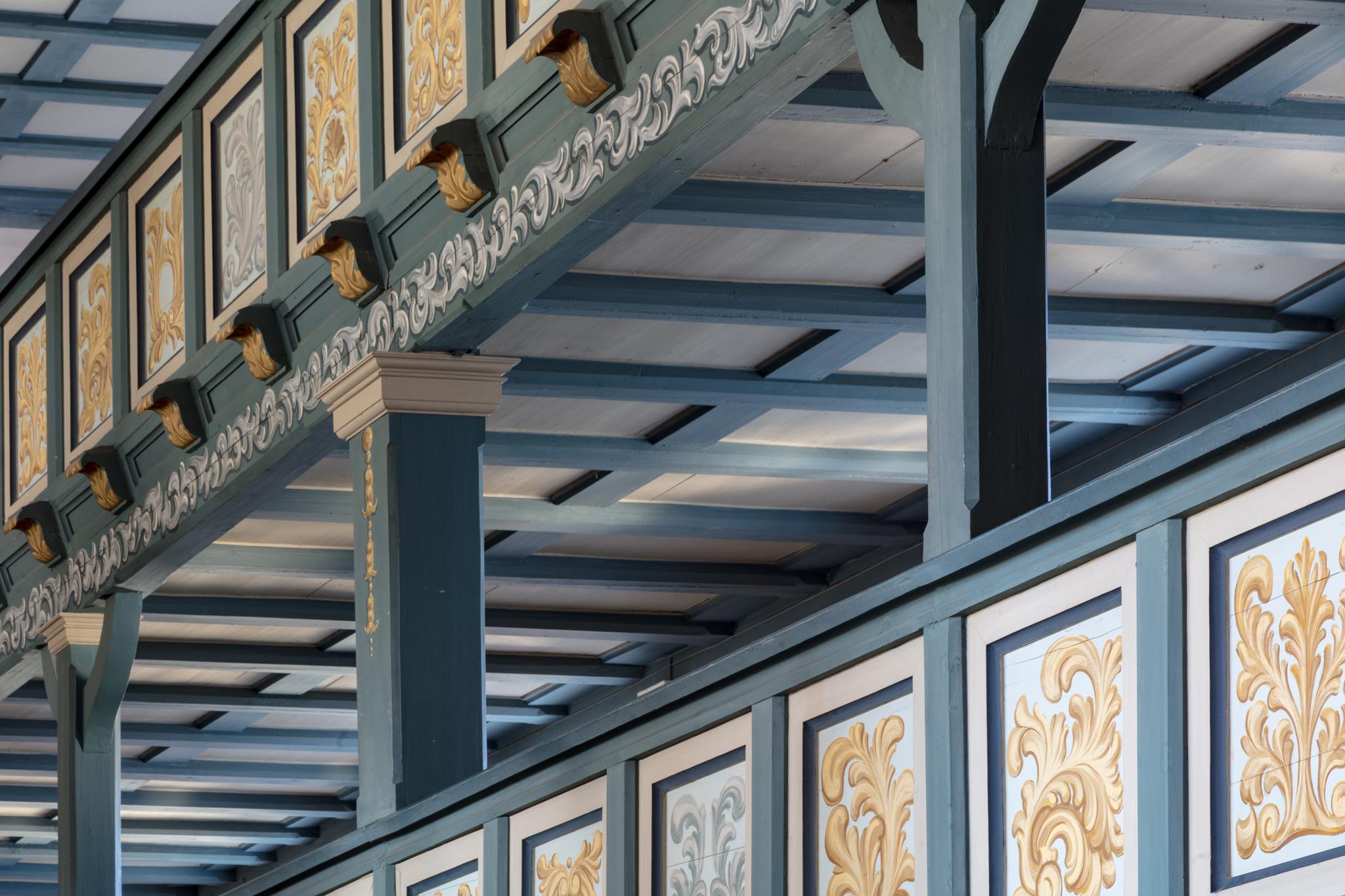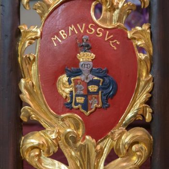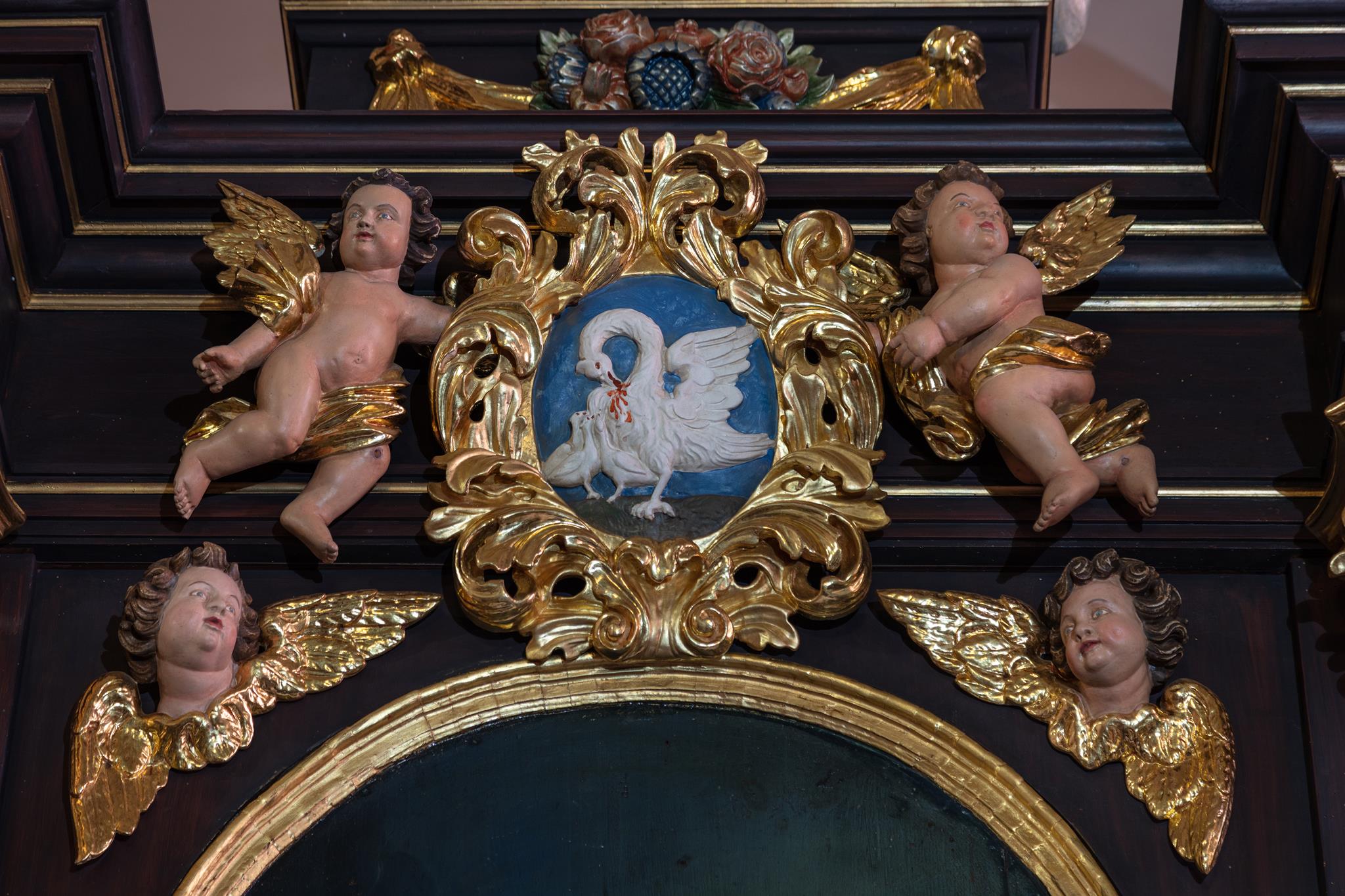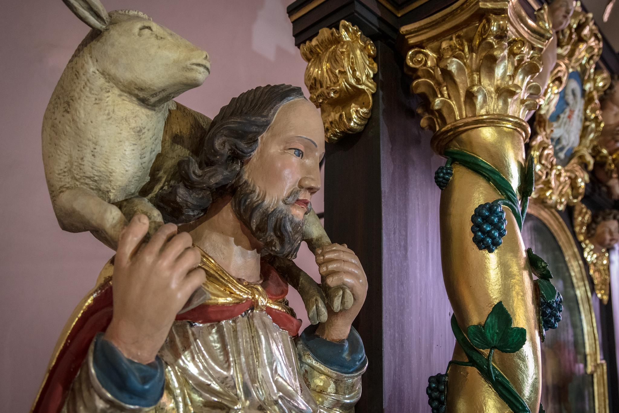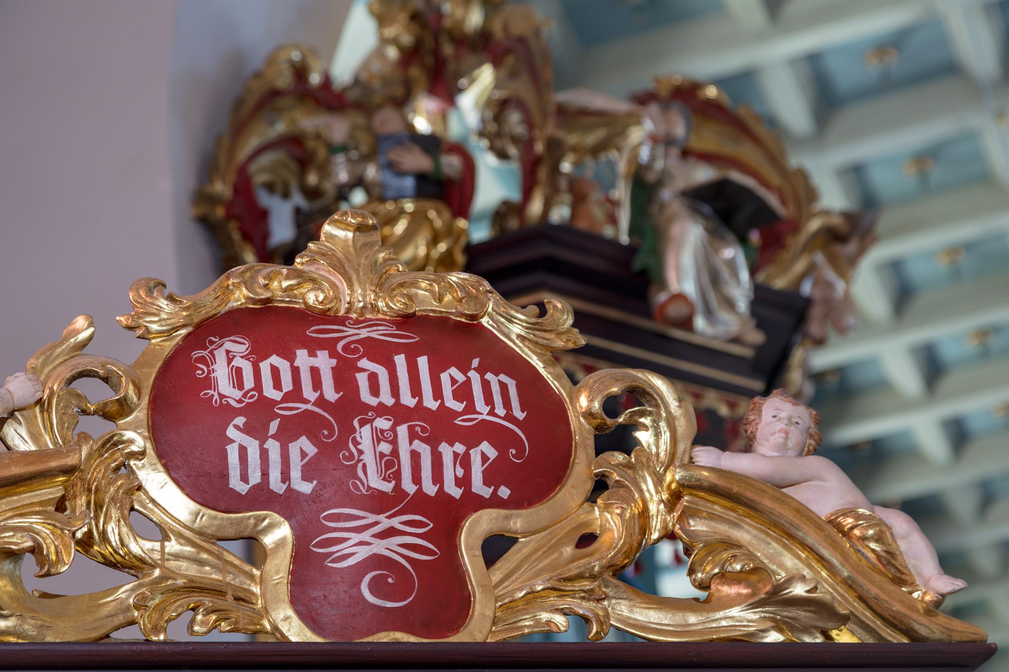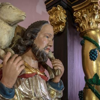 Jesus, the Good Shepherd with the lamb on his shoulder, guides and carries us through life. His figure stands on the left side of the altar, opposite St James. Between the two is a picture showing the swan who pours out its lifeblood to save its young from dying of thirst. It tells of what Jesus did on the cross. (Elsewhere usually represented by a pelican). The four Evangelists, who wrote about Jesus Christ, are seated on the roof of the pulpit. An inscription over the entrance to the steps reminds us that everything is to be done to the glory of God.