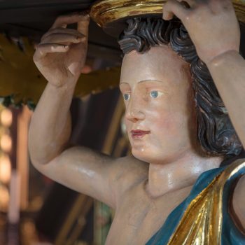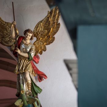 Archangel Michael on the pulpit has bigger and more beautiful wings than all the other angels in the church. According to biblical legend he kills the devilish dragon, but here in this evangelical church he is pointing to the resurrection of Jesus Christ.