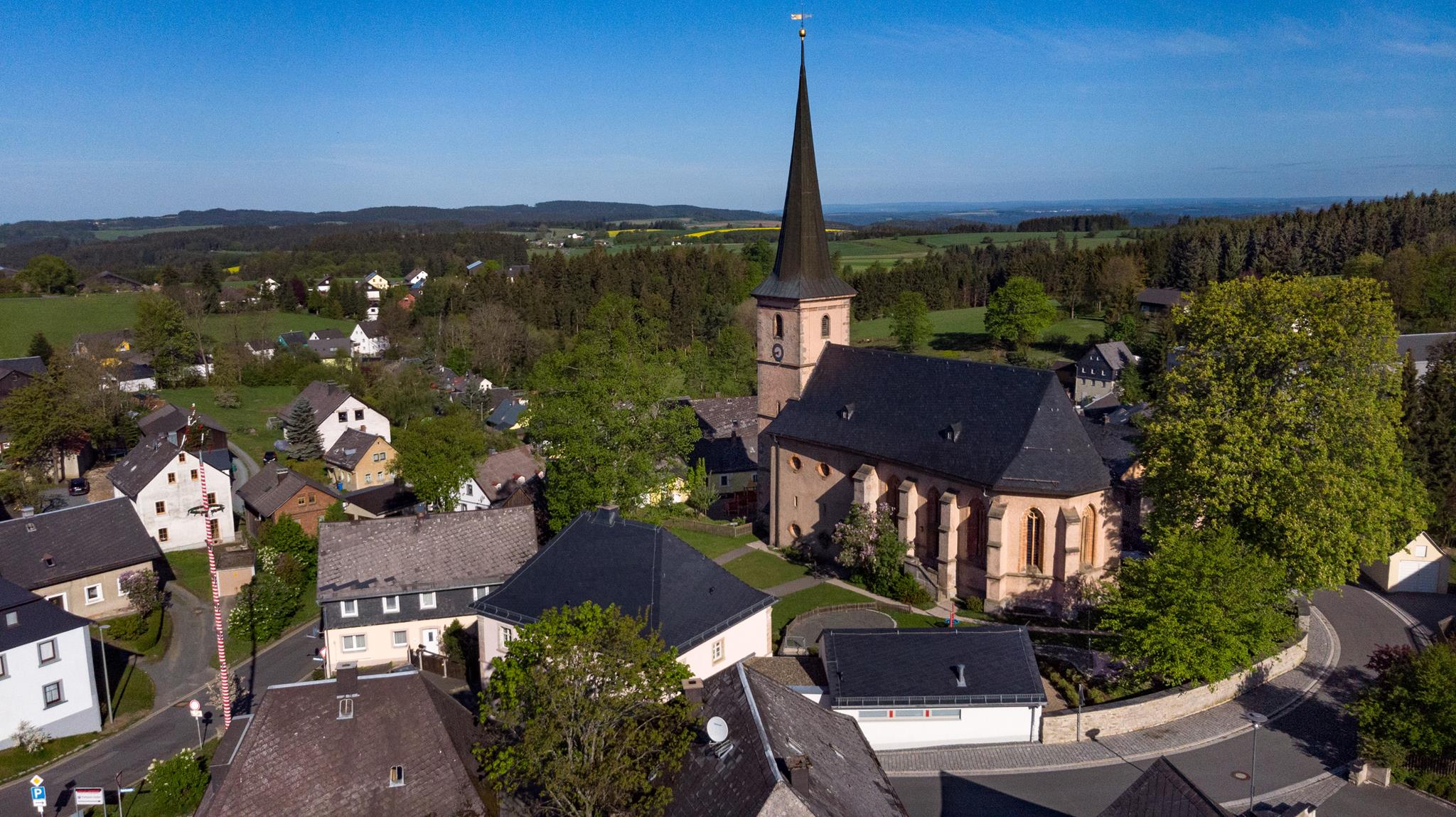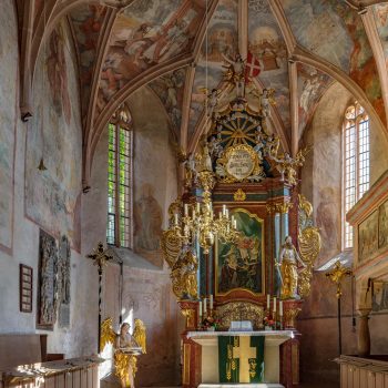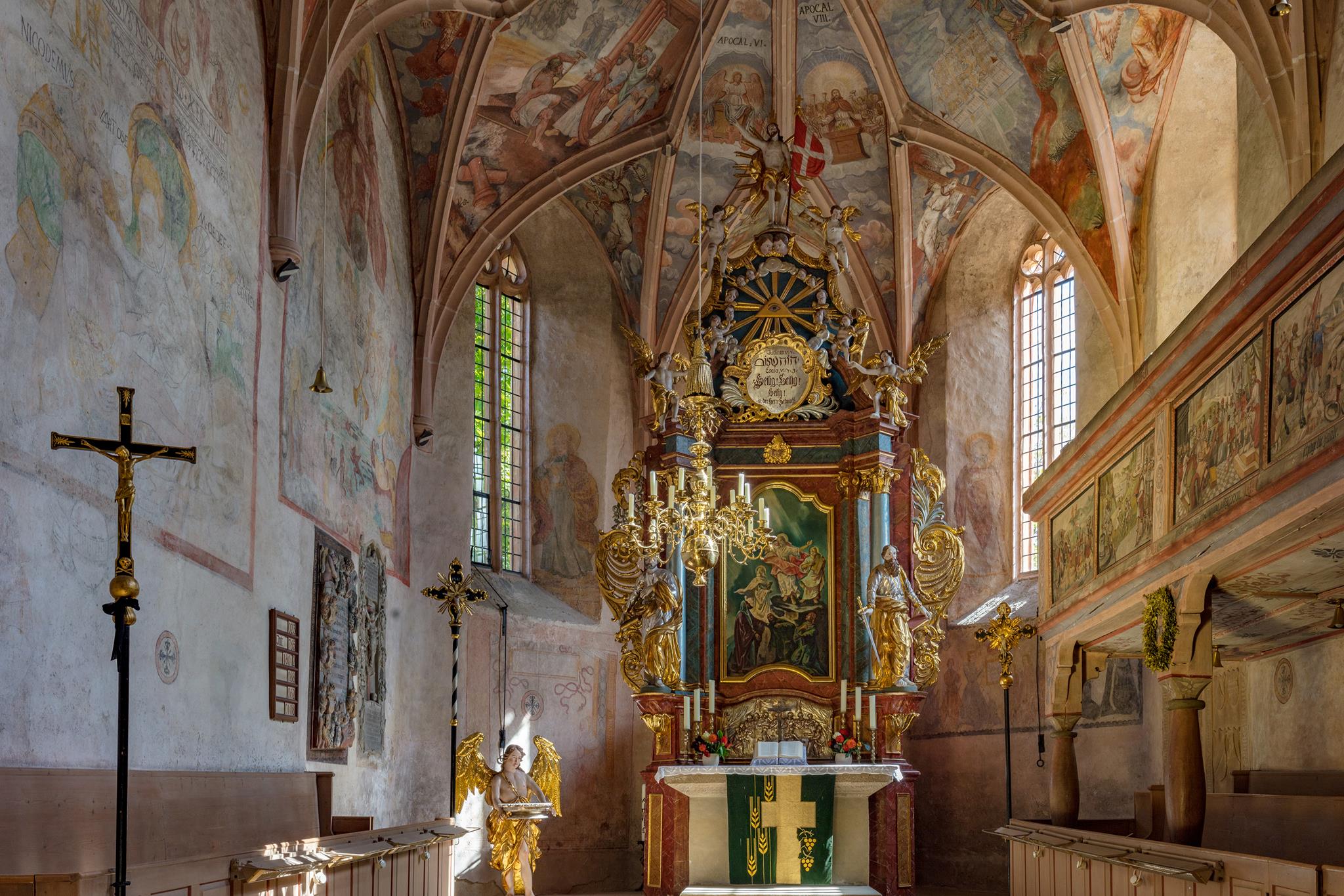Lying up in the hills of the Franconian forest, Presseck belonged for many years to the Lords of Wildenstein, and many of their memorials can be seen on the walls of the church. As patrons of the church, they took great care of it. After 1500, they had it enlarged, and the late Gothic building, with its unusually large chancel, remains to this day. The wallpaintings of 1513 have been uncovered : St Christopher, the Crucifixion and Deposition from the Cross ,the Last Judgement and a portrait of Christoph von Wildenstein.