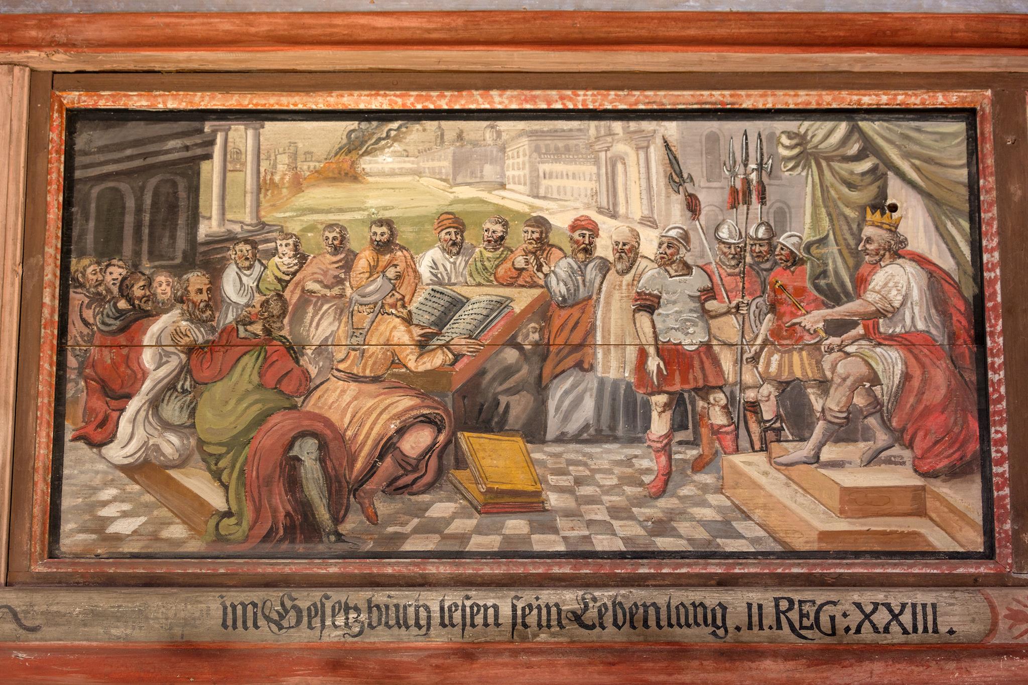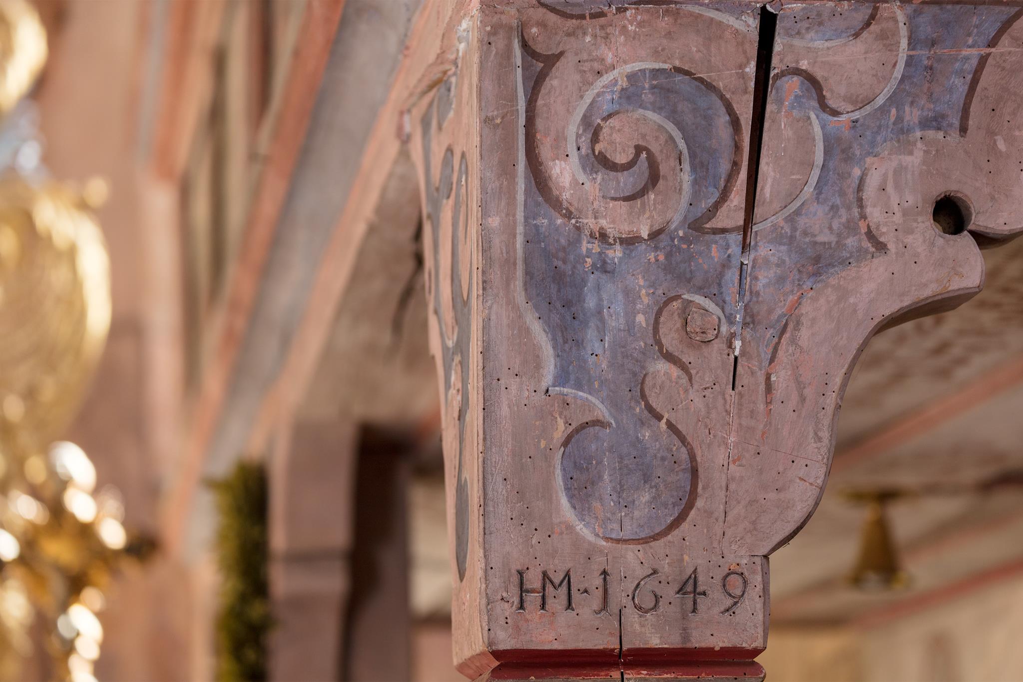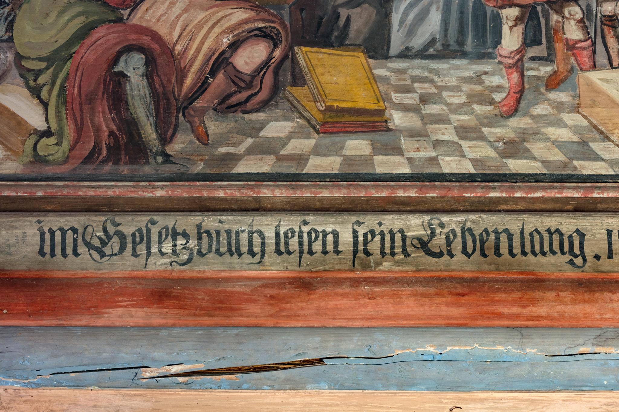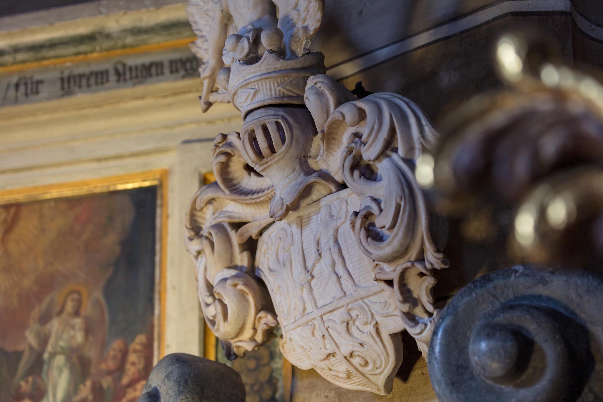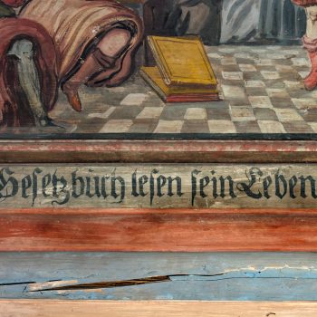 The inscription on the north wall tells us that the church was taken from the Lutherans during the Thirty Years’ war, but was returned to them after the Treaty of Westphalia in 1648.It had been damaged and needed to be newly furnished, and in the process picture panels which probably came from an earlier gallery were used as flooring for the new galleries. As early as 1649 the Wildenreuths were again able to participate in the church services from the ‘noblemen’s gallery’ .