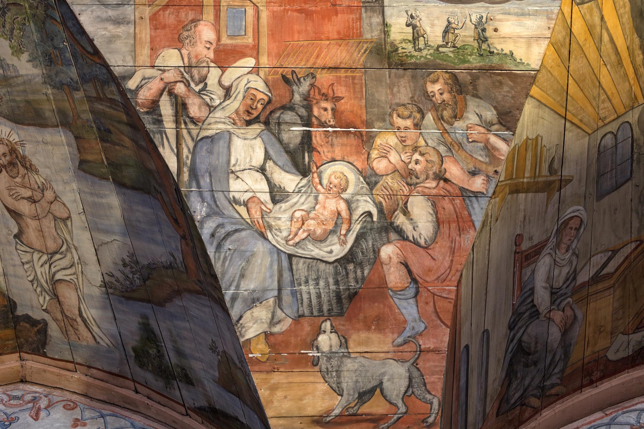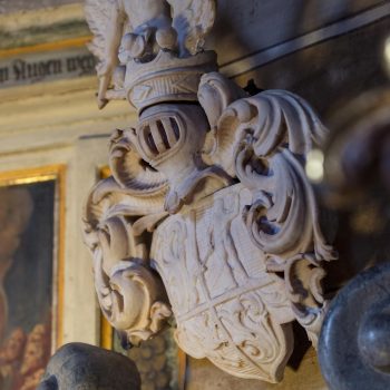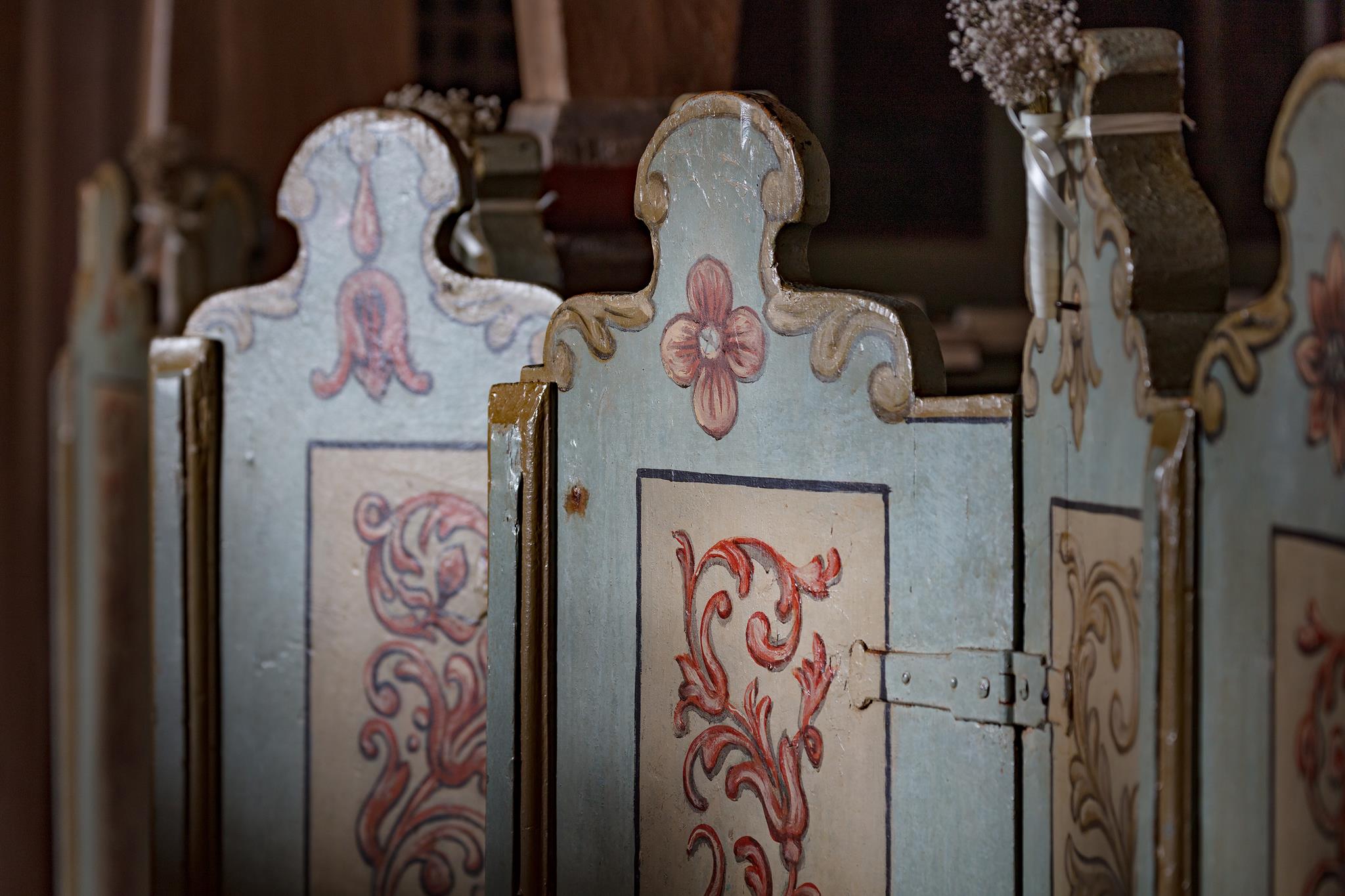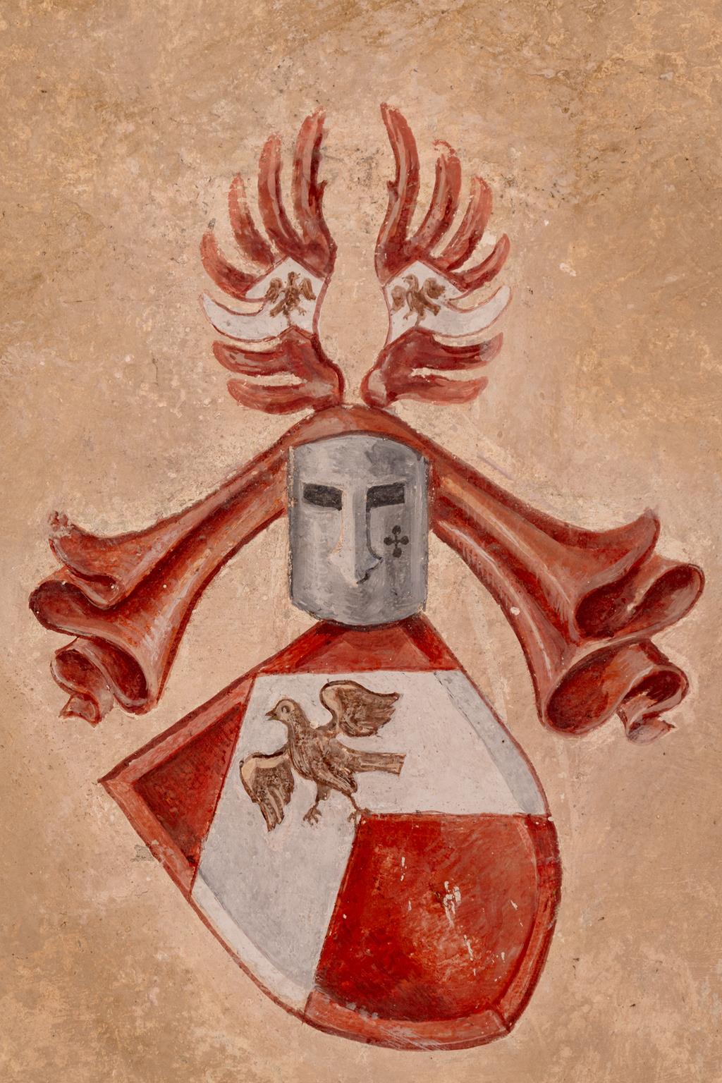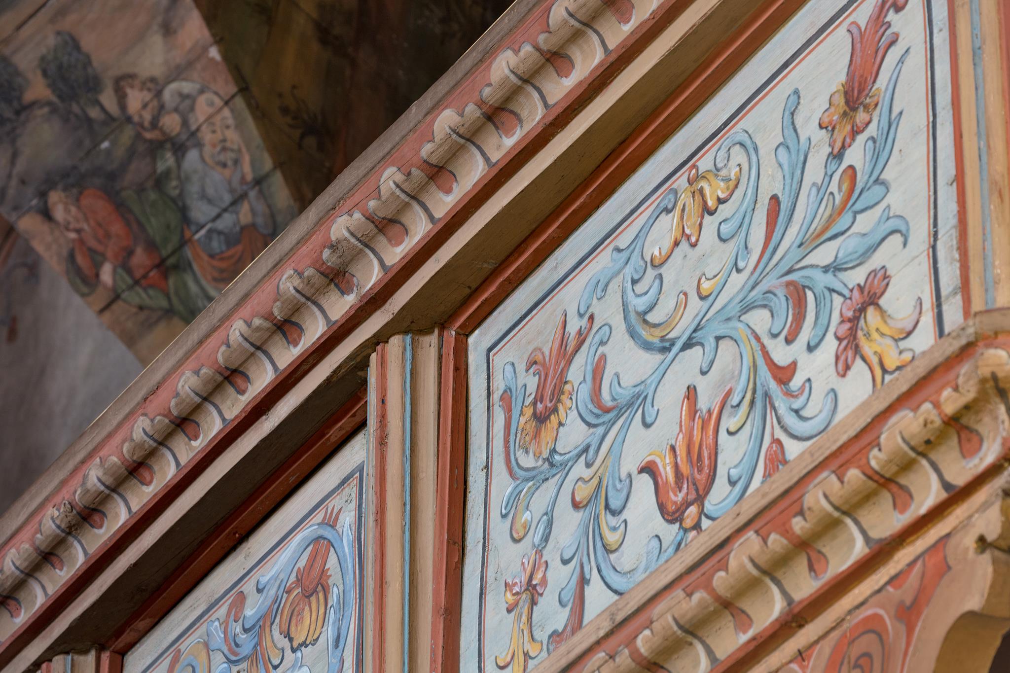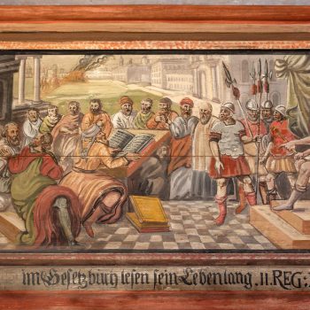 The inscription on the north wall tells us that the church was taken from the Lutherans during the Thirty Years’ war, but was returned to them after the Treaty of Westphalia in 1648.It had been damaged and needed to be newly furnished, and in the process picture panels which probably came from an earlier gallery were used as flooring for the new galleries. As early as 1649 the Wildenreuths were again able to participate in the church services from the ‘noblemen’s gallery’ .