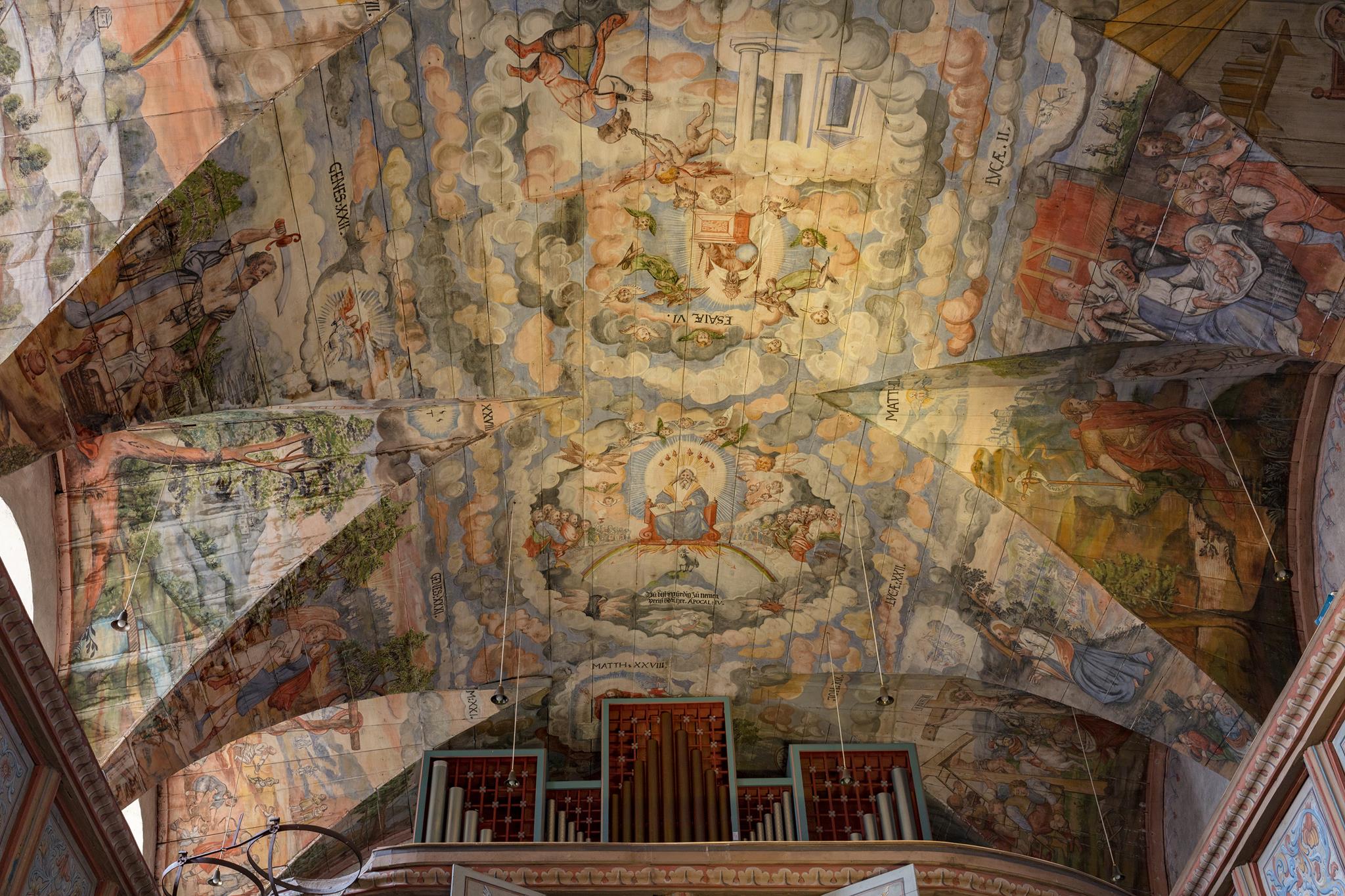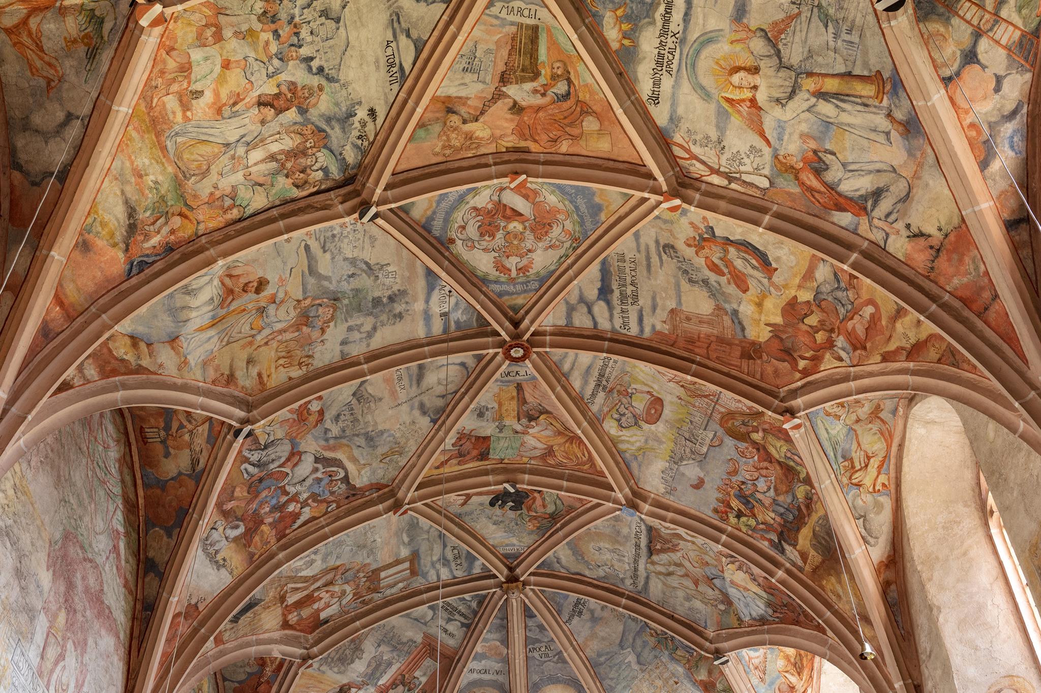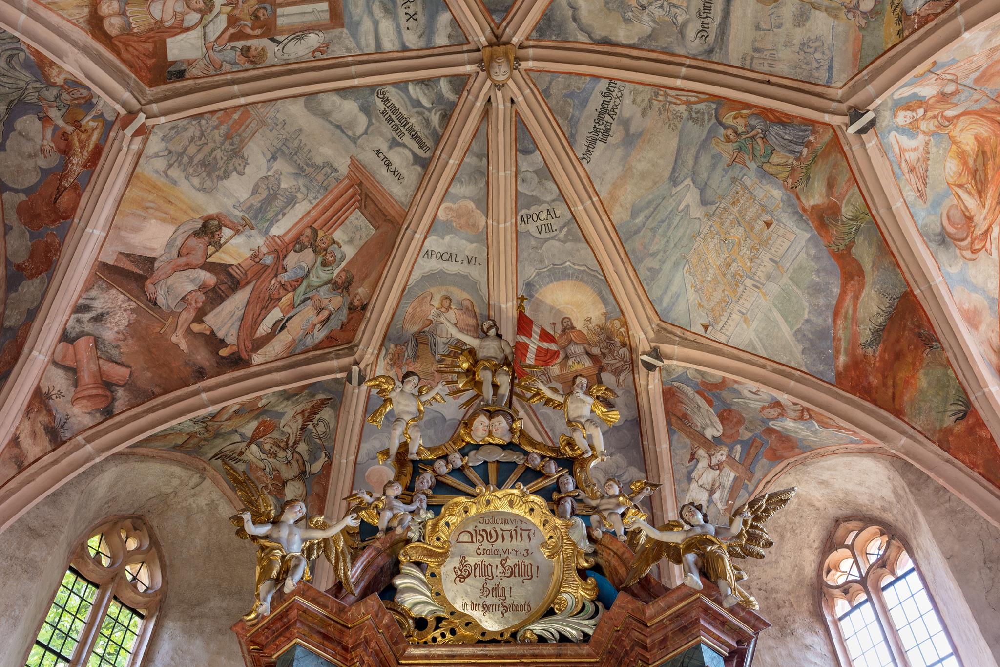 But the biggest attraction of the church is its ceiling: the Gothic vaults are covered with biblical scenes by Friedrich Schmidt from Kulmbach.Here is the story of God and His people from the beginning to the promised Kingdom of Peace in Heaven. In the centre are the visions of the prophet Isaiah and of St John, who sees God on His throne and the Lamb who atoned for the sins of the world.