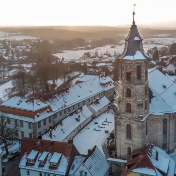 A synthesis of the arts , created for the praise and glory of the triune God: as splendid as a ballroom for celebrating church services. We have the Imperial Count Philipp Andreas von Ellrodt, whose family owned the nearby castle, the Kulmbach superintendent Johann Christoph Sichmüller, the local master builder Johann Georg Hoffman, and above all the generosity of the congregation to thank for this splendid building with its rich architectural features, wide central body and artistic furnishings.