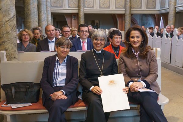 Staatsministerin Michaela Kaniber, Regionalbischöfin Dr. Dorothea Greiner und Regierungspräsidentin Heidrun Piwernetz bei der Bescheidübergabe in der Stiftskirche Himmelkron