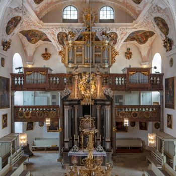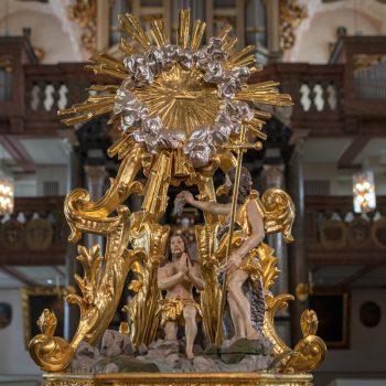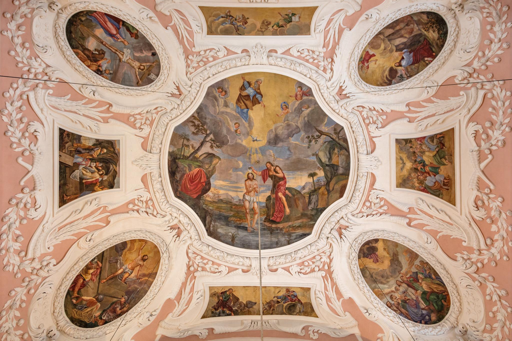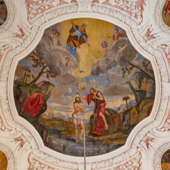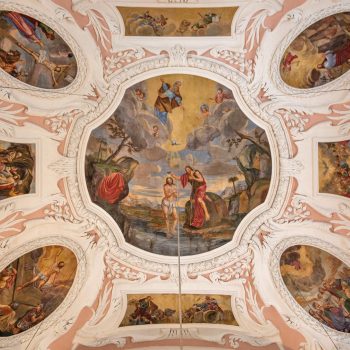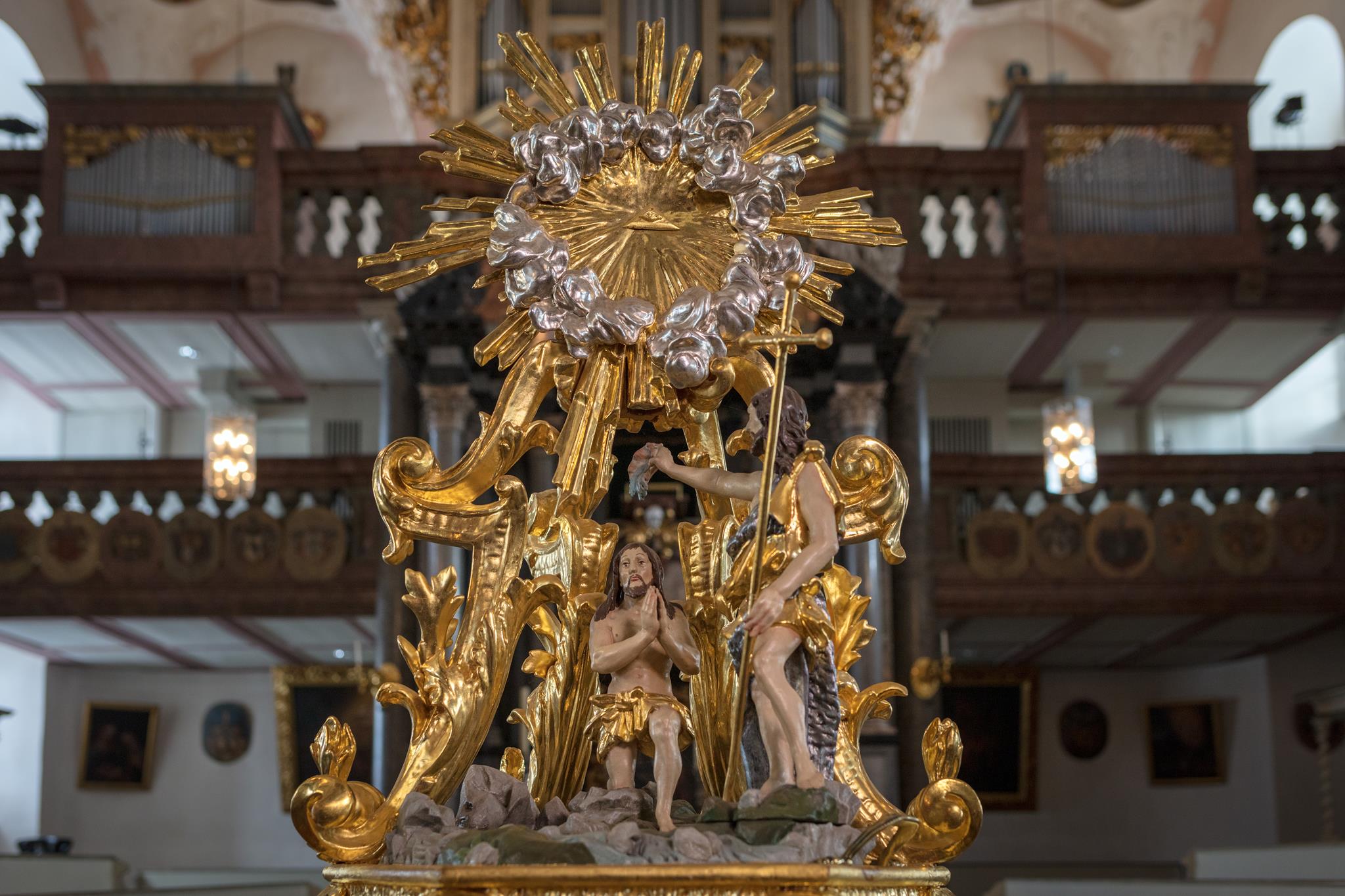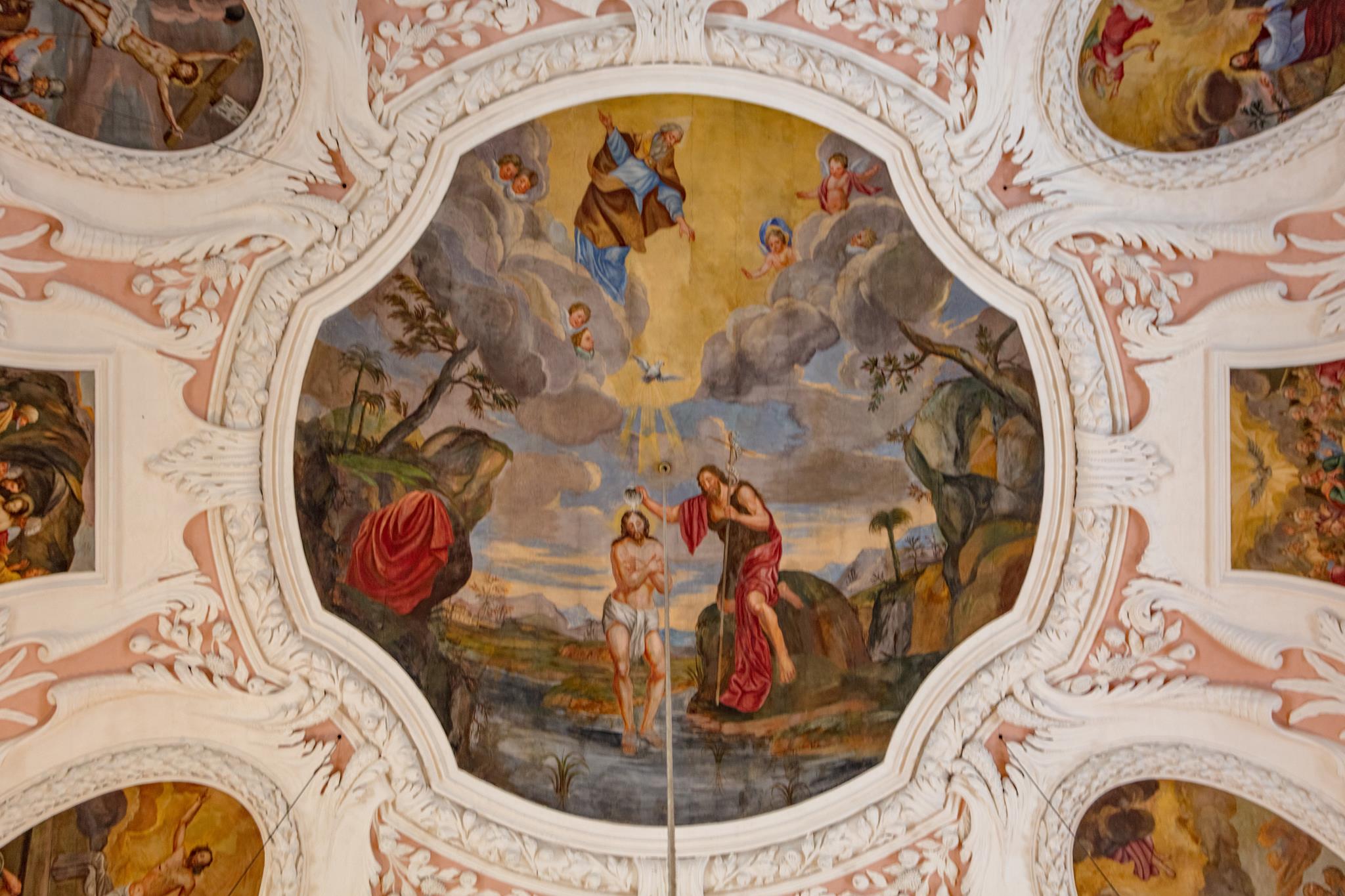 Vom Hauptportal im Westen geht man auf den Taufstein aus Marmor zu, der in der Mitte des Raumes steht. Die kostbare Abdeckung, eine Holzschnitzarbeit von Elias Räntz, ist unter der Woche in der Sakristei verwahrt. Oben an der Decke stellt das zentrale Gemälde ebenfalls die Taufe dar. Vorne über dem Altar ist das letzte Abendmahl Jesu mit seinen Jüngern zu sehen. Alle Flächen sind mit Szenen aus dem Alten und Neuen Testament bemalt. Die Bilderfülle passt sich in den Stuck des Hofstuckateurs Bernardo Quadri ein: kräftige Ornamente mit vielen Blumen.