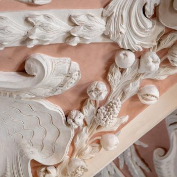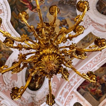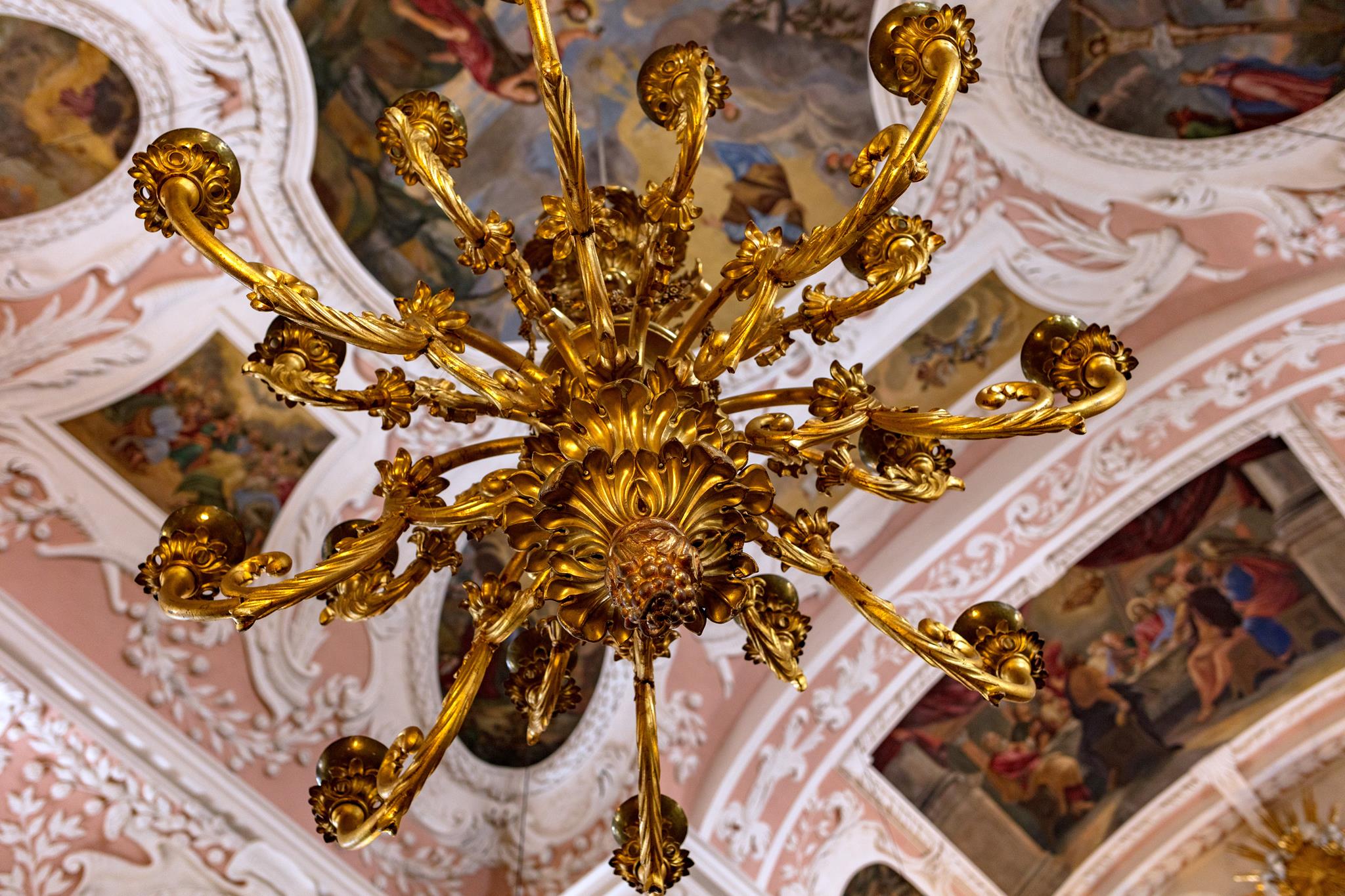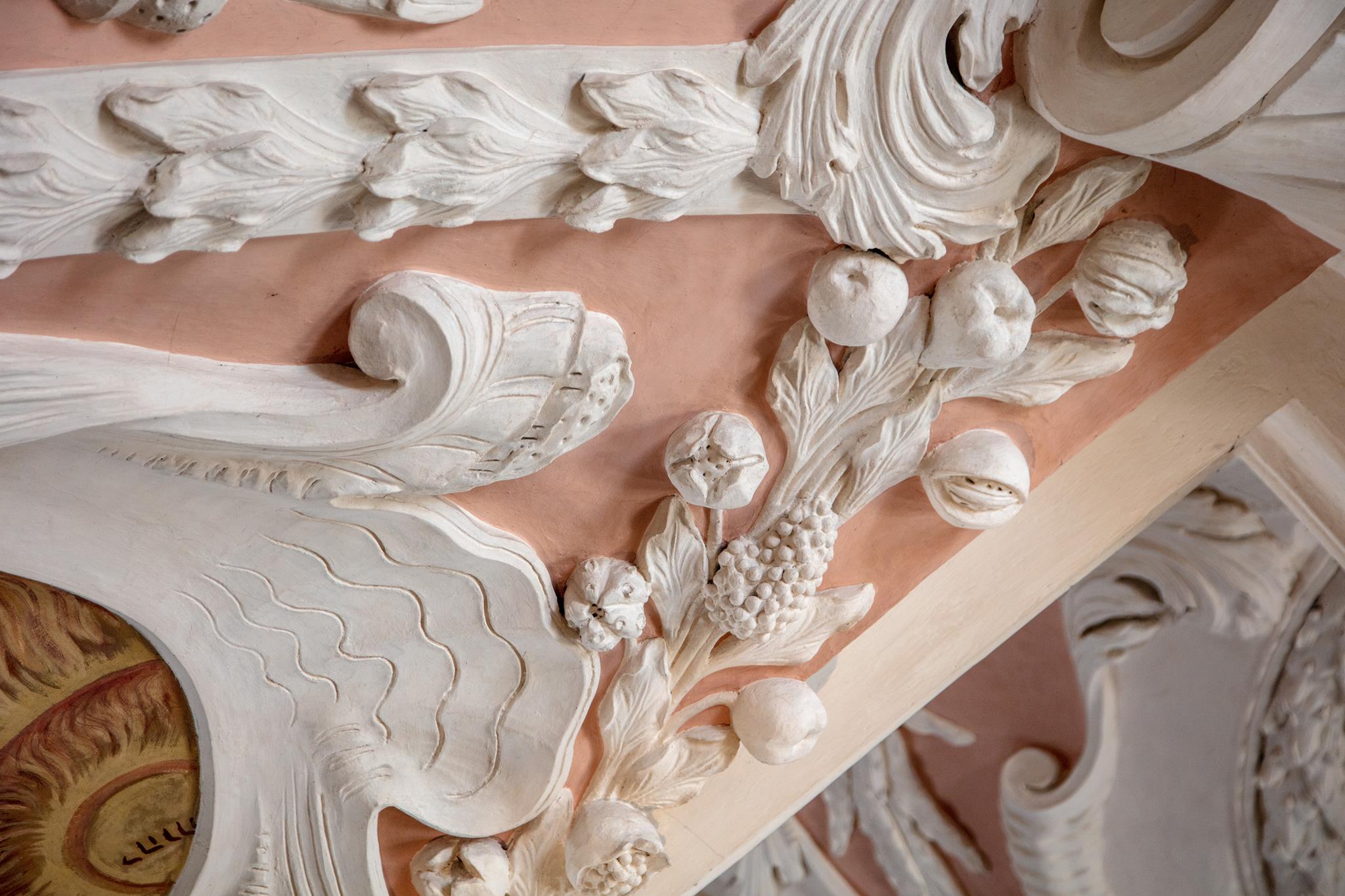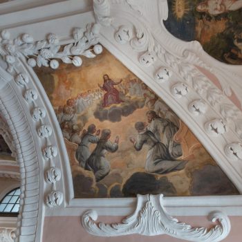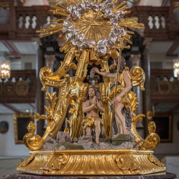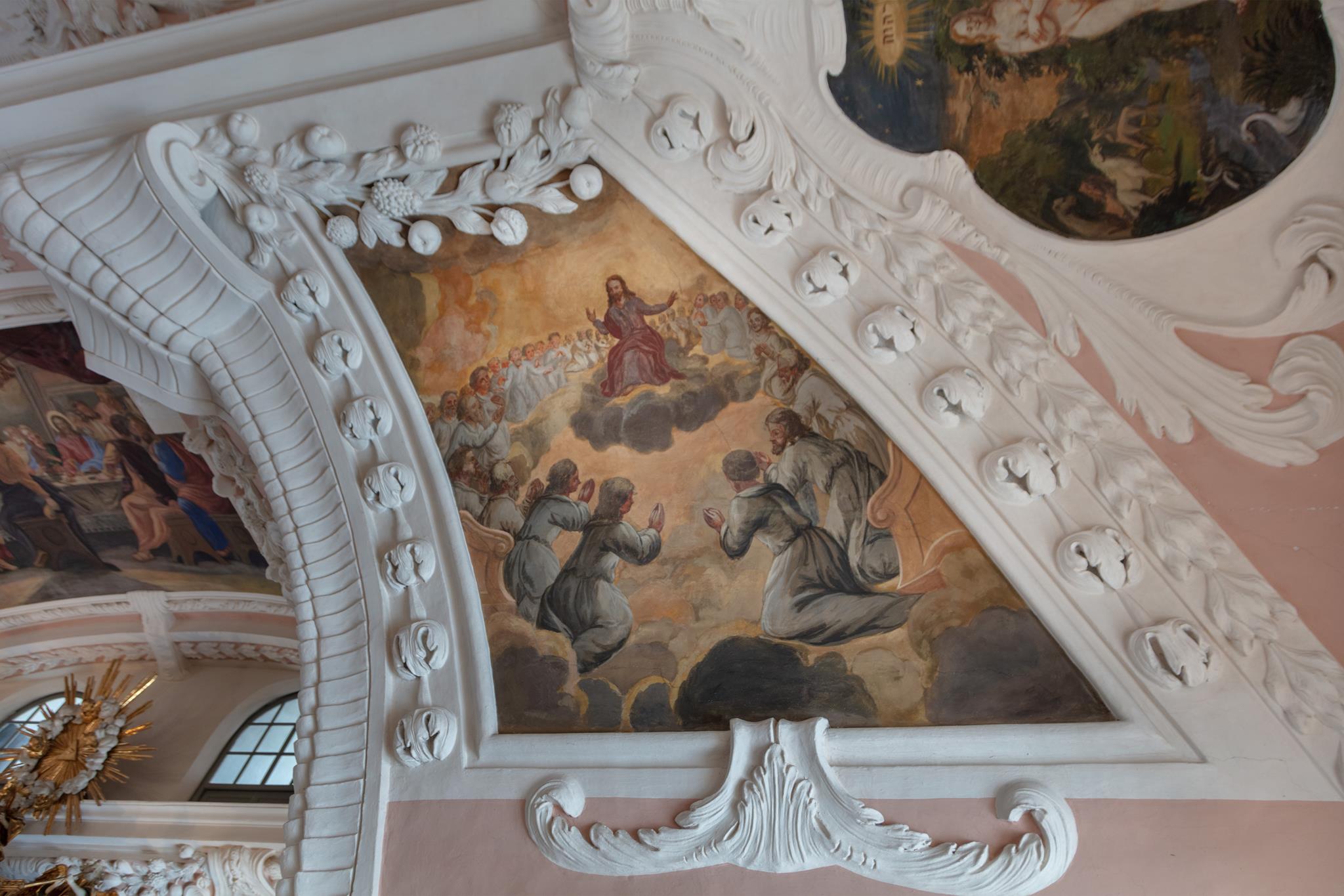 Vom Hauptportal im Westen geht man auf den Taufstein aus Marmor zu, der in der Mitte des Raumes steht. Die kostbare Abdeckung, eine Holzschnitzarbeit von Elias Räntz, ist unter der Woche in der Sakristei verwahrt. Oben an der Decke stellt das zentrale Gemälde ebenfalls die Taufe dar. Vorne über dem Altar ist das letzte Abendmahl Jesu mit seinen Jüngern zu sehen. Alle Flächen sind mit Szenen aus dem Alten und Neuen Testament bemalt. Die Bilderfülle passt sich in den Stuck des Hofstuckateurs Bernardo Quadri ein: kräftige Ornamente mit vielen Blumen.
