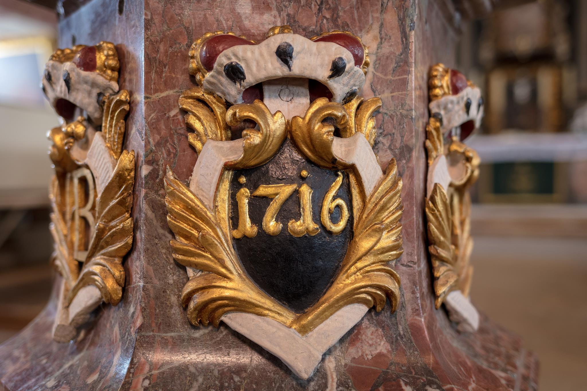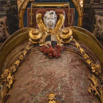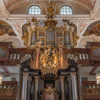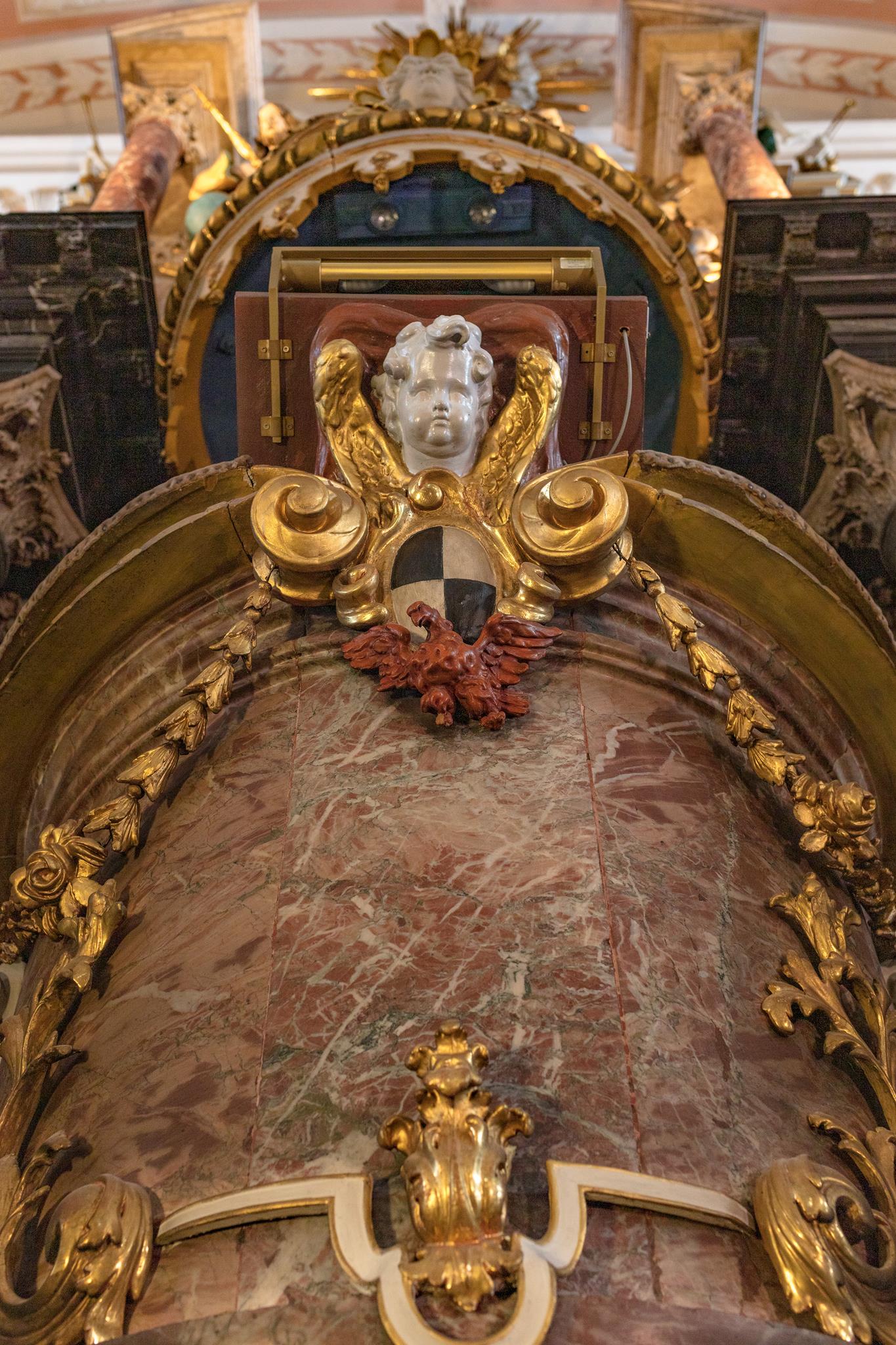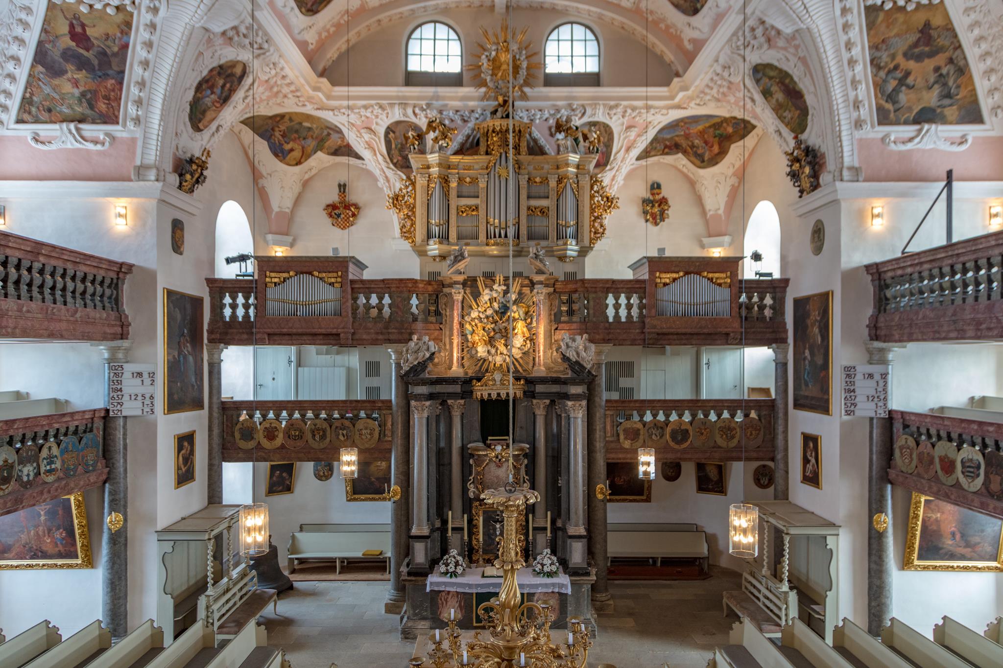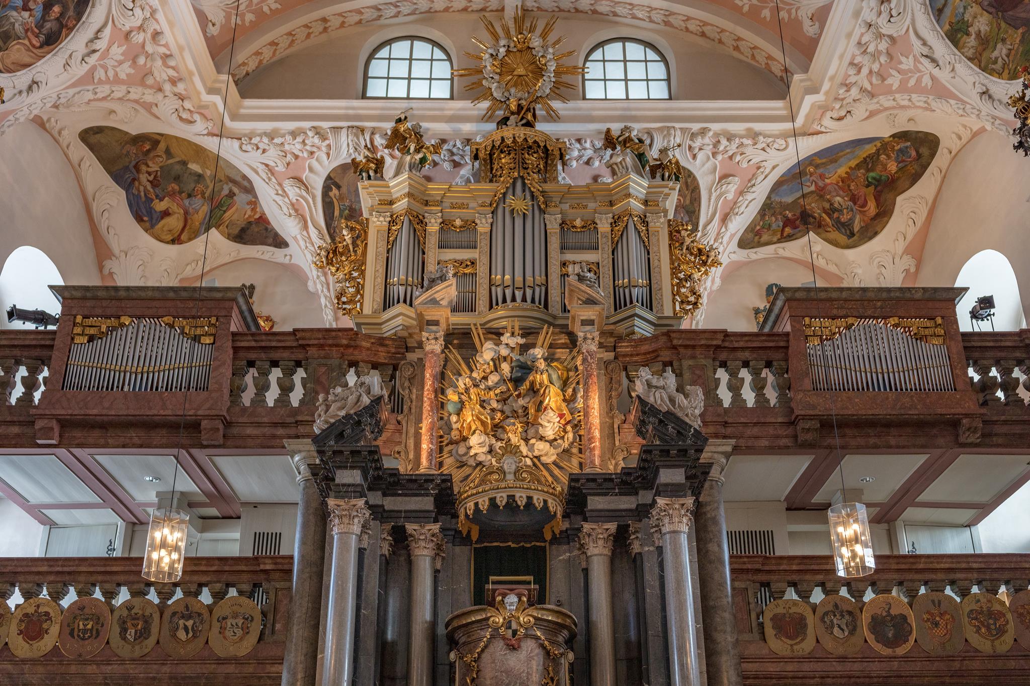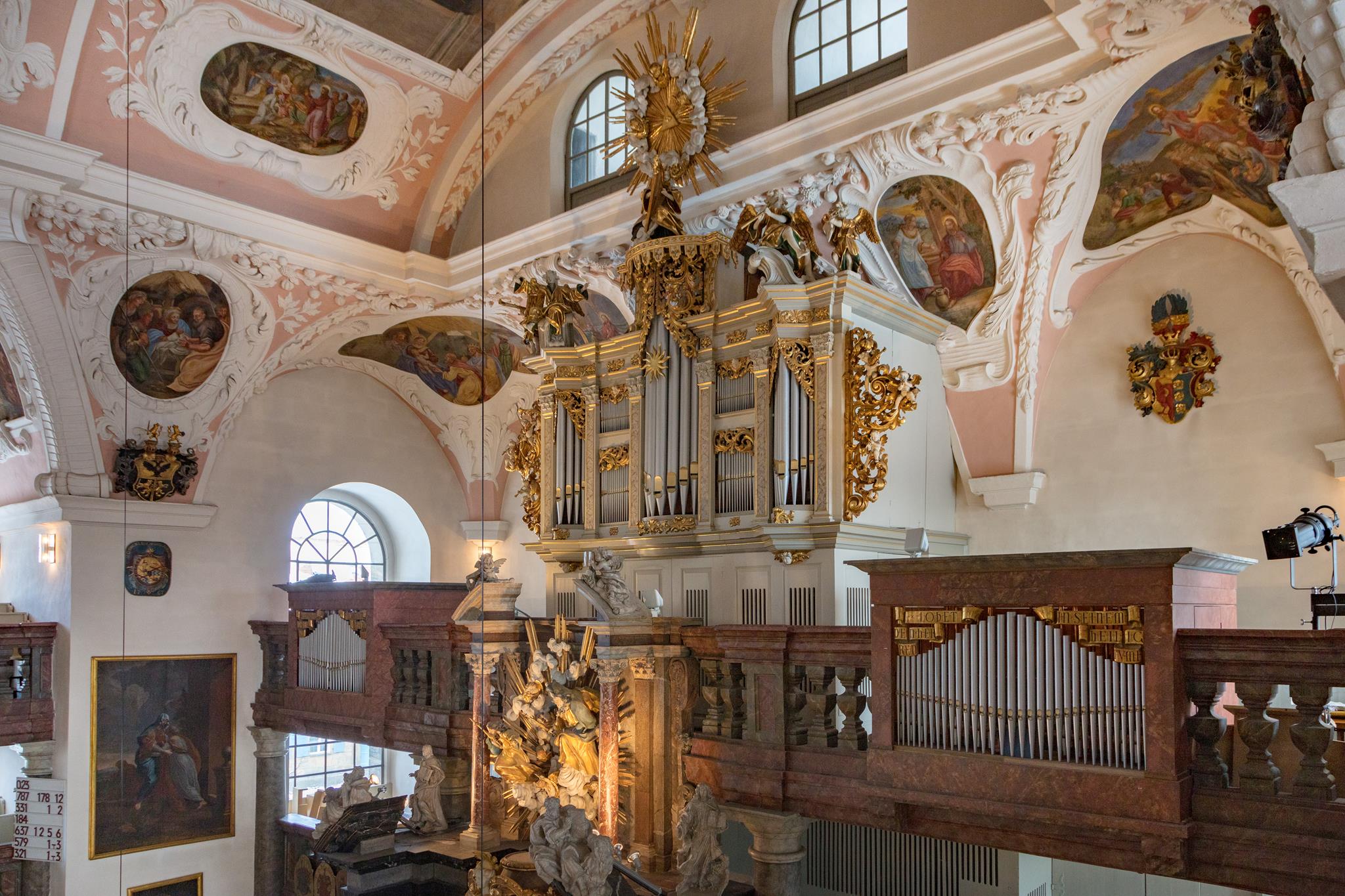 Auch der Kanzelaltar und das Gehäuse darüber stammen vom Hofbildhauer Räntz. Über der Kanzel thronen Gott Vater und Sohn, über der Orgel glänzt das goldene Dreieck, beide umgeben vom leuchtenden Strahlenkranz. Ihren heutigen Namen hat die Kirche von den Wappen der Adeligen, die zum „Orden der Aufrichtigen“ gehörten und ihre Wappenschilder an den Emporen anbringen durften.