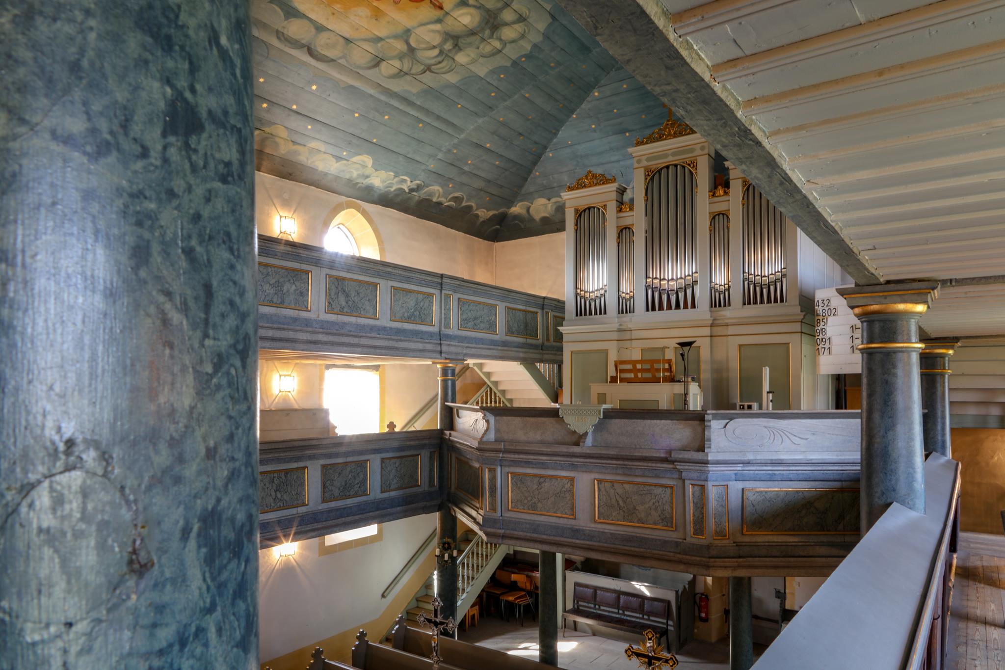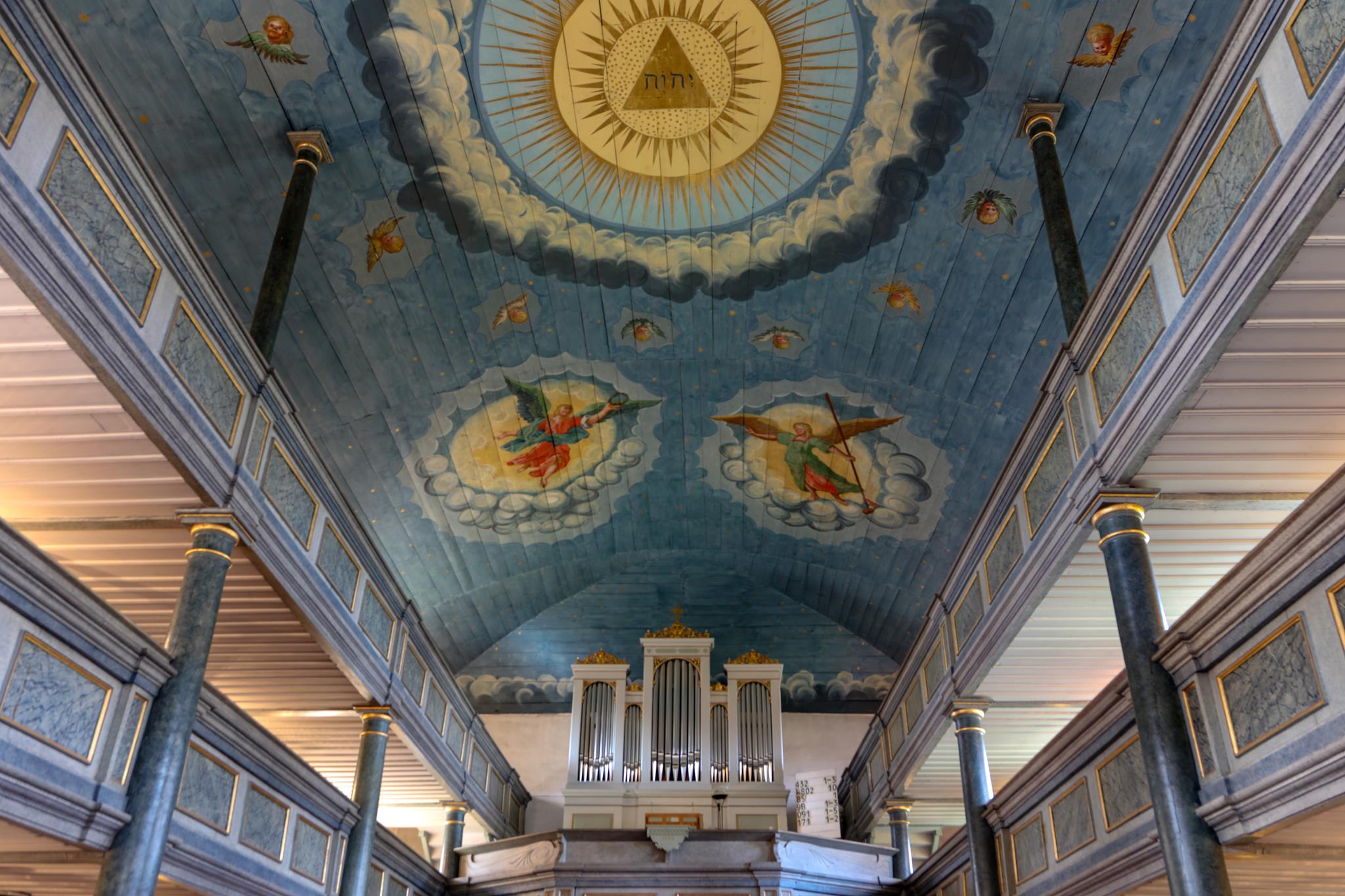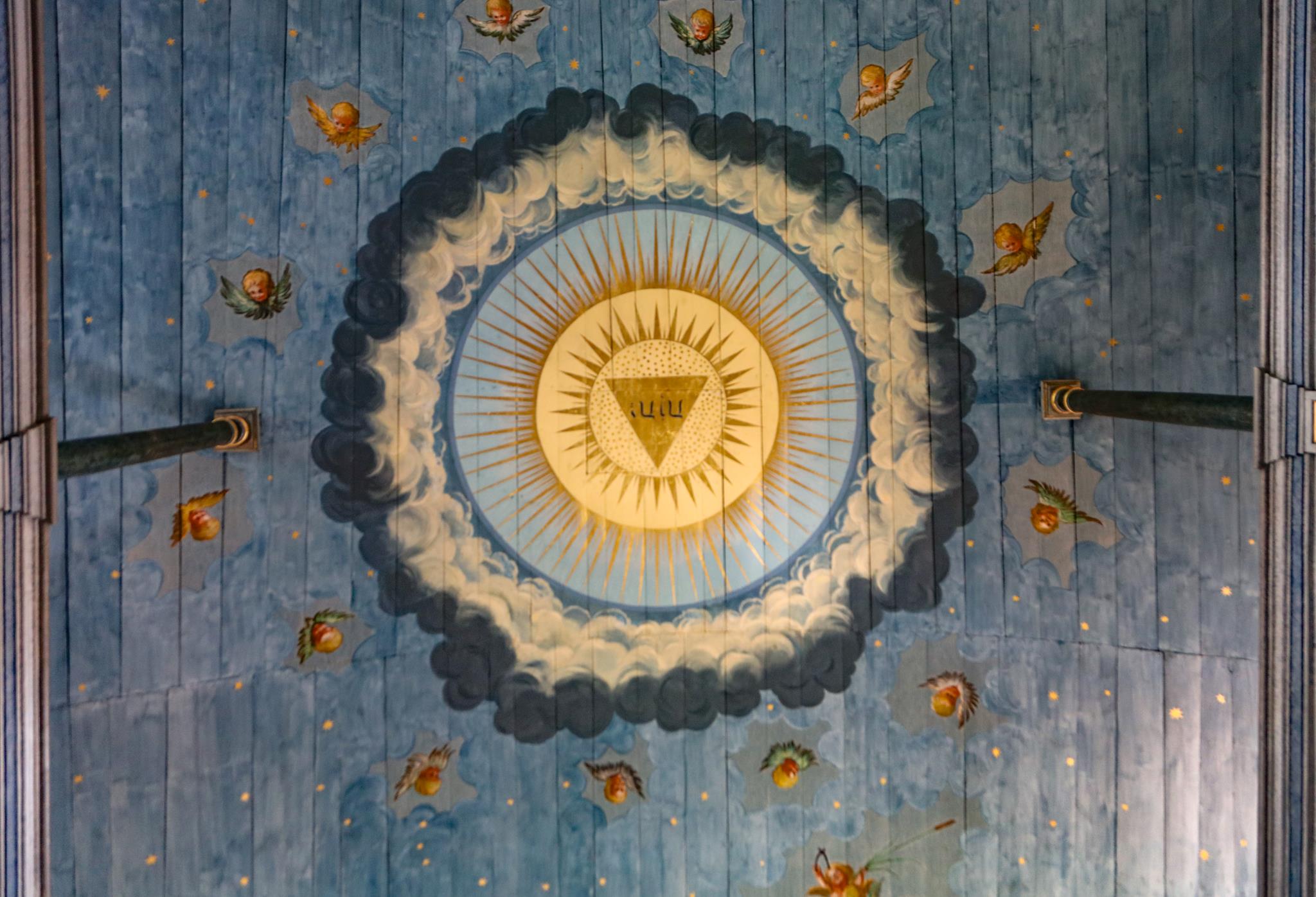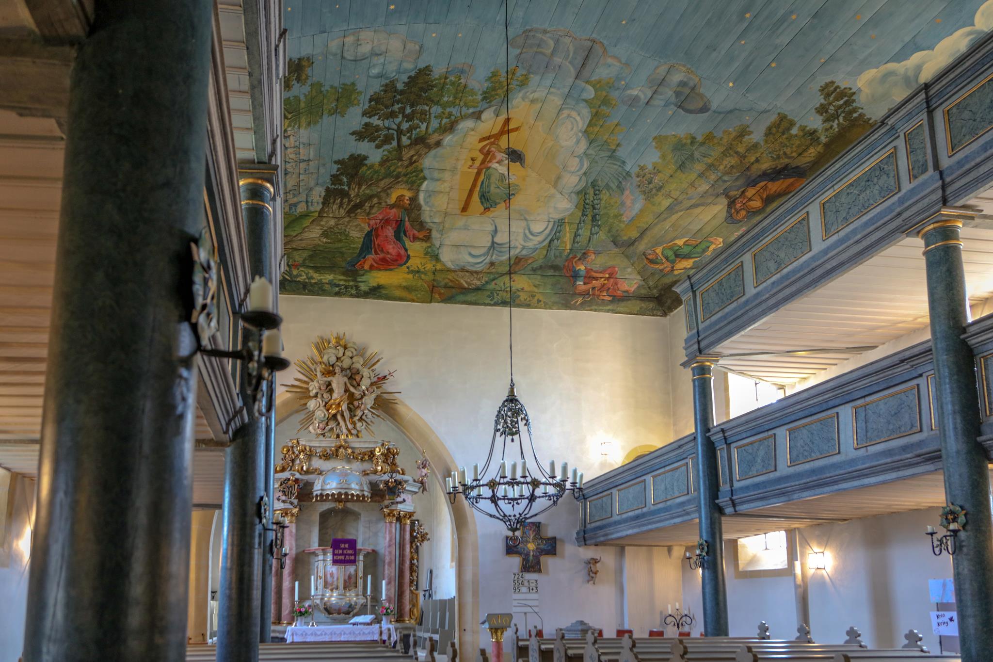 Im Inneren der stattlichen Kirche überwältigt das blaue, mit funkelnden Sternen besetzte Himmelsgewölbe, das Hofmaler Friedrich Müller im Jahr 1780 auf das Tonnengewölbe gemalt hat. In der Mitte leuchtet der Strahlenkranz mit dem goldenen Dreieck und dem Gottesnamen „Jahwe“ in einem Ring von Wolken, umgeben von dreizehn (!) Engeln. Zwei große und kleinere Artgenossen auf Wolken sitzend zeigen die Leidenswerkzeuge Christi und erfreuen sich an den Zeichen der Erlösung. An der Chorwand erscheint ein Engel im hellen Licht und reicht Jesus im Garten Gethsemane den Kelch, während die Jünger schlafen.