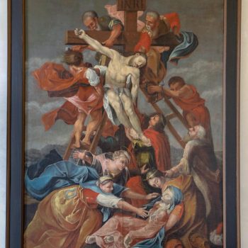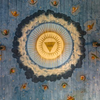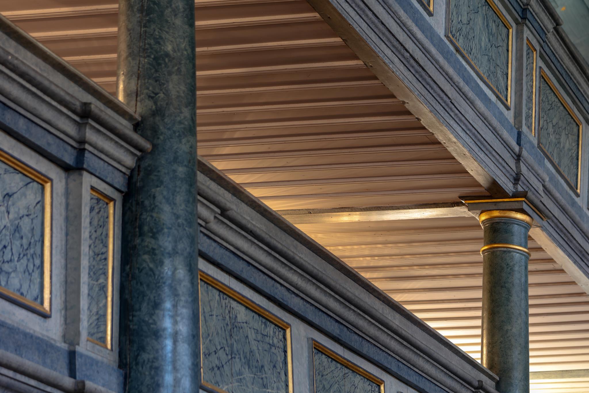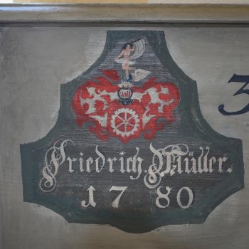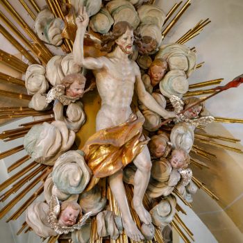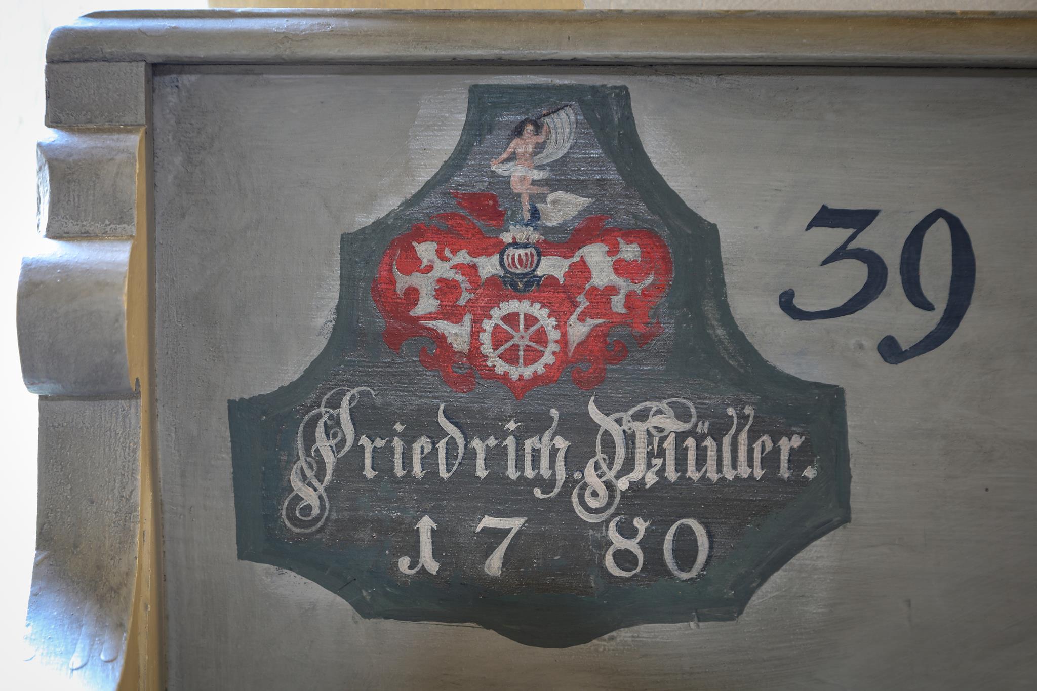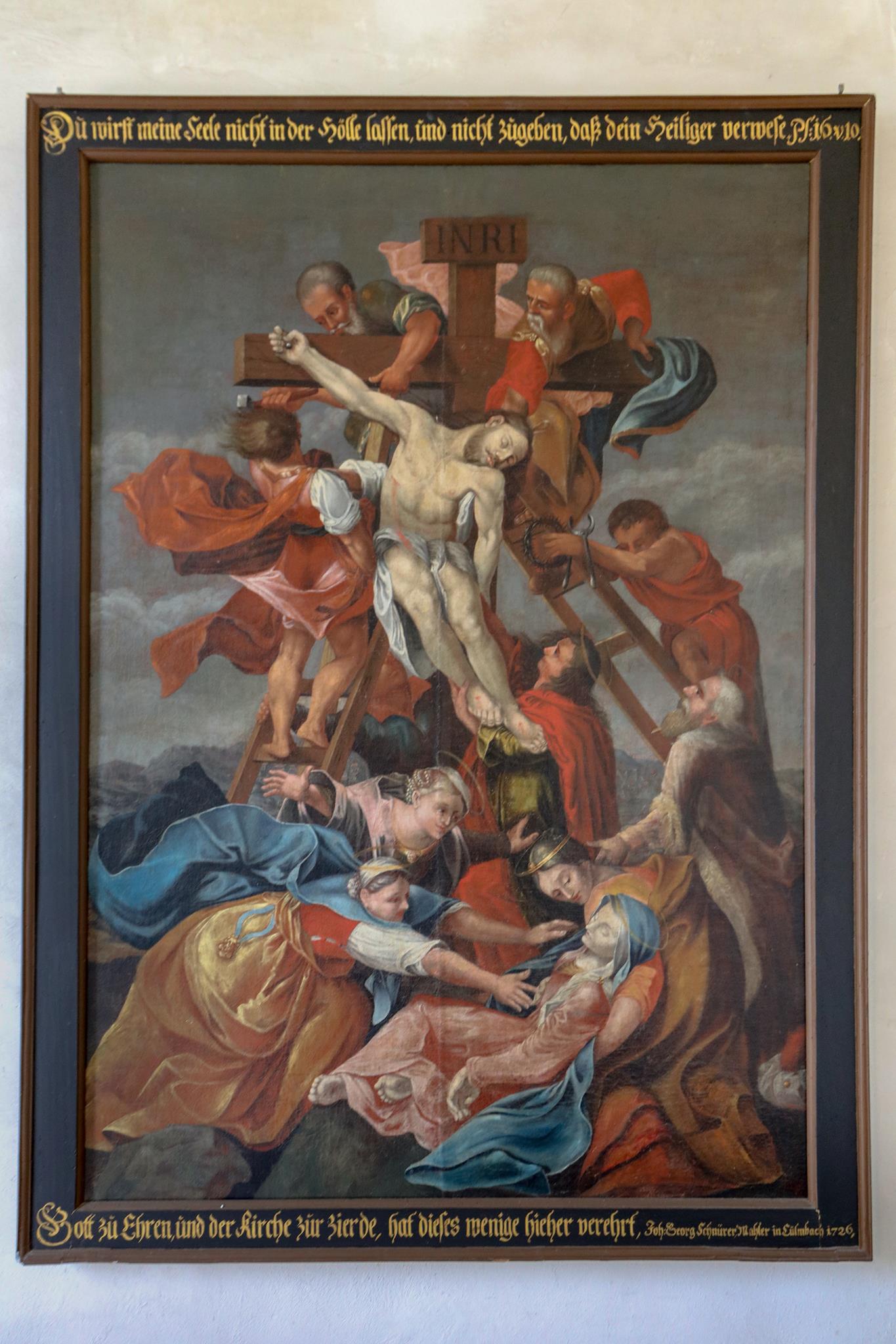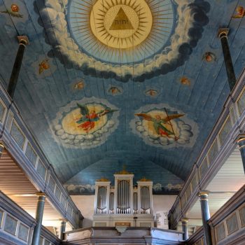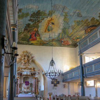 Im Inneren der stattlichen Kirche überwältigt das blaue, mit funkelnden Sternen besetzte Himmelsgewölbe, das Hofmaler Friedrich Müller im Jahr 1780 auf das Tonnengewölbe gemalt hat. In der Mitte leuchtet der Strahlenkranz mit dem goldenen Dreieck und dem Gottesnamen „Jahwe“ in einem Ring von Wolken, umgeben von dreizehn (!) Engeln. Zwei große und kleinere Artgenossen auf Wolken sitzend zeigen die Leidenswerkzeuge Christi und erfreuen sich an den Zeichen der Erlösung. An der Chorwand erscheint ein Engel im hellen Licht und reicht Jesus im Garten Gethsemane den Kelch, während die Jünger schlafen.