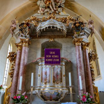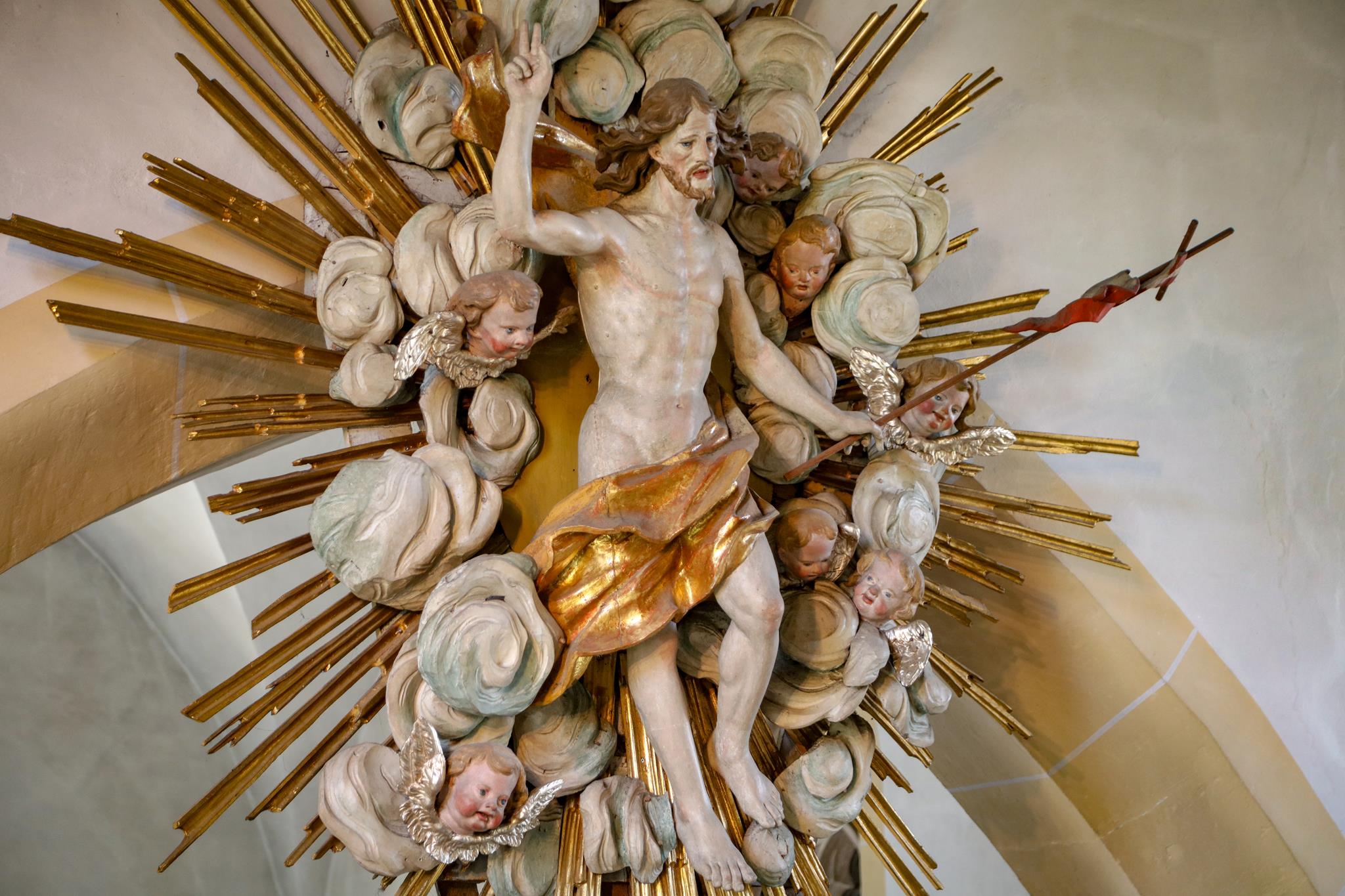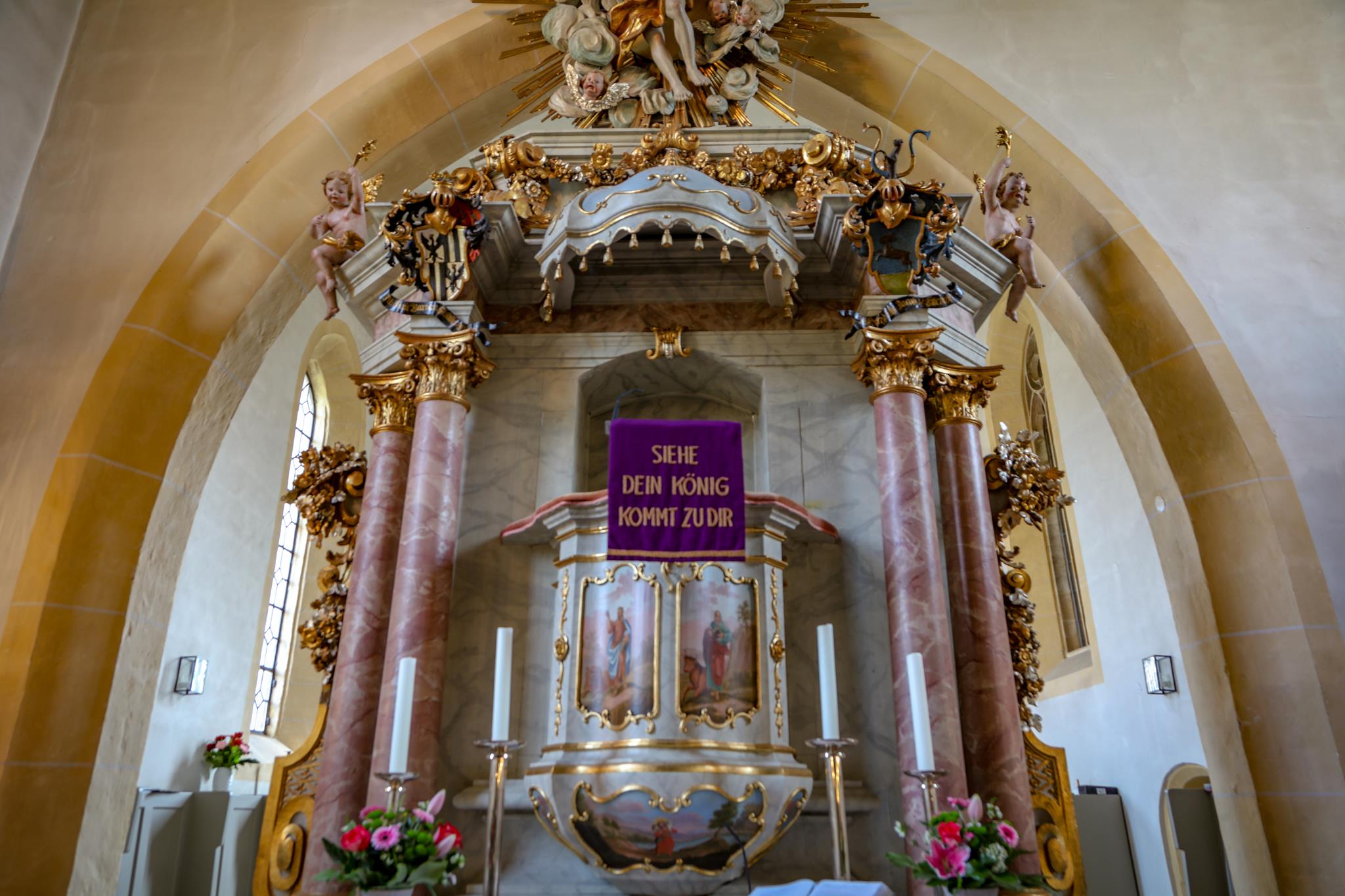 Darunter fällt der seitlich versetzte Altar auf. Dahinter befindet sich der ehemalige Chorraum. Er geht auf eine Marienkapelle zurück, im Mittelalter ein beliebter Wallfahrtsort. Als die Kirche nach dem Hussitensturm (1430) wieder aufgebaut und vergrößert wurde (1491), sparte man sich die teuren Fundamente im Talgrund und baute in den Hang hinein. Nach der erneuten Zerstörung im bundesständigen Krieg (1553) dauerte es bis 1720, bis die Kirche auf Initiative des rebellischen Magister Goldner erneuert werden konnte. Der Altar mit dem auferstandenen Christus stammt aus der Werkstatt von Elias Räntz, die Kanzel wurde später eingebaut, so dass der typische Kanzelaltar entstand. Der schlichte Taufstein aus Sandstein rechts daneben birgt eine wertvolle Zinnschale, aus dem gleichen Jahr wie der archaische Opferstock (1720). Eine Kuriosität stellt die Christusdarstellung auf der unteren nördlichen Empore dar: der Oberkörper ragt über dem Fußboden heraus, die untere Teil wurde beim Einbau der Empore zerstört.