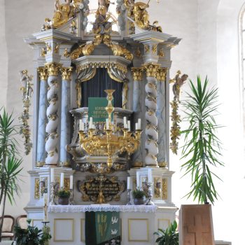 Am Taufstein sind die verschiedenen Bauzeiten der Kirche zu erkennen. Der Sandsteinfuß aus dem 12. Jhd. stammt vom ersten Kirchenbau. Das Becken mit den Bildern des Stifterehepaars von 1647 erinnert an den Wiederaufbau nach der Zerstörung des Gotteshauses im Dreißigjährigen Krieg am 1. Februar 1633. Die Gebetsglocke läutet noch heute um 14 Uhr zum Gedenken. Der Taufsteindeckel zeigt die Taufe Jesu mit barocken Figuren.