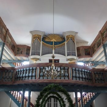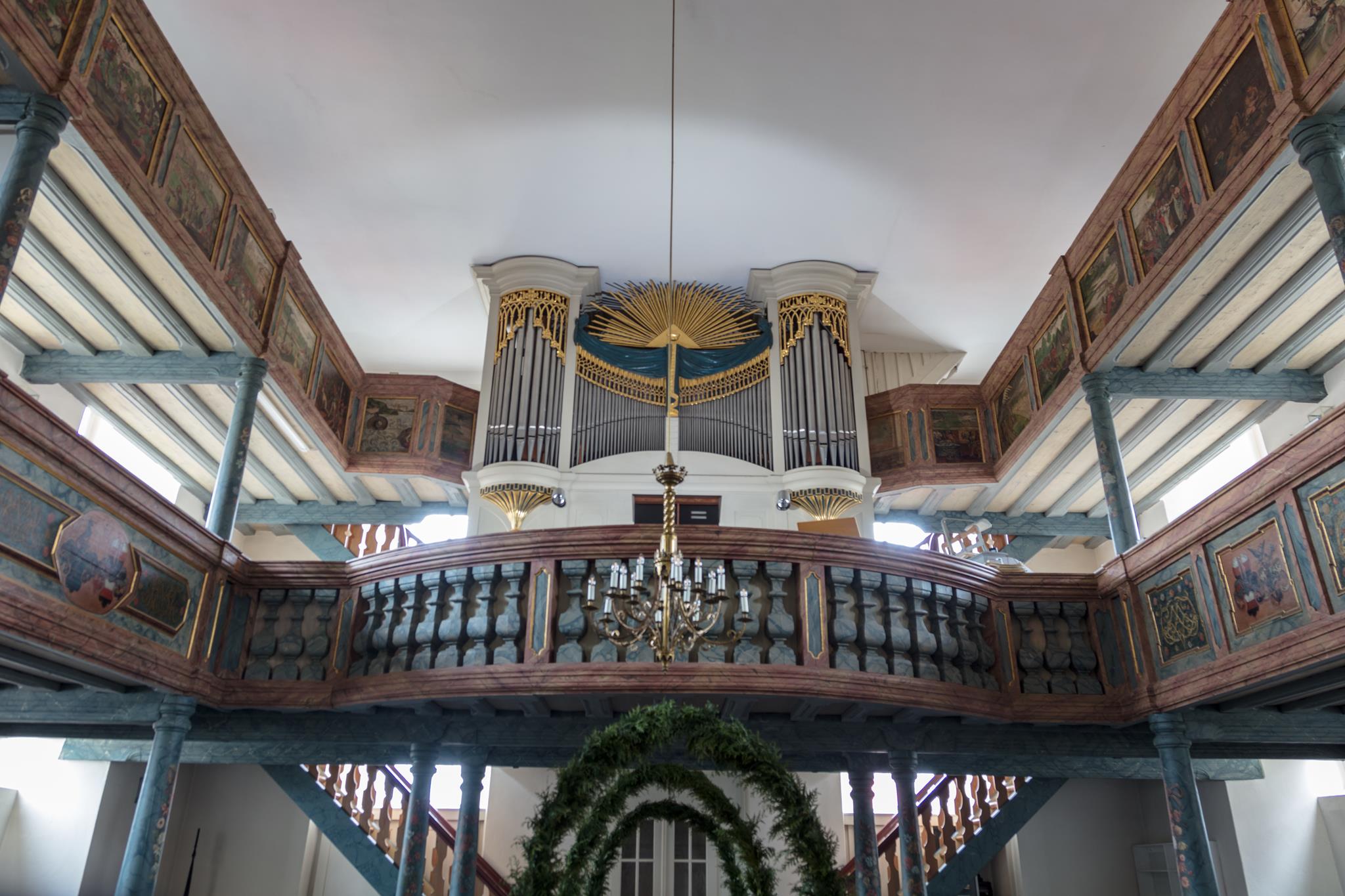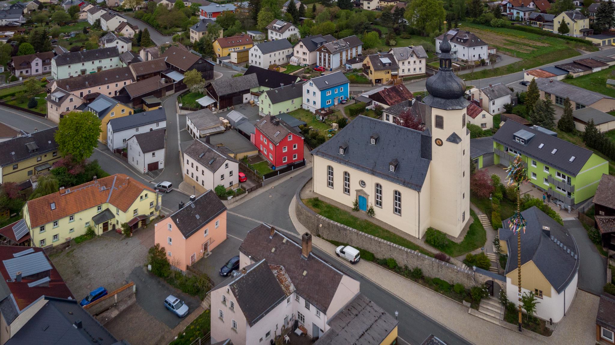 Als die einsturzgefährdete Vorgängerkirche vom Patronatsherren, der Stadt Hof, im Jahr 1747 endlich neu gebaut wurde, fügte man die Bilder aus der Hofer Malerwerkstatt Lohe rücksichtslos in die zweite Empore ein. Sie hatten vorher die Decke und die Empore geziert, wurden jetzt zurechtgeschnitten, teilweise sogar die Bretter vertauscht und die biblischen Szenen der Merianbibel durcheinander gebracht. Erhalten blieb das mit auffallenden goldenen Ornamenten verzierte Gehäuse der Orgel, in dem ursprünglich das Instrument der Firma Heidenreich aus der Silbermann-Schule untergebracht war. Die ehemalige Muttergemeinde in Hof-St. Lorenz hatte das Instrument bei der Kirchenrenovierung 1888/89 überlassen.