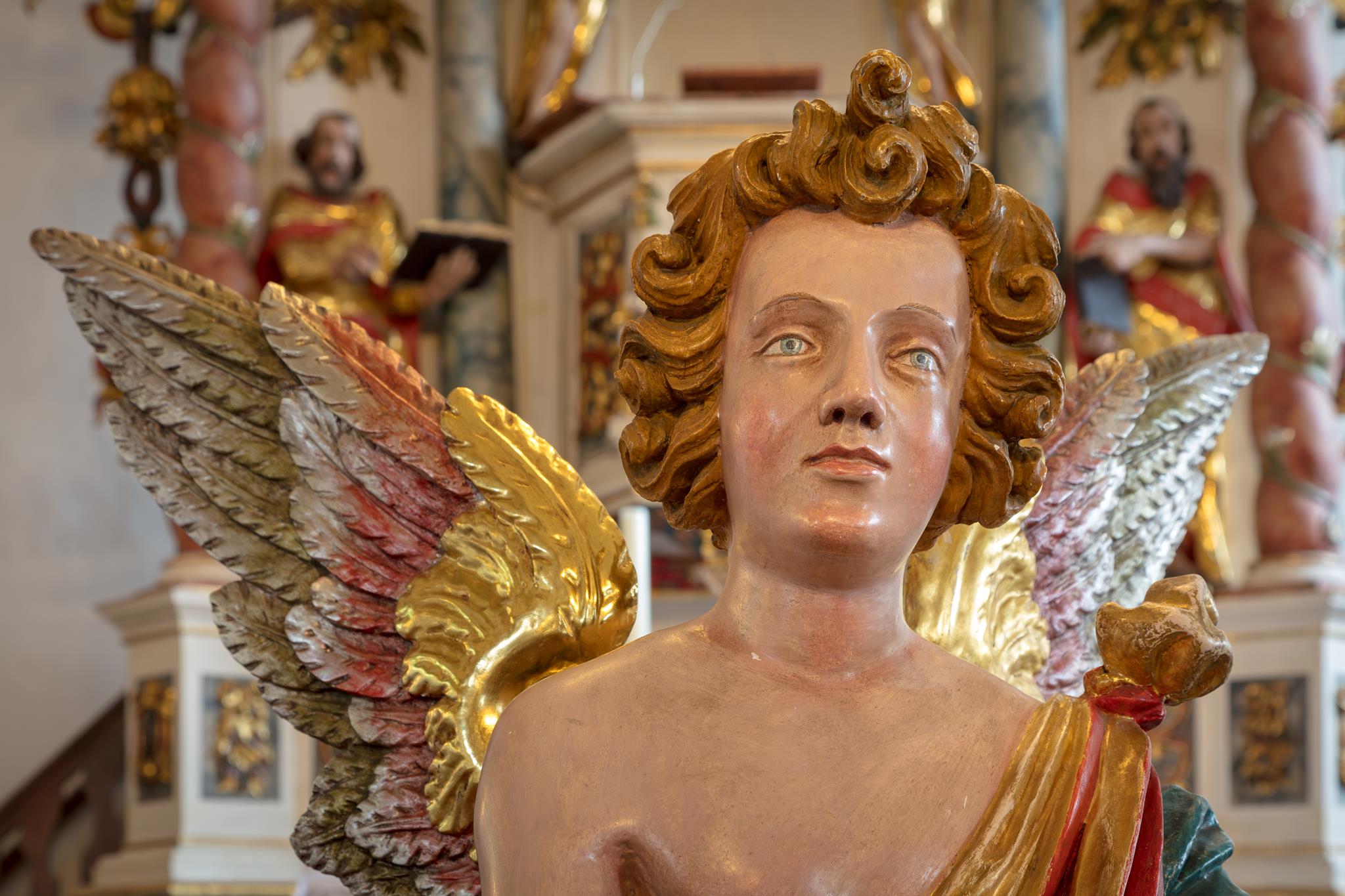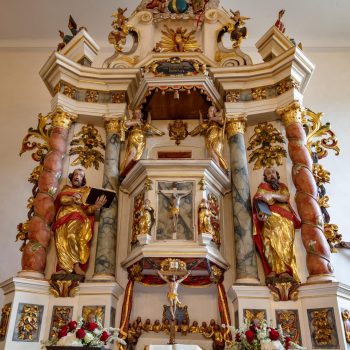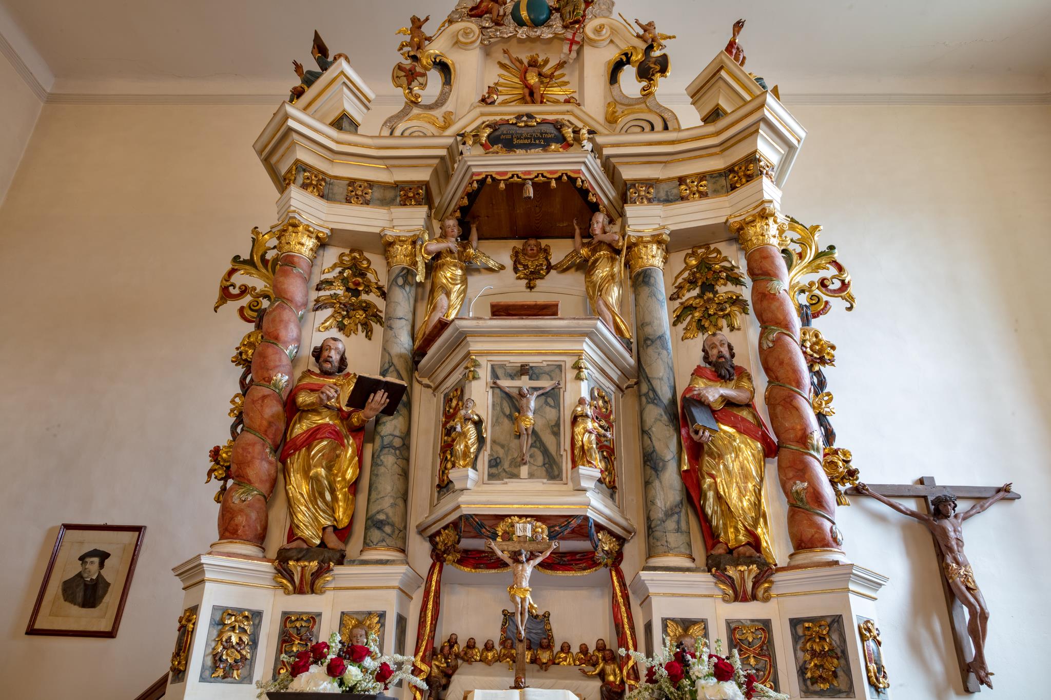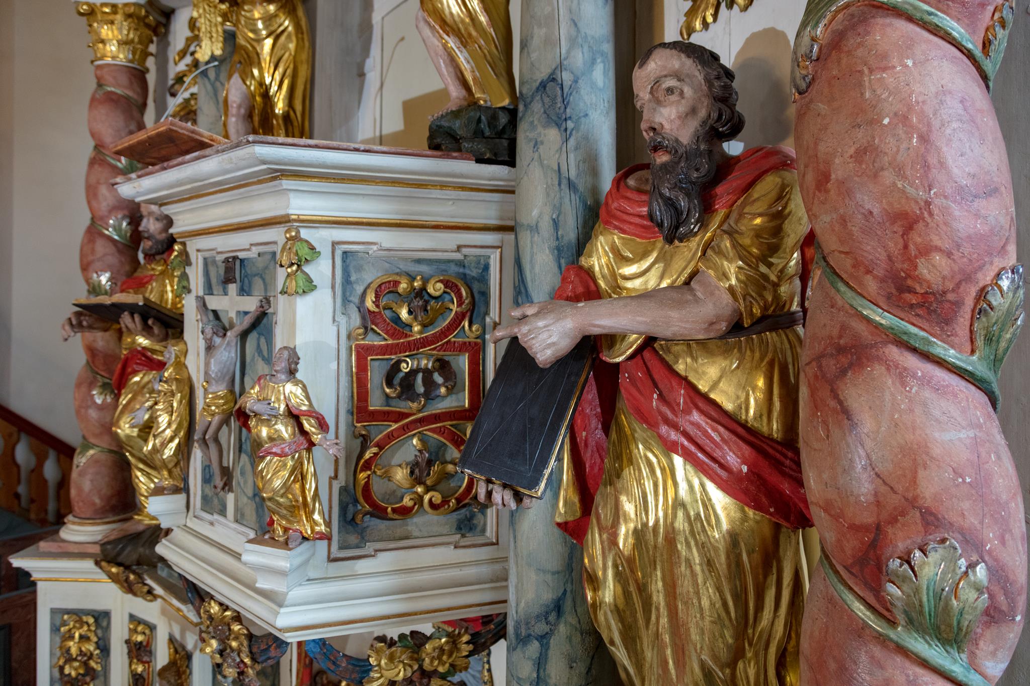 Rechts vom Altar hängt das wertvolle alte Kruzifix, das Peter Breuer aus Zwickau, ein Schüler Tilmann Riemenschneiders, um 1500 geschaffen hat. Unter der dicht geflochtenen Dornenkrone wirkt das Gesicht friedlich. Auf dem Tisch des Kanzelaltars steht das Altarkreuz. Beides hat Wolfgang Adam Knoll 1748/49 geschnitzt. Dahinter feiert Jesus mit seinen Jüngern in einem Festsaal das Letzte Abendmahl. In der Mitte des Kanzelkorbes zeigt die Kreuzigungsszene, dass das „Wort vom Kreuz“ im Zentrum evangelischen Predigt steht. Selbst der Strahlenkranz ganz oben, der die Taube als Teil der Dreieinigkeit umgibt, hat Kreuzform. Und der Auferstandene darunter trägt auf der Siegesfahne das Kreuzeszeichen. Der Taufengel von Knoll mit dem bunten Kleid und den großen goldenen Flügeln trägt die Taufschale in Händen. Sie hat die Form des Lorbeerkranzes, der als Siegeszeichen denen verheißen ist, die in Leid und Not treu am Glauben festhalten. Wie andernorts wurde der Engel zur Taufe an einem Seil von der Decke herabgelassen.