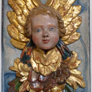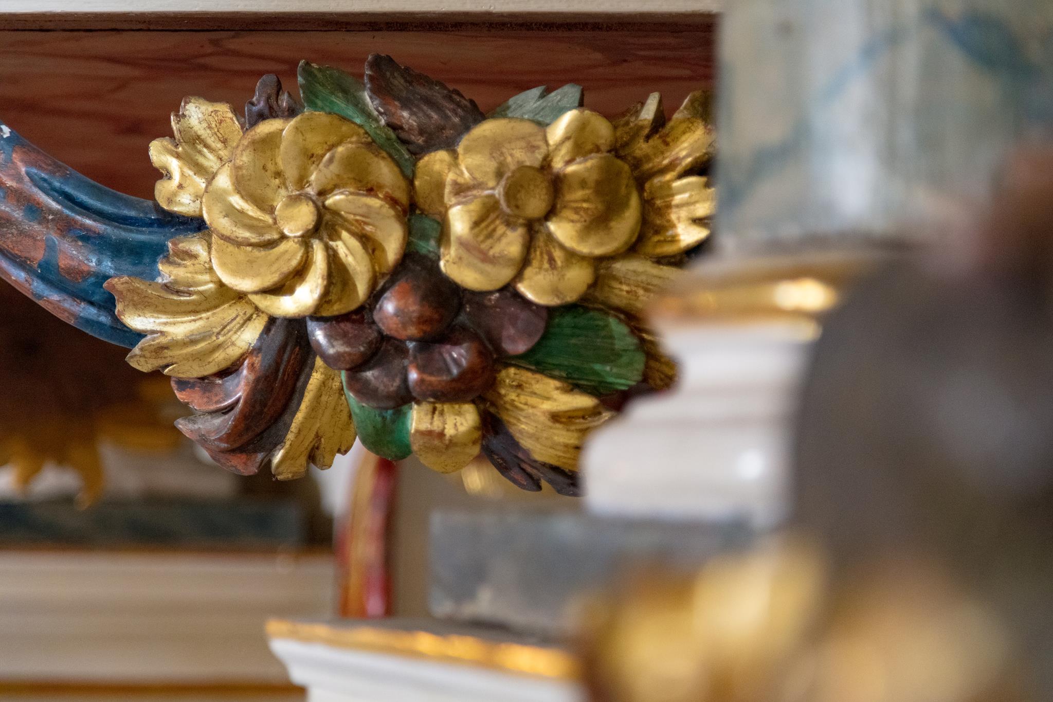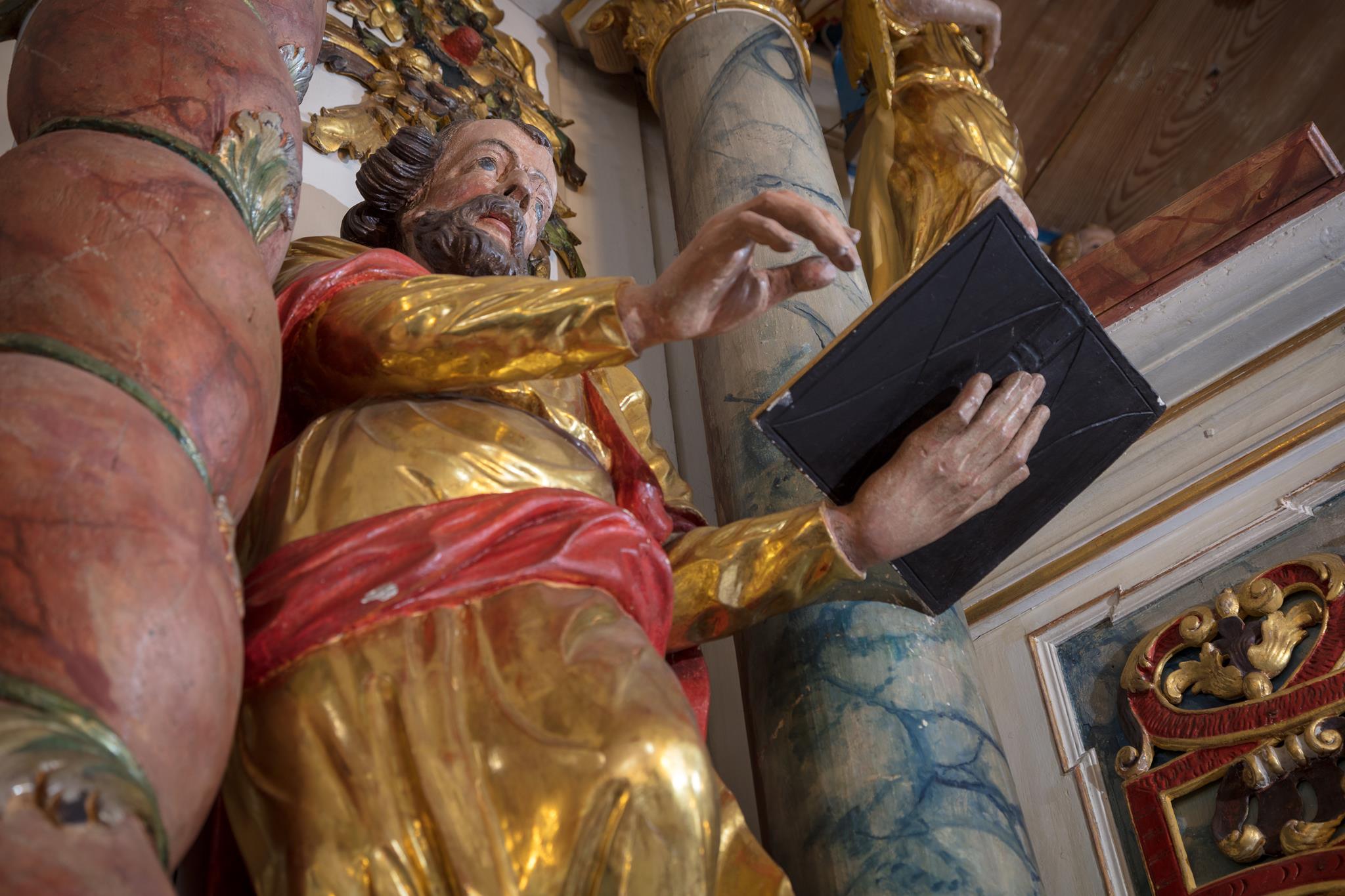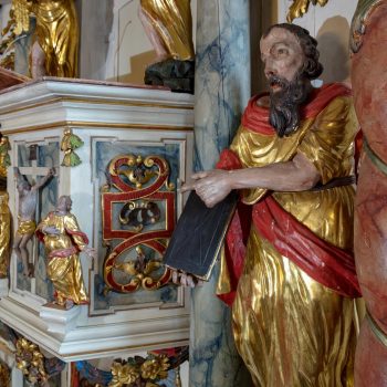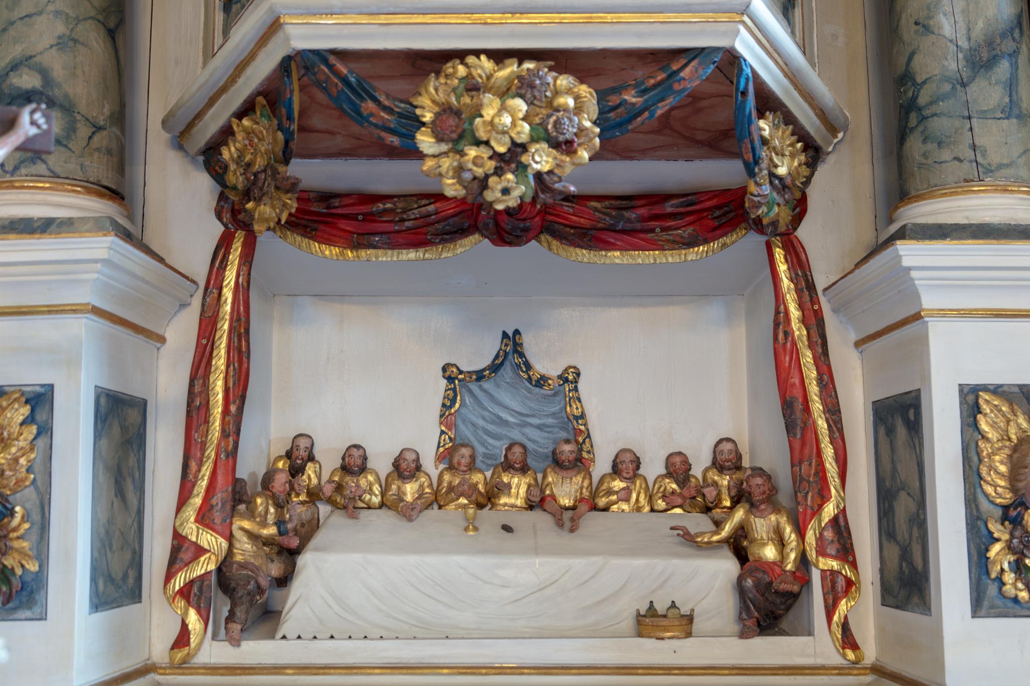 Rechts vom Altar hängt das wertvolle alte Kruzifix, das Peter Breuer aus Zwickau, ein Schüler Tilmann Riemenschneiders, um 1500 geschaffen hat. Unter der dicht geflochtenen Dornenkrone wirkt das Gesicht friedlich. Auf dem Tisch des Kanzelaltars steht das Altarkreuz. Beides hat Wolfgang Adam Knoll 1748/49 geschnitzt. Dahinter feiert Jesus mit seinen Jüngern in einem Festsaal das Letzte Abendmahl. In der Mitte des Kanzelkorbes zeigt die Kreuzigungsszene, dass das „Wort vom Kreuz“ im Zentrum evangelischen Predigt steht. Selbst der Strahlenkranz ganz oben, der die Taube als Teil der Dreieinigkeit umgibt, hat Kreuzform. Und der Auferstandene darunter trägt auf der Siegesfahne das Kreuzeszeichen. Der Taufengel von Knoll mit dem bunten Kleid und den großen goldenen Flügeln trägt die Taufschale in Händen. Sie hat die Form des Lorbeerkranzes, der als Siegeszeichen denen verheißen ist, die in Leid und Not treu am Glauben festhalten. Wie andernorts wurde der Engel zur Taufe an einem Seil von der Decke herabgelassen.